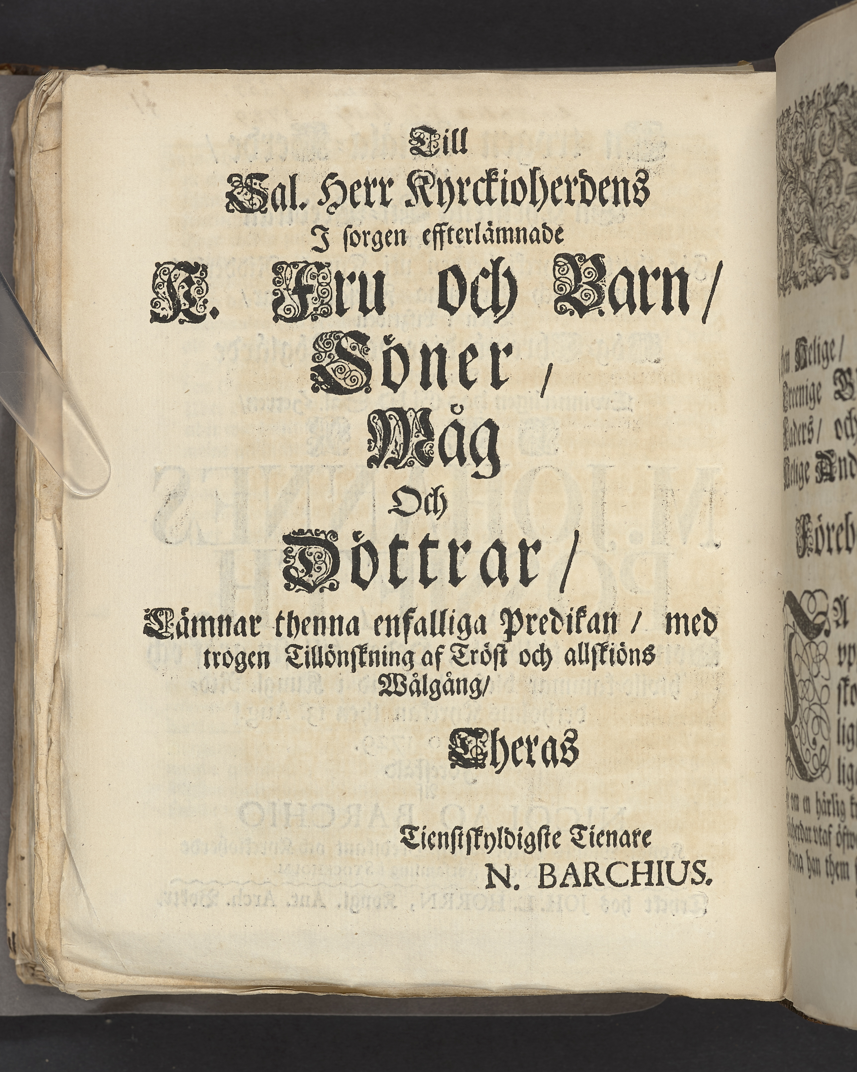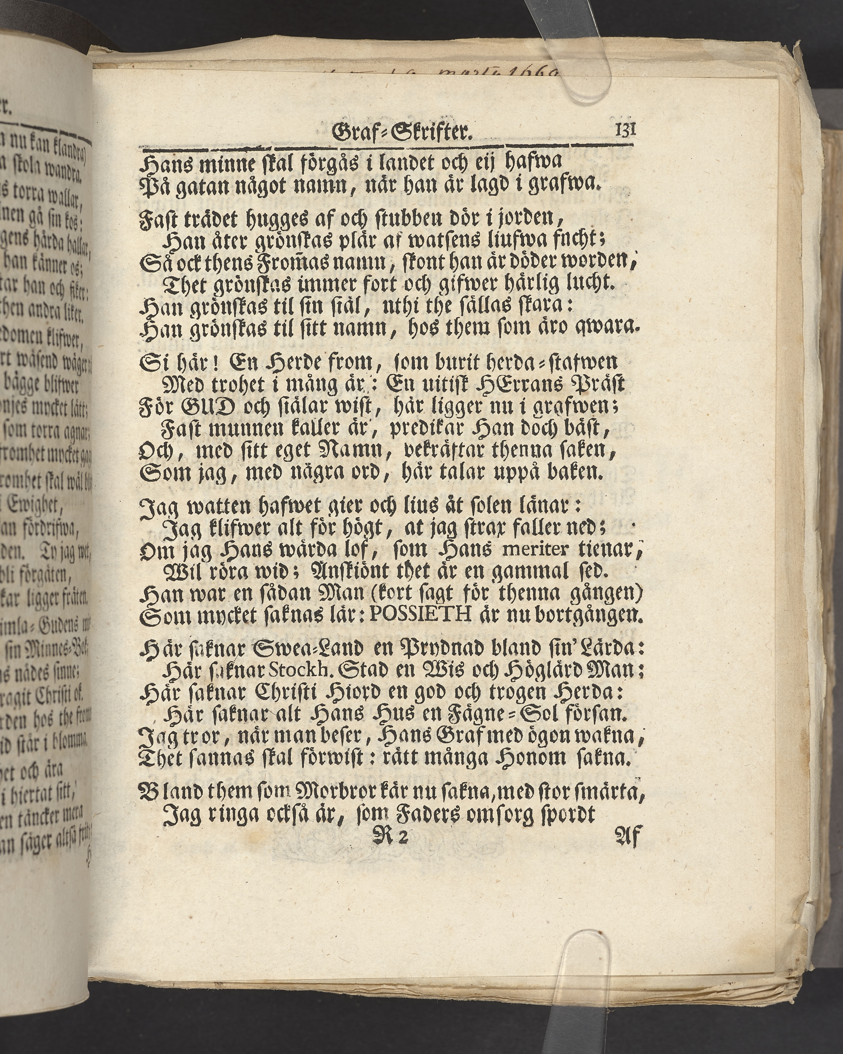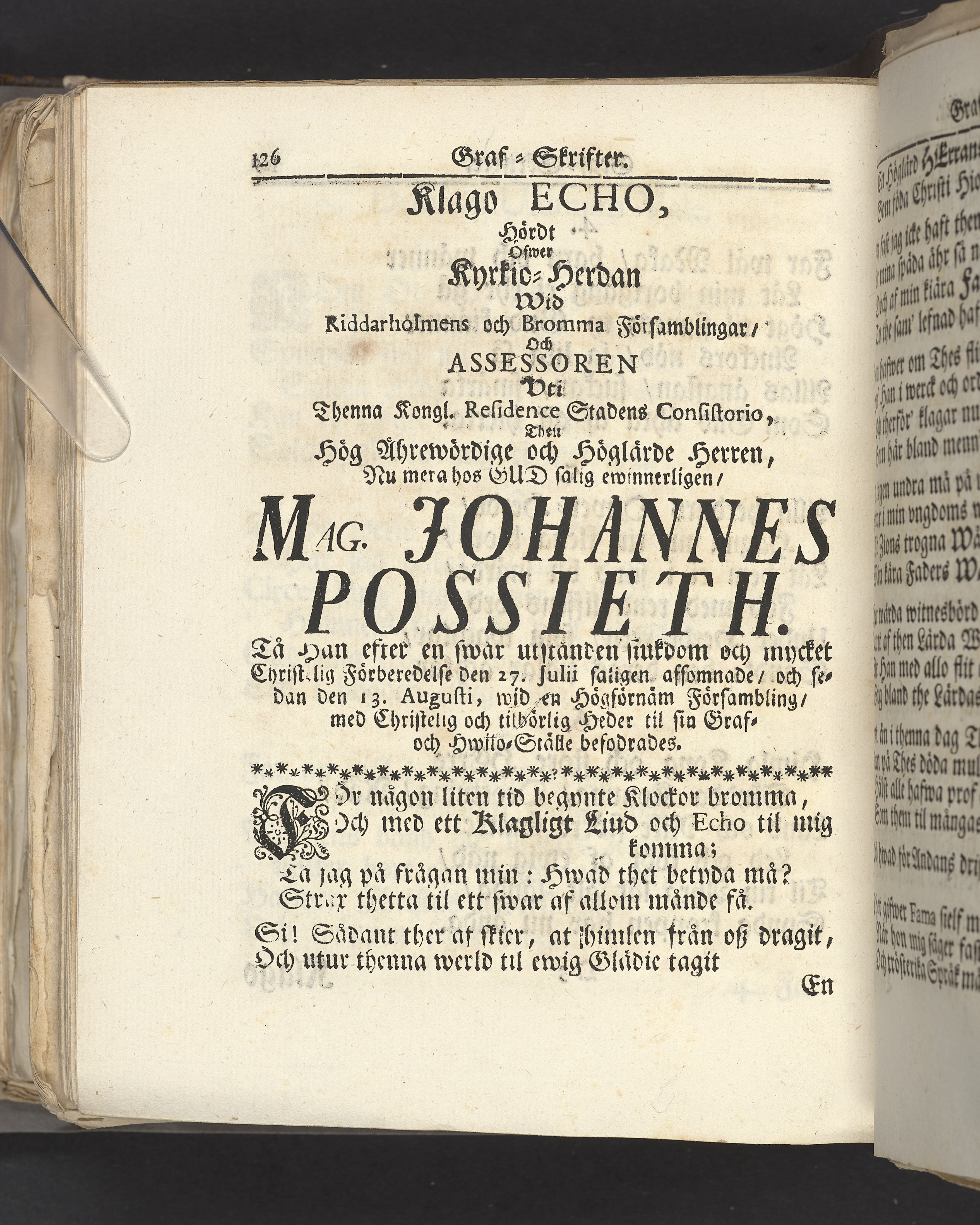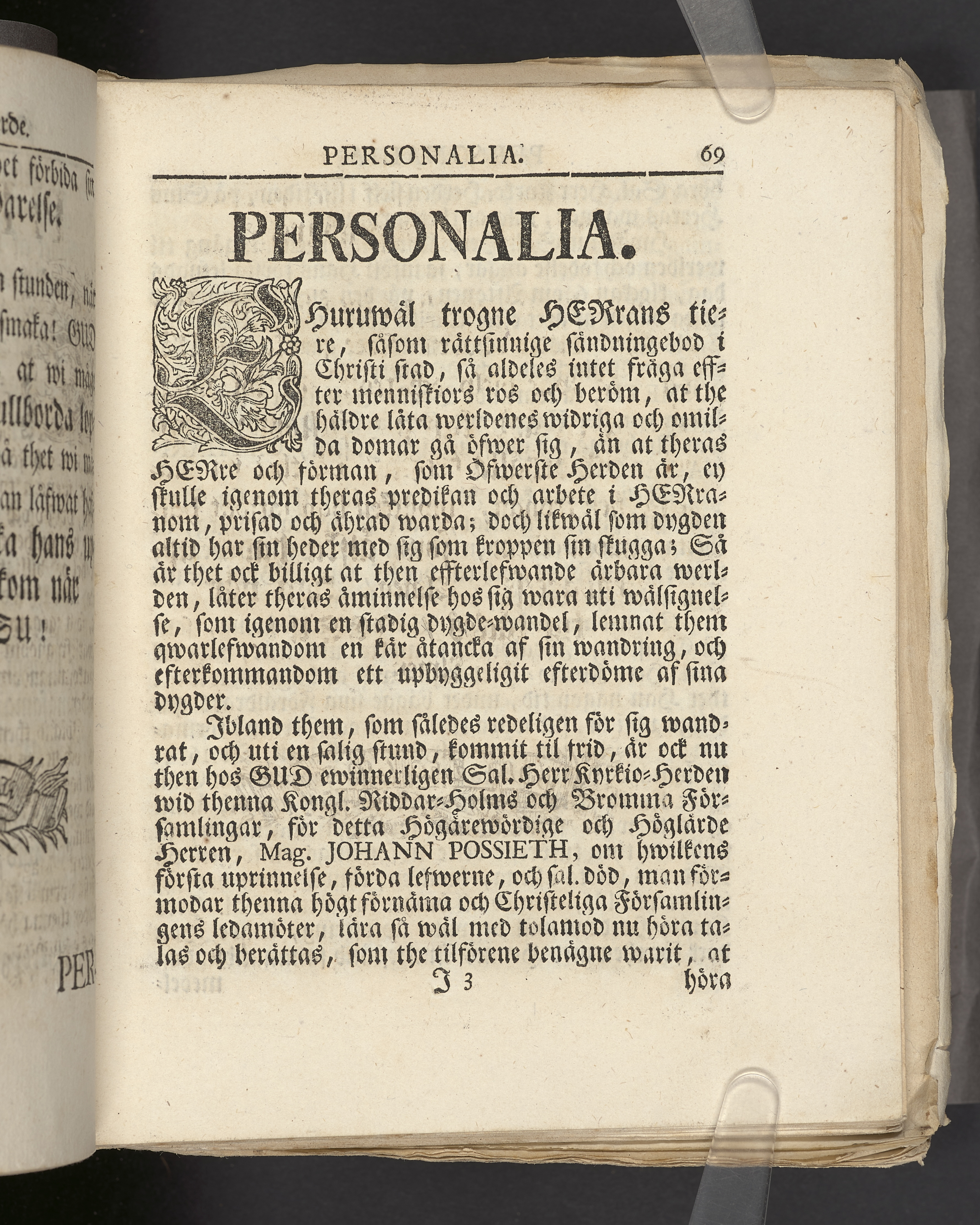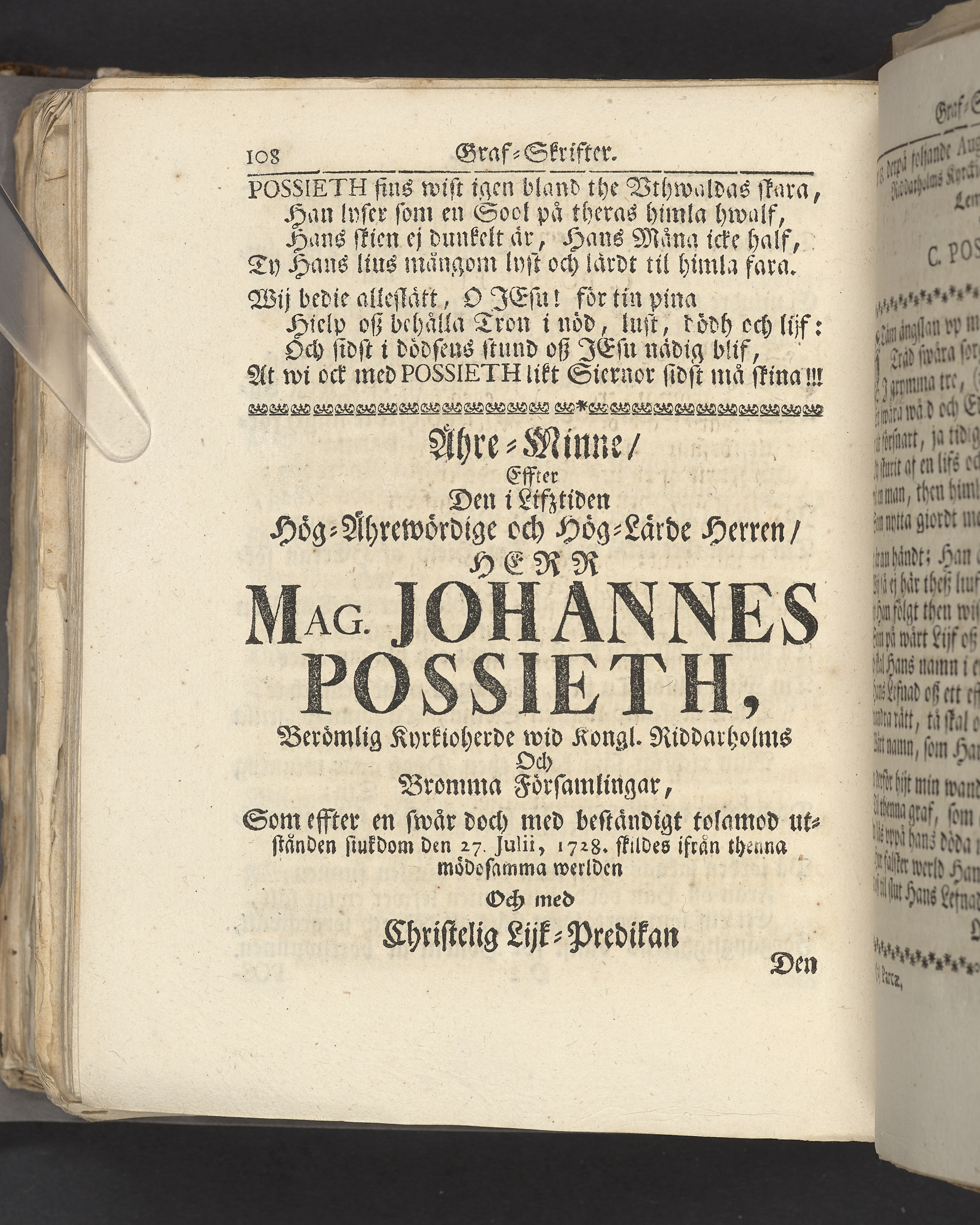 En trogen siäla-herde, uti en christelig lik-predikan öfwer för thetta kyrckioherden uti kungl. Ridderholmens och Bromma församlingar ... nu mehra ewinnerligen hos Gud sal. herren, herr M. Johannes Possieth, som med tillbörlig heder till sin graf och hwilo-kammar blef beledsagad i kungl. Ridderholms kyrckan then 13. aug. anno 1729. före stäld af Nicolao Barchio ... Tryckt hos Joh. L. Horrn, kongl. ant. arch. boktr.