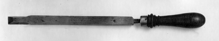 Slätstål med rak egg framtill och på sidorna. Klinga med rektangulärt tvärsnitt. Svarvat, profilerat kägelformigt skaft, dekorerat vid fästet med fyra vulster. Skaftet avslutas med en knopp. Fästet är skott med en mässingsring, dekorerad med två ringar. Mått: L: 417 mm, skaftl: 138 mm, största diam: 33,2 mm, egg b: 16,7 Stämpel: IK under krona, samt mm däröver P, proberstämpel?