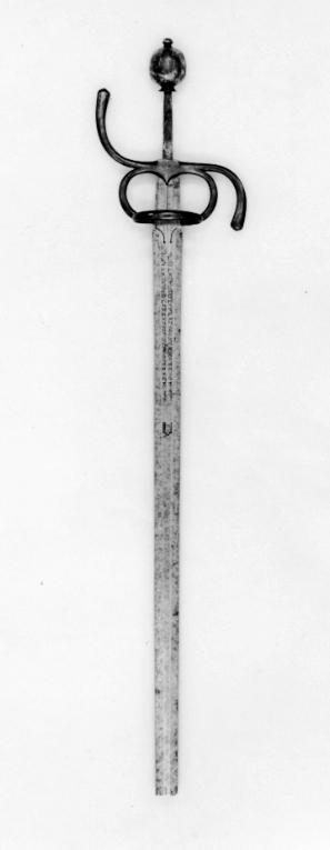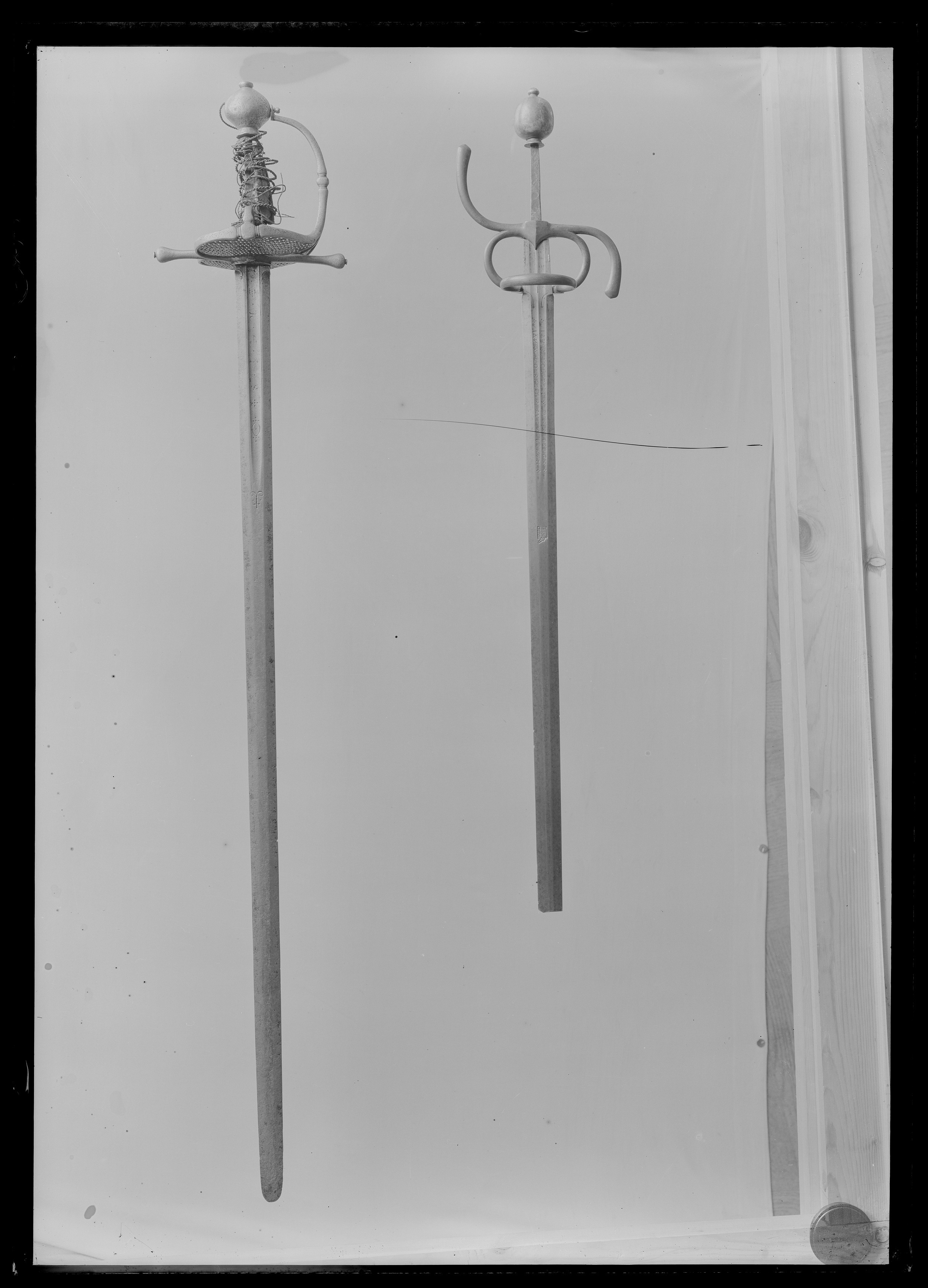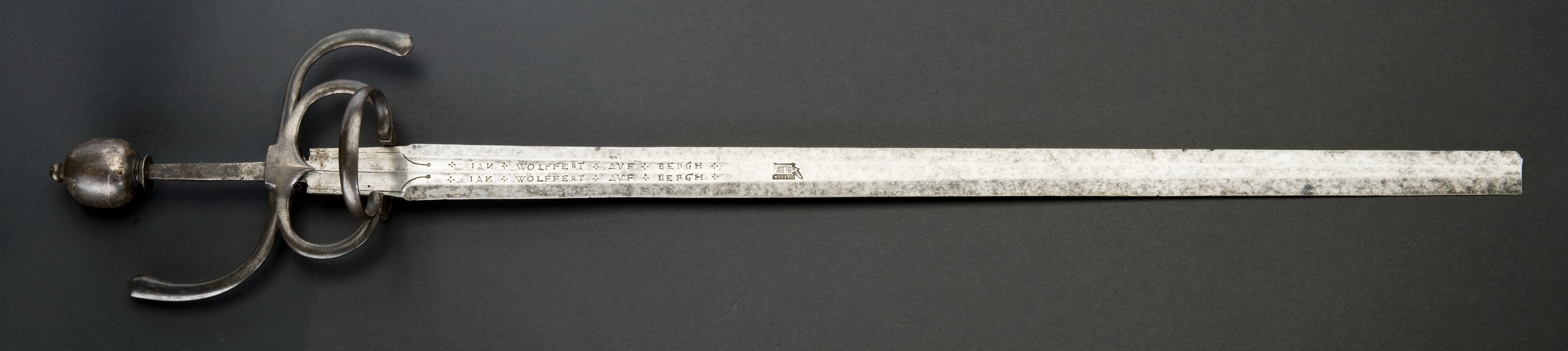 1 värja försilfradtfäste af jern, parérstången Sformig, knappen oval, något afplattad, klingan tveäggad med platt rygg, vid fästet 2:ne refflor, i hvilka finnes inslaget 2:ne gånger å båda sidor "Jan Wolffert auf Bergh", omgifvet af rosetter, smedsmärket en afbildning af domen i Köln med bokstäfverna C.O.L.S.D.O.M., klingan afbruten och kafveln borta.