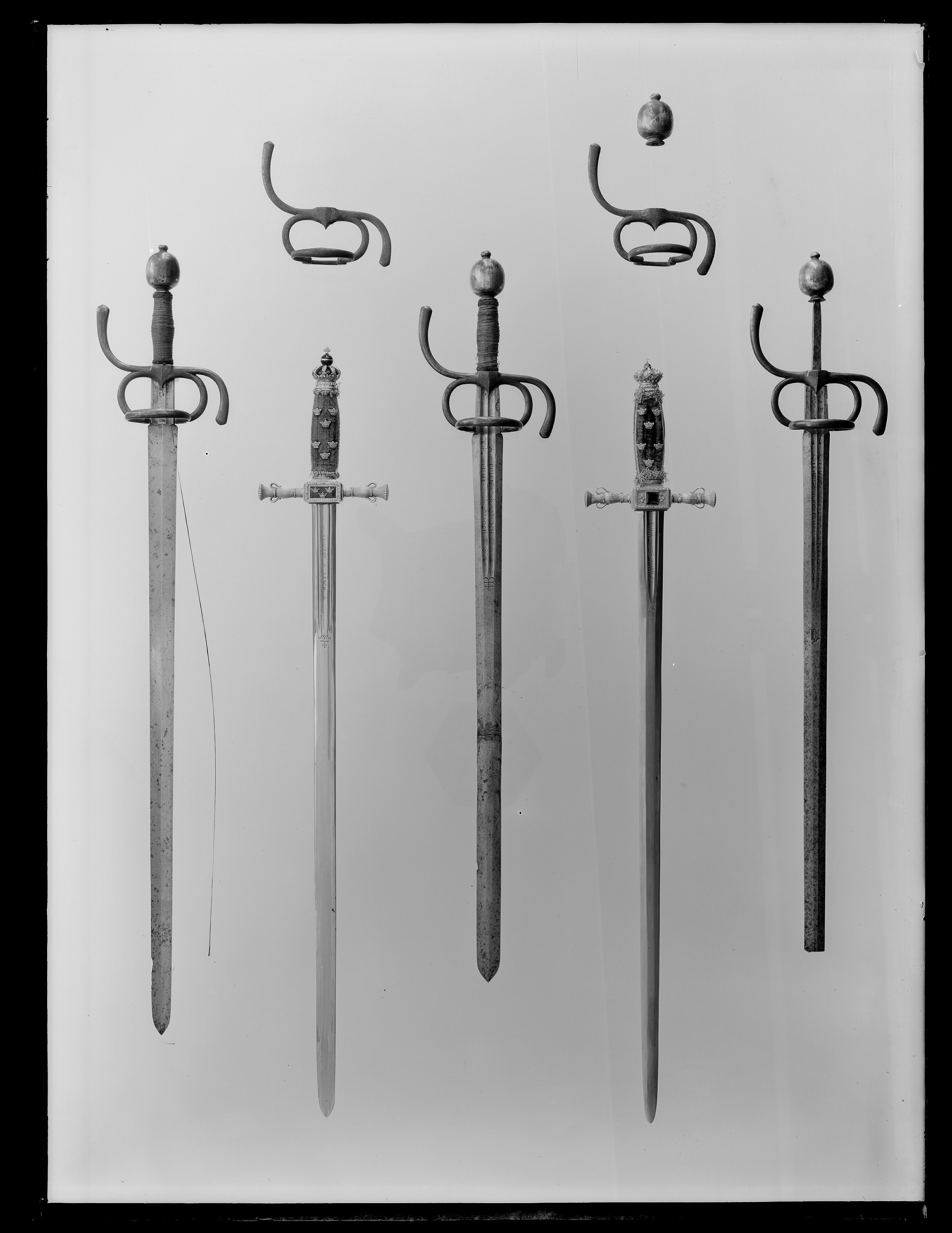 Njo stycken små Palatscher eller Värjor med försilfrade Fästen, Baljorne öfverdragne med rödt Sammet, hvaribland 1 st Värja utan Balja, och dessutom en Värja utan Dubbsko; de behållne Dubbskorne försilfrade; Vid alla Baljorne äro Kniffoder gjorde, dock inga Knifvar däruti; Handkaflarne är på större delen söndrige, Samma Värjor hafva Högstsalig Konung Gustaf Adolphs Pager brukat vid Högsbemälte Konungs Bröllops Act.