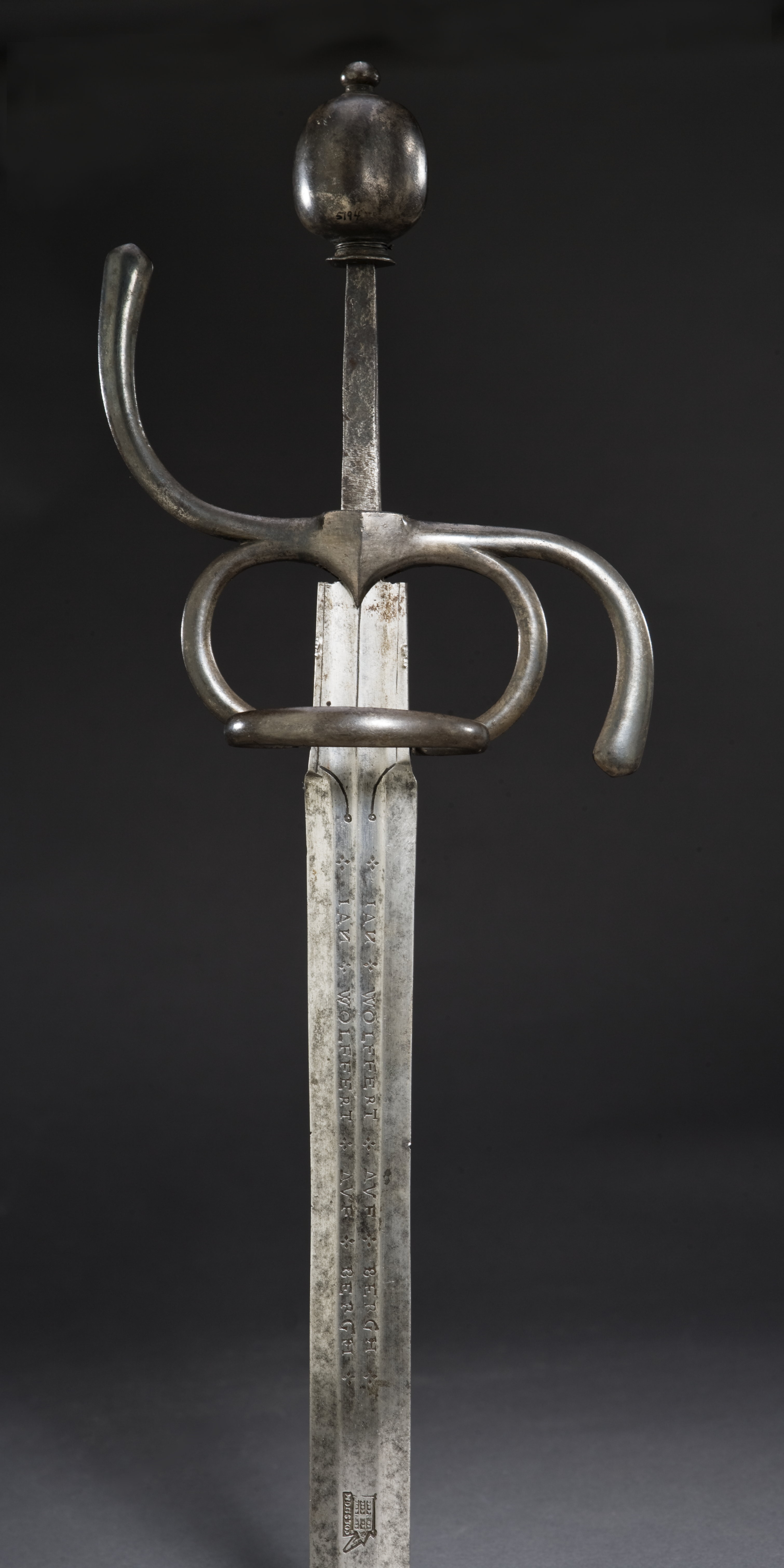 Pagevärja, tillverkad för drottning Maria Eleonoras pager vid bröllopet 1620, klinga av Jan Wolffer auf Bergh, Solingen, fäste Charles Dartené, Haag.