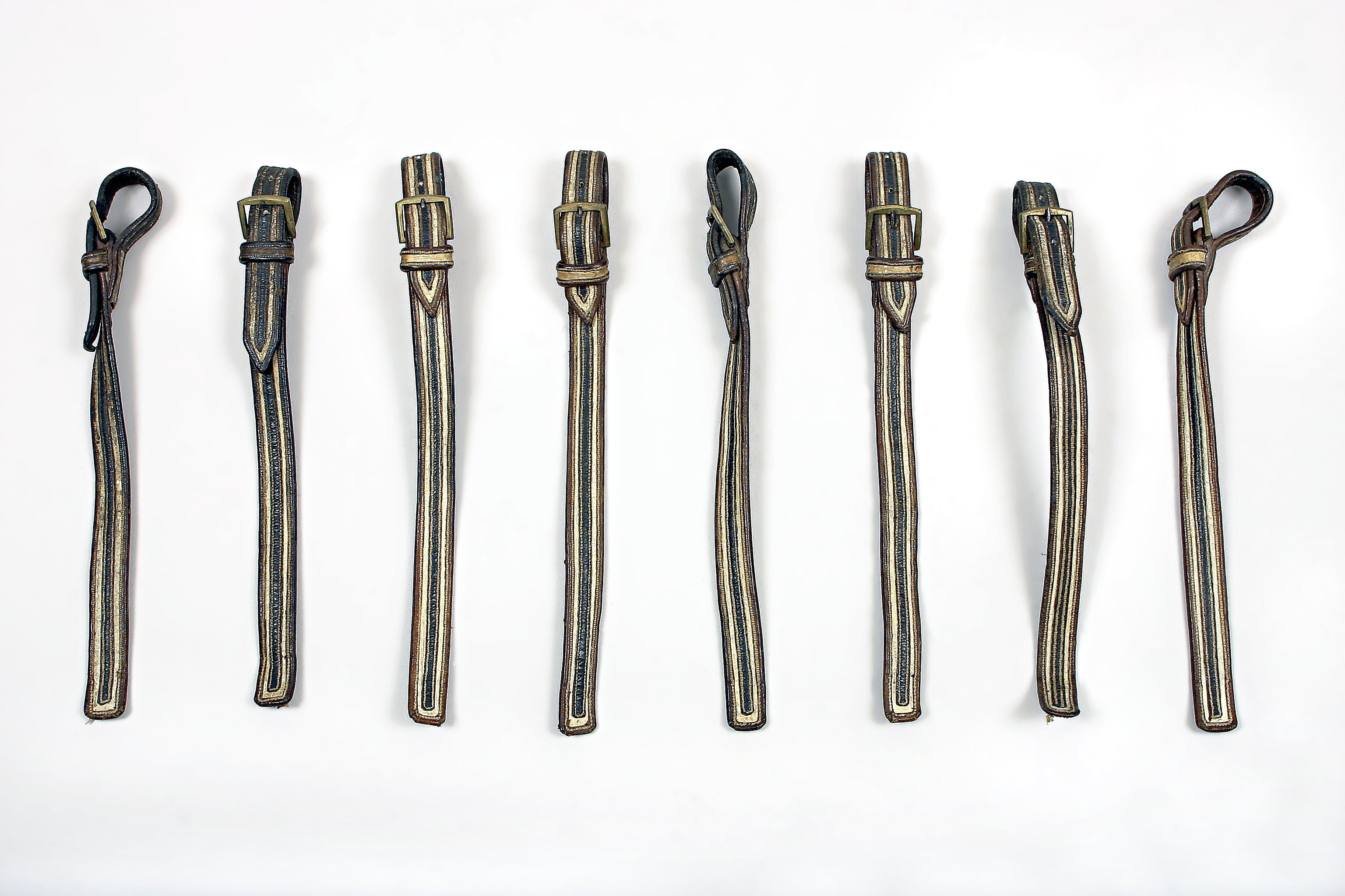 Åtta stycken remmar, 22 mm breda av brunt läder med dekor av svarta och vita längsgående ränder. Ena änden vikt till en ögla samt med rektangulär enkel sölja av mässing och hälla. I andra änden märken efter att remmen varit fastsydd och bort- sprättad.