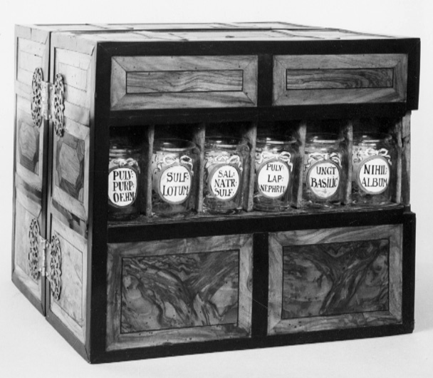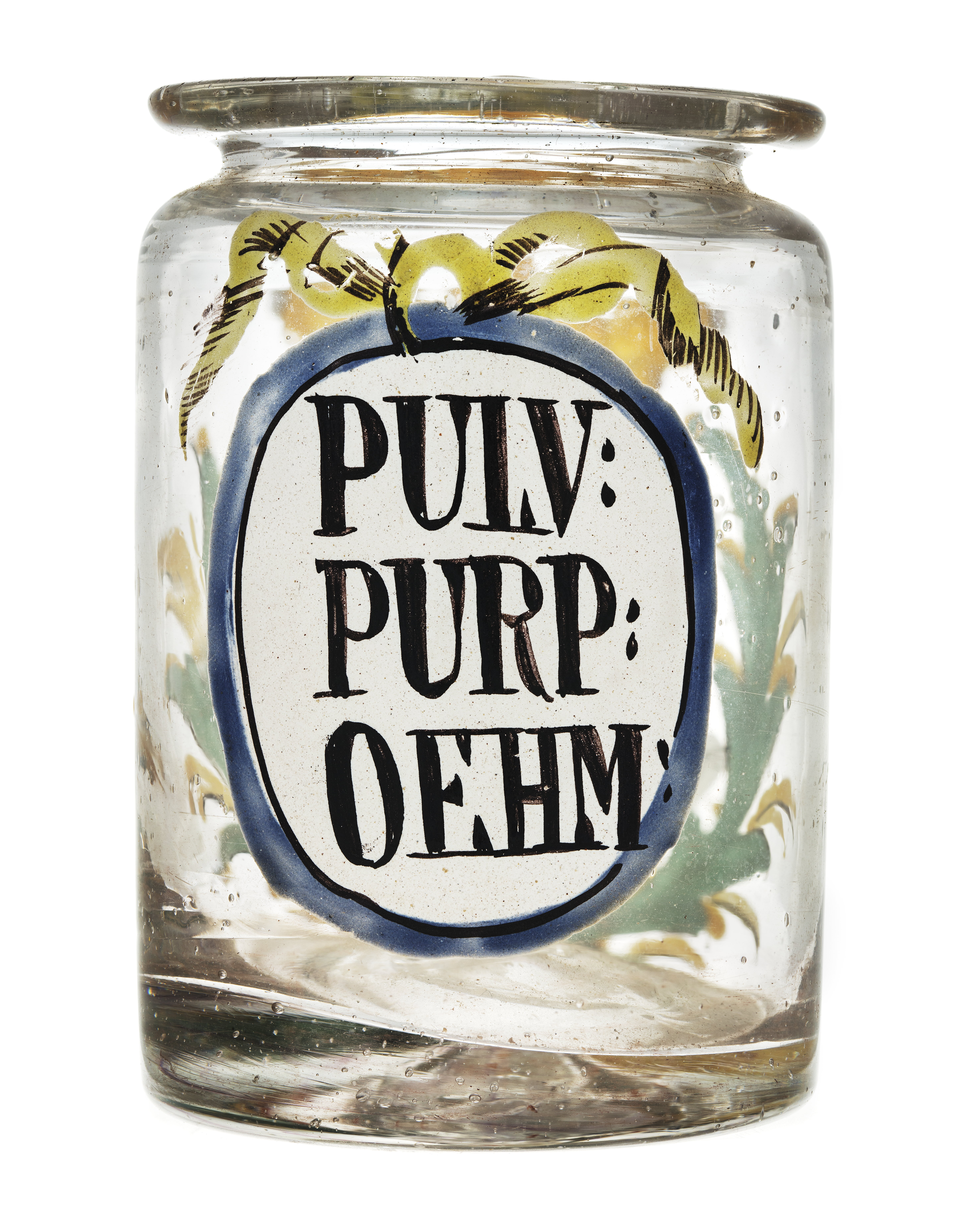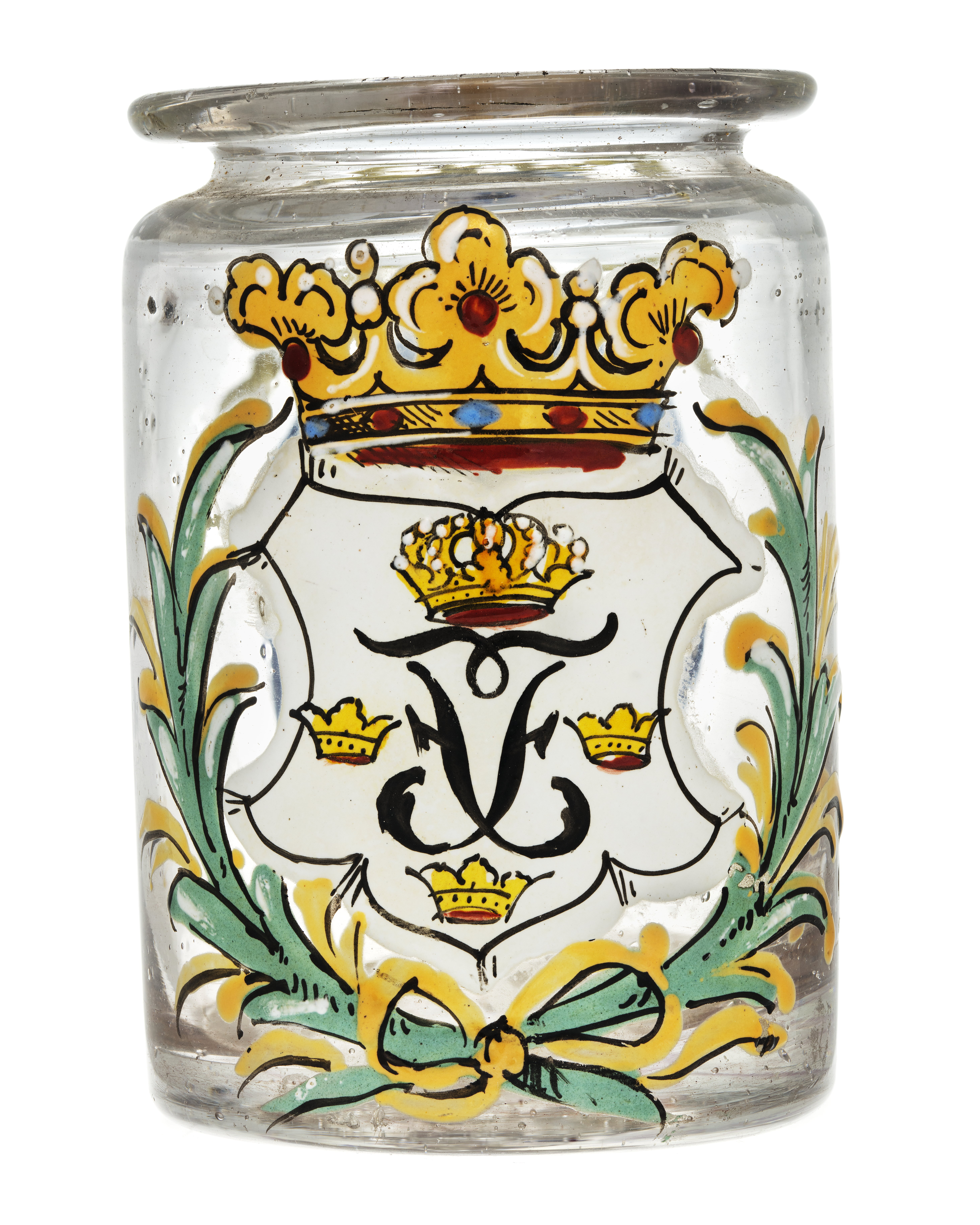 Tillhört Fredrik I, Sverige 1720-1751. Rund glasburk, svagt vidgad uppåt med något smalare hals med utsvängd kant för överbindning. Dekor i emaljmålning, på ena sidan en vit sköld, krönt av öppen krona i gult och rött, i skölden Fredrik I:s namnchiffer, spegelmonogram F (svart) krönt av en kunglig krona och omgivet av de tre svenska kronorna, allt i guld. Runt skölden en lagerkrans i grönt och guld. På motsatt sida en vit textoval med blå kant, upptill prydd med en gul rosett. I ovalen svart, latinsk text: "PULV: PURP:OEHM" (okänd sammansättning. Pulv.purpureus Anglicus är sammansatt av hjorthorn, bärnsten, röd korall, kräftstenar och kräftklor, saffran och konschonell - uppges vara utmärkt vid ett flertal sjukdomar).