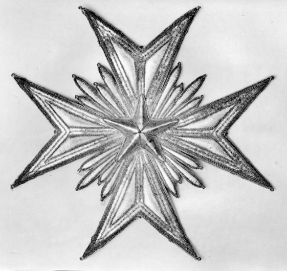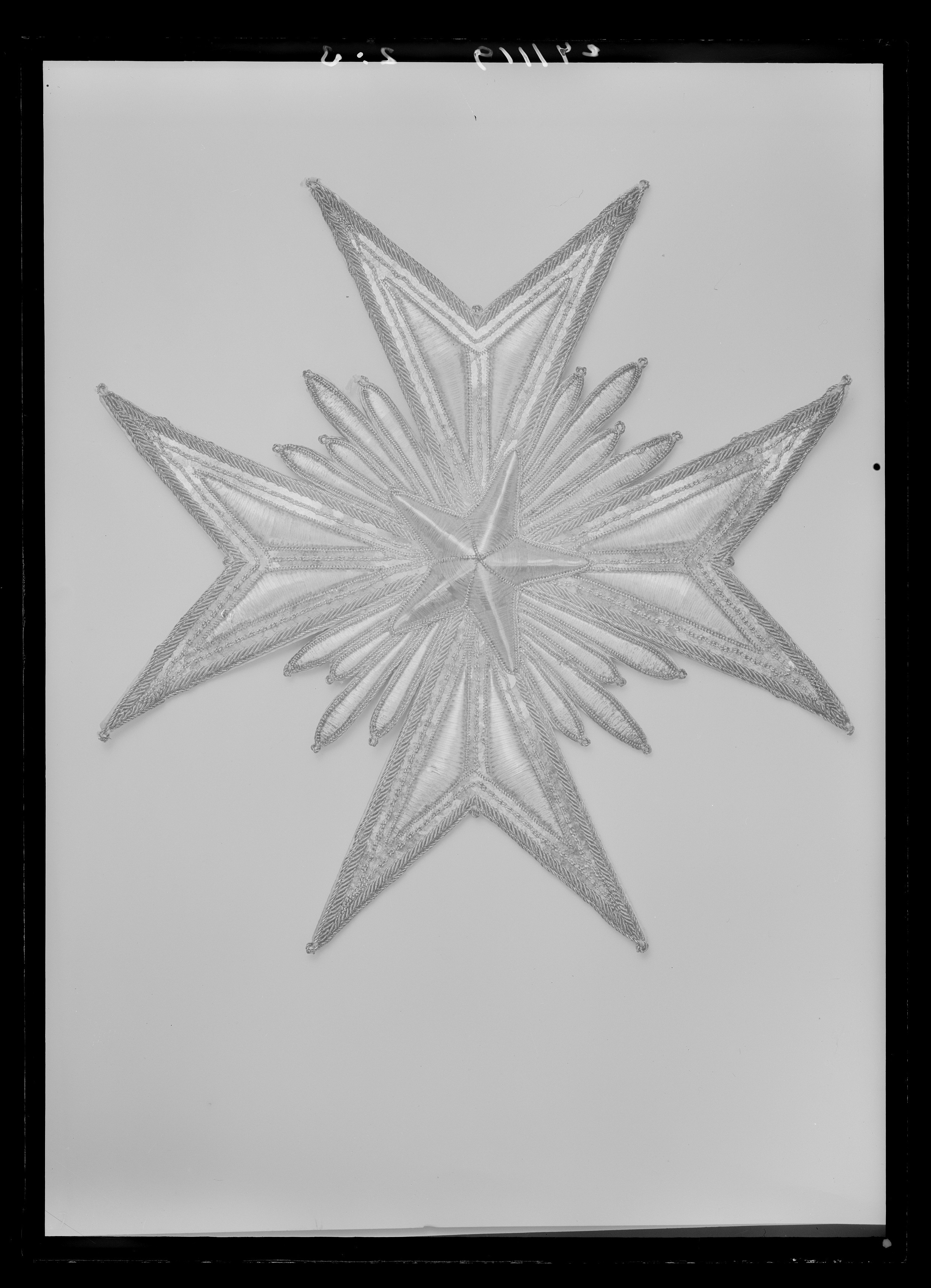 Malteserkors, broderat med silverlan, -paljetter och -kantiljer. Mellan korsarmarna rundade strålar över korsmitten en femuddig fasetterad stjärna i hög relief, strålarna och stjärnan broderade med silverkantiljer och -lan. På baksidan vitt papper.
