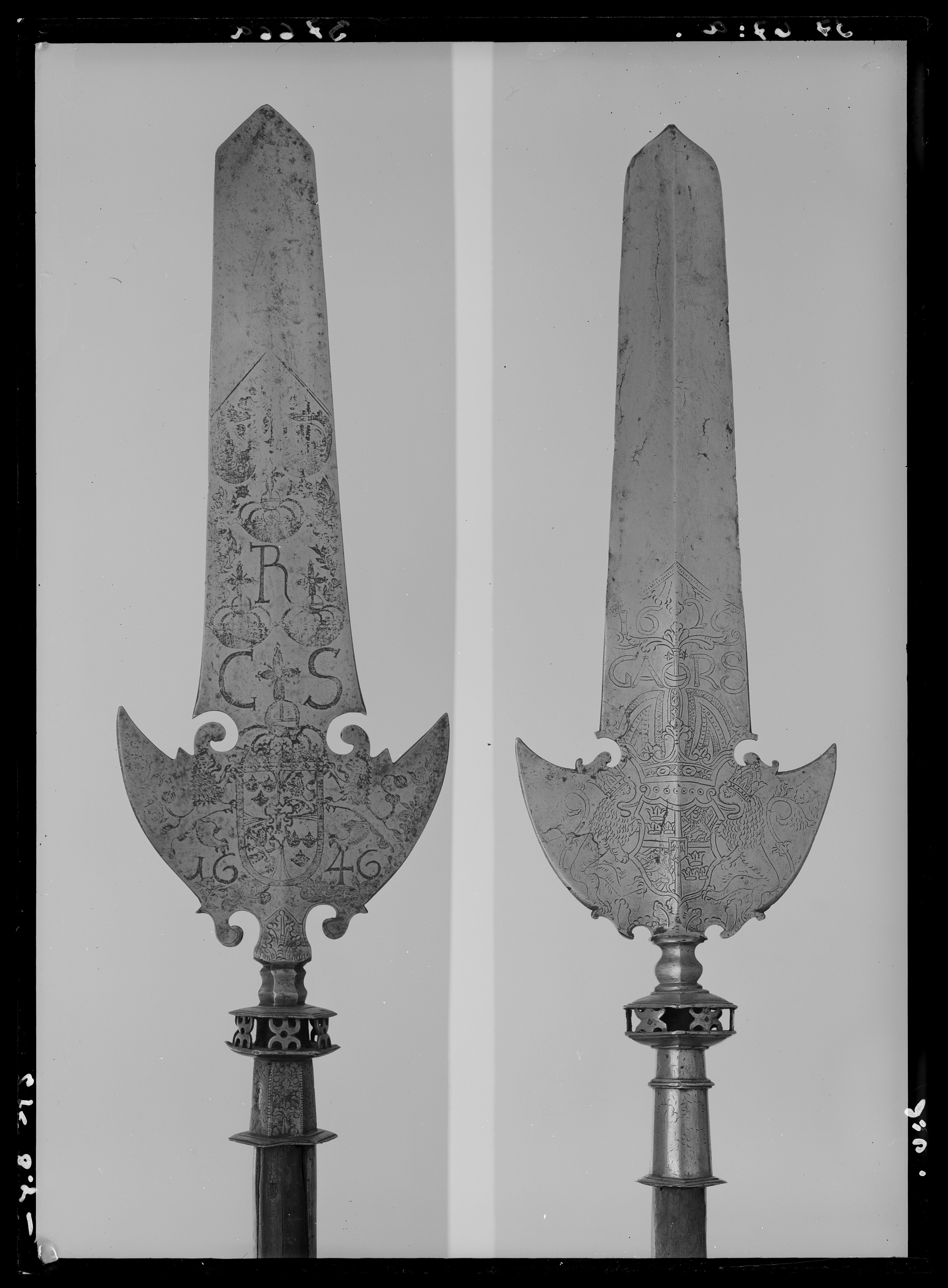 Klinga enligt m: 1646 för drottnign Kristinas drabanter. Dekoren upptill något nött, spår av förgyllning. Årtal 1646 och initialer CRS tydligt synliga på bägge sidor. Sexsidig, balusterformig hals, l: 20 mm. Holkens l: 74 mm, upptill med krans i form av två sexsidiga skivor, skilda med genombrutna ornament, nedtill i nedtill i form av en sexsidig skiva, holken däremellan med punsade bladornament. Från holken två skenor, l: 429, 439 mm, fästade i skafet med vardera fyra nitar. Skaft av brunbetsat trä (furu?), med runt tvärsnitt, diam 29 mm. 115 mm under holken genomgående hål, diam 6 mm. Runt detta fyra mindre hål.