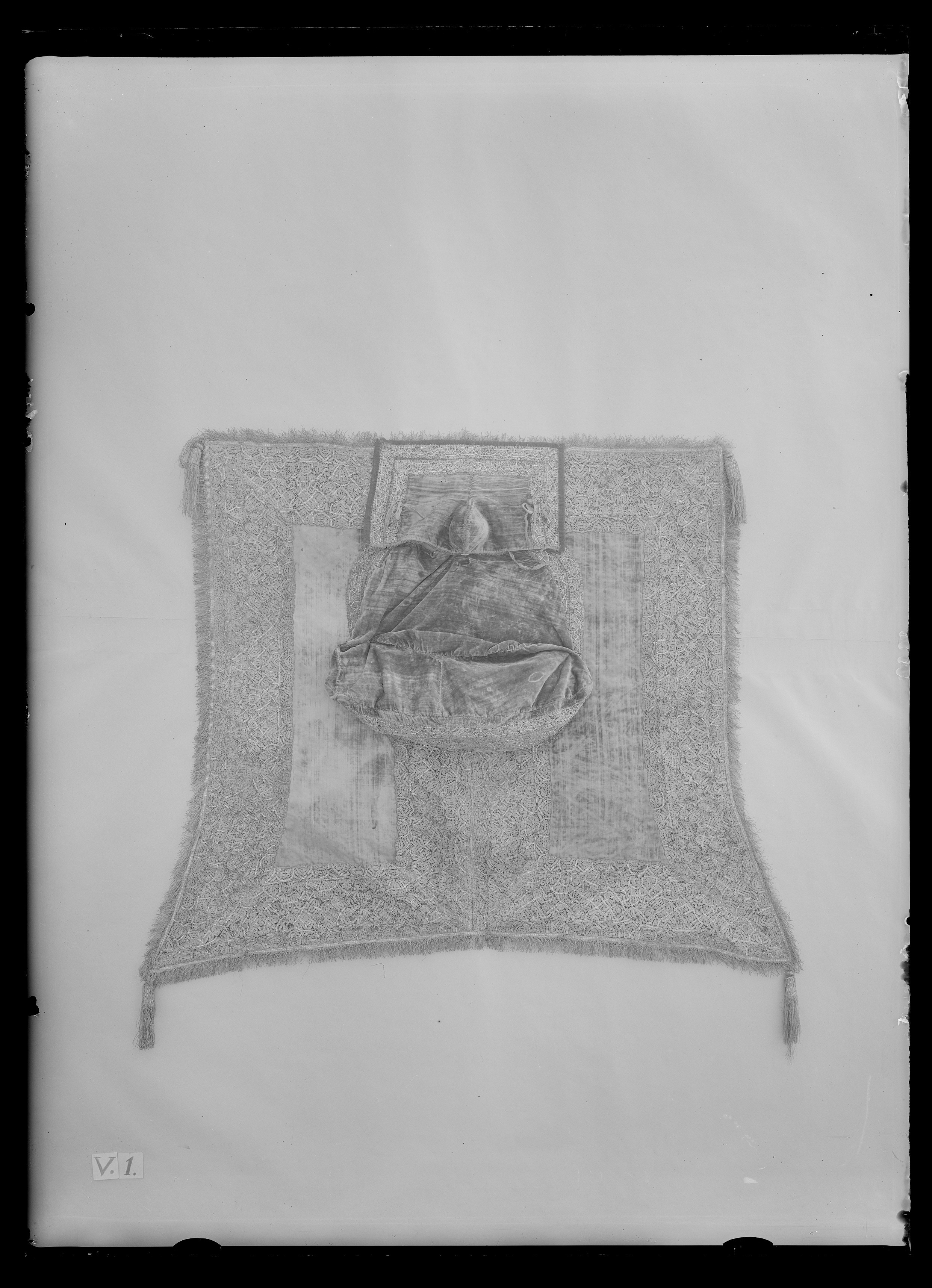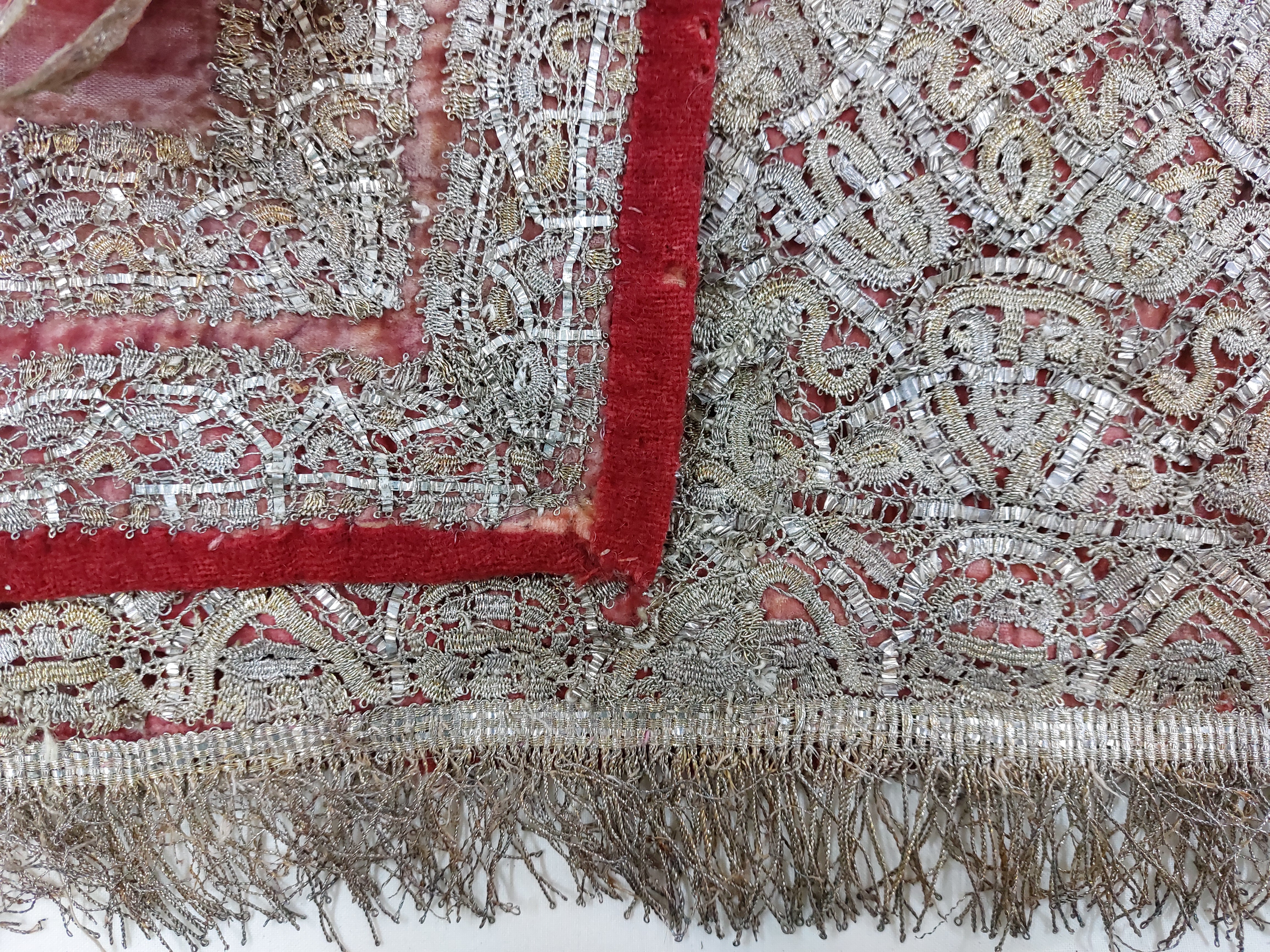 Kantbård av dubbla knypplade spetsar samt sammetskant fodrad med rött tuskaftat ylle fästad vid sadeltäcket med band vävda av silver och rött silke samt på ovansidan knutna rosetter.