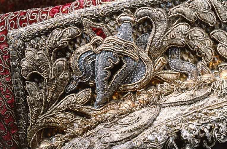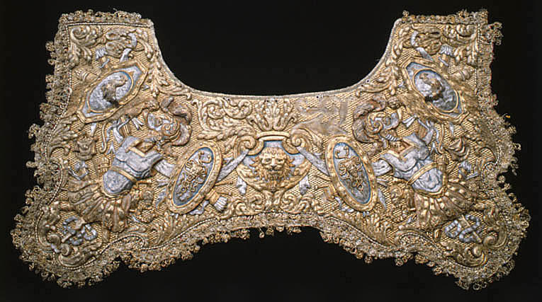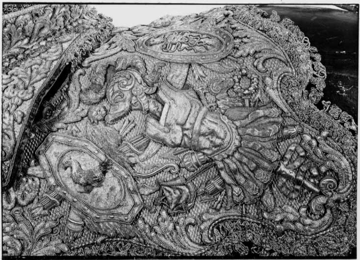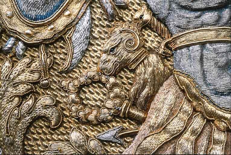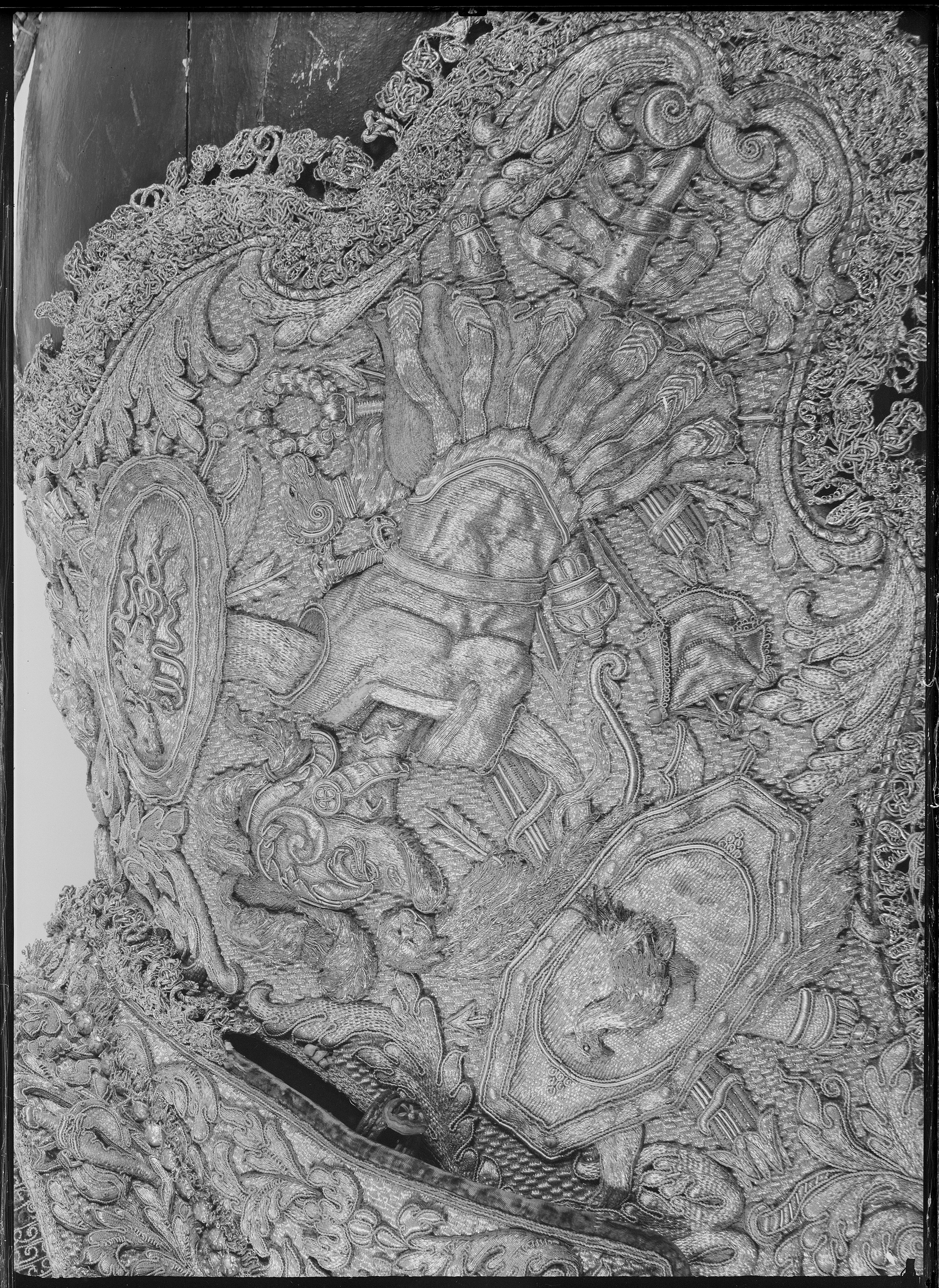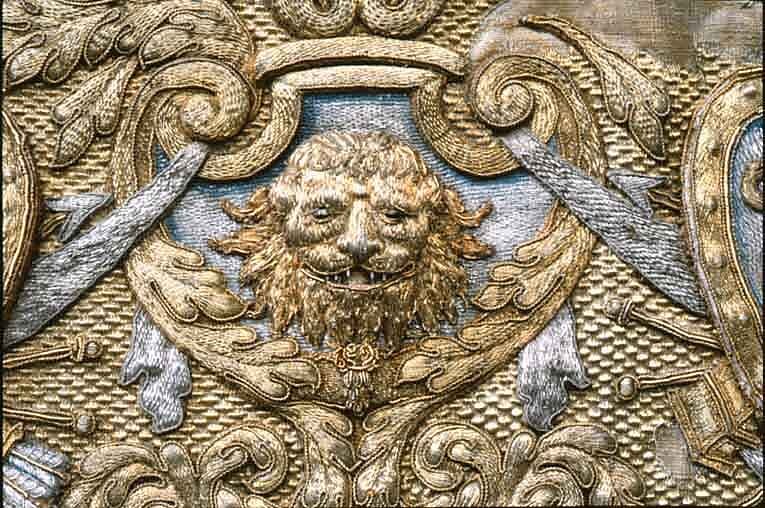 En Ny Sadel af Couleur de Feu Sammet, Sätet stickat med en grann Guld Litsqvard SadelKåpan och H ölster Kapporne med Eschabraquet broderade af GUld med Silfver i blå och Röda Tropheer, samt en Guld Bord omkring Sadelen, som där och hvar finns vara afnött, PistolKapporne och Eschabraquet uti Sömmar och Kanter intattat med GuldFrantsar och Galoner. Sadelknappen gjord som ett VädurHufvud med sina Horn och Öron samt 3 Sleifffer, /hwaraf en är söndergången/, däruti Pistol Hölstren anspännes äro förgylte på 6lödigt Silfver eller Zink, sammaledes finnes fram och bak på Sadelen inslagne 52 st förgyolte Tänglikor af samma Materia. Förbögelnaf rödt Saffian. Beslaget därtill bestär af 121 st Pucklor och Söljor alla förgylte af förberörde Materia, som ofvanföre mentionerat är nätt drifvit Arbete. Ryggstycket af samma Arbete som Förbögeln, Beslaget består af 21 st som och förgyldt är på 6lödigt Silfver eller Zink. StegRemmarne äfven lika som förbögeln, Beslaget uti Pucklor och Söljor är 46 stycken som, tillika med Stegböglarne, är förgylt uppå 6lödigt Silfver eller Zink; under bemälte Remmar en Silfvergalon. Hölstren till samma Sadel af rödt Saffian Schamererade med en GuldGalon. Husen öfver Pistol Kapporne äro af Couleur de Feu Moir, schamererade med en Guld Spets och ofvan omkring omfattat med en Guldgalon, Litsqvardne hvarmed Husen upp och igendrages äro af GUld och Couleur de Feu Silke, men Qvastarne af Unse Guld. Hufvudstället och en HandTygel af rödt Fucht beslagne med förgylt 6lödigt Silfver, som består uti Pucklor, Stifter och Söljor af 190 Stycken, nätt drifvit Arbete, hvaraf ett Beslag är förkommit likmäligt förra Inventarii innehåll. Tvänne stycken små Kedjor för Pannan. Betselstängerne med Pucklorne därtill förgylte samt 2 Bouquetter af allehanda slags Guld och färgade band. HandTygeln af Unce GUld tillhopa flätat med en Qvast på hvardera ändan af samma Materia, dessutan 2ne aflånga Knappar vid bägge ändarne. /Hälften häraf feltes 1803/ Ett par Blindor likamed Sadelen broderade, Remmarne af röd Saffian beslagne med 29 stycken Stifter af 6lödigt Silfver eller Zink förgylt. En Bukjord af rödt Aurora Silke med Jernsöljor uti, bestående af 3 stycken. tillskrivet - Flyttade till Kgl. Slottet År 1823. Efter nr 739 skrivet - Denna ofvannämnde Sadel och dess tillbehör är Högstsalig Hans Kongl. Majst Konung Carl XIte förärad af Konungen i Frankrike. jfr även Täcke nr 841 och Pistol-kappe-överdrag nr 739 cass. 1823. Rubrik: Sadlar och Ridetyg fordna Konungars Tid. inv. nr.: 580 Sida: 95 Nr. i föreg. inv.: 580 Anmärkning: Le Crusque sid. 95-