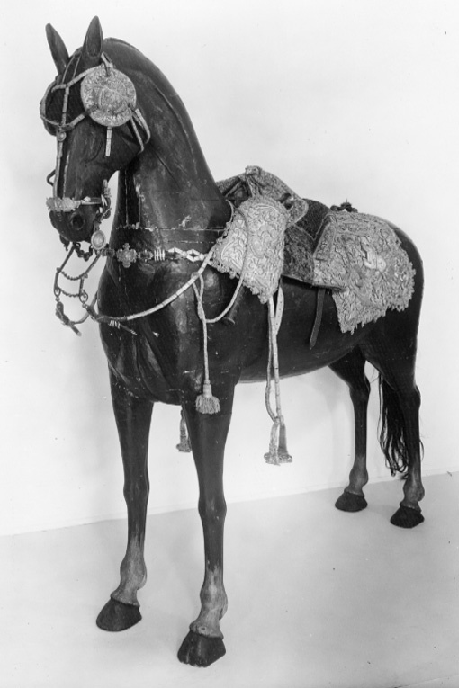 1 Sadel af couleur de feu sammet. Sätet är stickadt med guld; Sadelkåpan och hölsterkapporne samt schabraket äro broderade med guld och silfver i blå och röda trophéer och Sadeln är omgifven af en guldbård. Schabraket är försedt med guldfransar och Sadelen med galoner 114) i sömmar och kanter. (på h. sida -114 - galonerna omkring sadelknappen på venstra hälften äro borta) Sadelknappen har formen af ett wädurshufwud med horn och öron af förgyldt messing, frambommen försedd med 2ne öglor, hwari pistolhölstren anspännas. Förbygeln är af rödt läder. Beslaget består i 119 pucklor och söljor, ofvanföre ornerade med drifvet arbete af förgyldt messing. Ryggstycket är likaledes af rödt läder, beslaget består af 21 stycken af förgyldt messing. Stegremmarne äro af dito med silfvergalon under; Beslaget, som består i pucklor och söljor, tillhopa 46 stycken, är tillika med Stegbyglarne af förgyldt messing. Hölstren äro af rödt läder. Hufwudstället och handtygeln äro af röd Jucht, med 190 pucklor, söljor och stift af förgyldt messing och 2 små kedjor för pannan. Betselstängerne med pucklorne äro förgylde samt försedde med 2ne bouquetter af diverse färgade band. 1 Litsquard af guld, silfver och rödt silke med qvast och en aflång knapp så som för SadelnNo 46. 1 par Blinder lika med sadeln broderade; Remmarne äro af rödt saffian med 26 (överstruket, ändrat till 25) beslag 114), deraf 2 söljor, alla af förgyldt messing. (på h. sida - 114 - beslagens antal nu 25). 841-48 1 Täcke af rödt ylle sarge, fodradt med kamfass. Denna sadel är Konungen förärad från Konungen i Frankrike. Rubrik: Inventarium öfwer de Persedlar, som till Kongl. Klädkammaren blifwit afflyttade från Kongl. LifRustkammaren, upprättadt år 1855 Tid. inv. nr.: 47 Sida: 69 Nr. i föreg. inv.: 580 Anmärkning: Le Crusque, ex B sid. 115 f