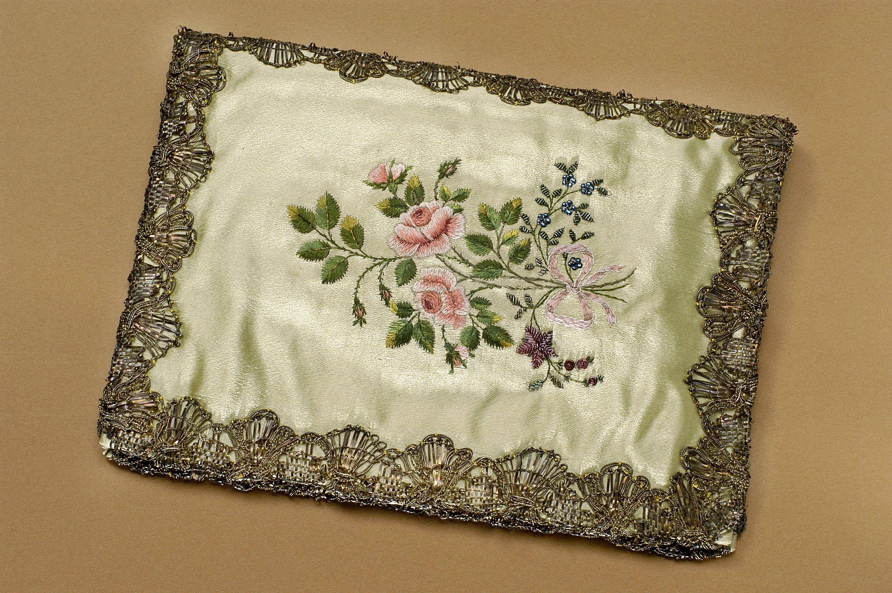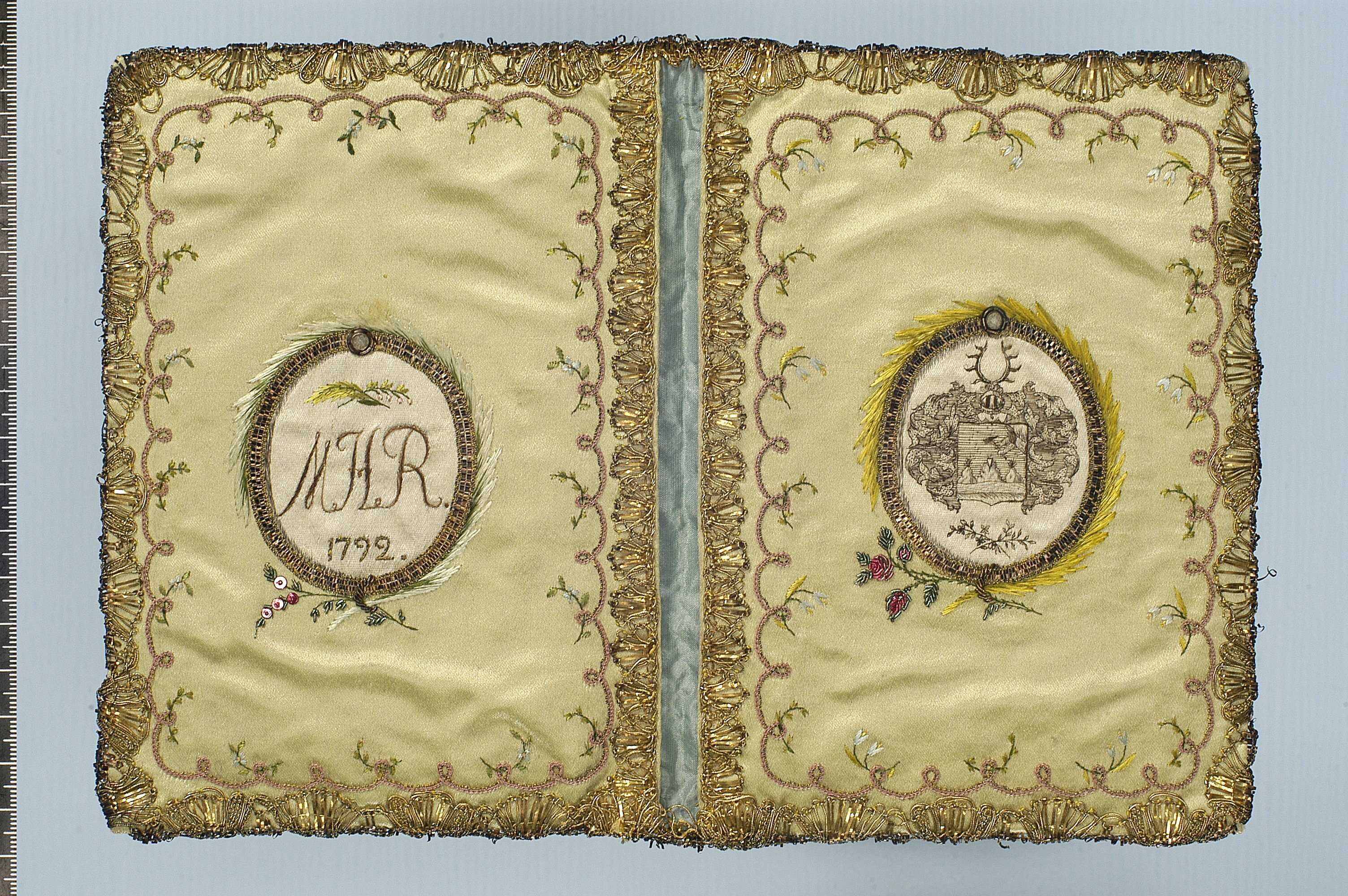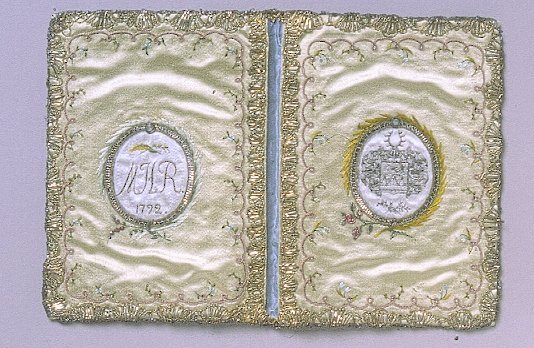 Plånbok av ljusgrön sidenatlas, rikt broderad på både ut- och insidan. På utsidan en broderad rosenbukett omknuten med en rosett samt en vas på hög fot, fylld med blommor. På insidan två medaljonger, fyllda med vit sidenatlas och omslutna av en guldtrådsram som kröns med en liten sten. I den ena medaljongen finns initialerna MHR broderade med brunt hår, därunder årtalet 1792. I den andra finns det Reenstiernska familjevapnet, broderat med svart silketråd.