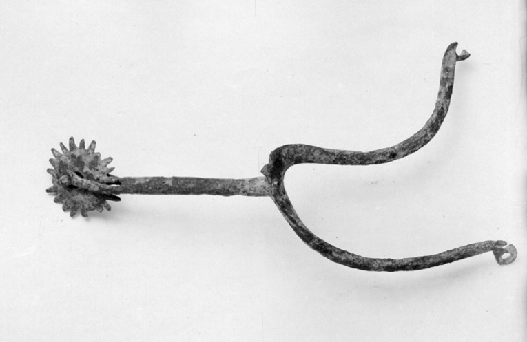 Sporre av stål. U-formade, böjda skänklar med konvex utsida. Ändarna nedböjda med hål (för hakar och sölja). Lång rak, rundstavig hals. Mångtandad klinga.