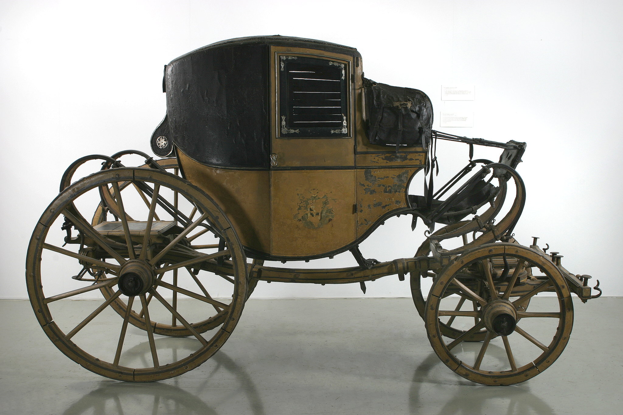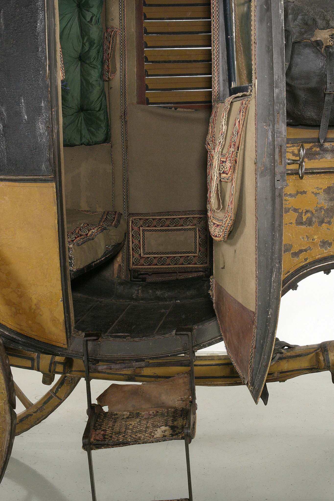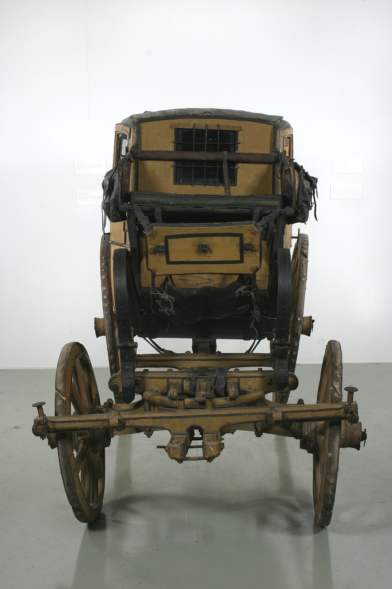 Resevagn, postvagn med tvåsitsig korg, kupé, med välvt läderklätt tak och rundad fotbotten. Kuskbock sammanbyggd med korgen och utgörande förvaringsutrymme, åtkomligt inifrån. Tak och övre väggdel svarta, nedre delen gul med svarta linjer. På dörrarna Brahevapnets svarta vingar, mot grön hermelinsmantel. Två dörrfönster satta i svartklädda ramar med mässingsbeslag i hörnen och dessutom jalusier av trä. Gallret försett med fönster framtill. Pungformigt förvaringsfack i bakväggen med rosettformade mässingsbeslag på ändarna. Lakejhandtag vid takkanten. Invändigt ljusgrått kläde med garnering av galoner i rött, vitt, blått. Två sitsdynor. På väggarnas övre del är fästade gröna, löst stoppade dynor. Vid dörrarna uppfällbara fotsteg i två steg. Korgen hänger i fyra remmar lagda över fyra C-fjädrar, s.k. fjädring à la Polignac, på underredet som är gult och har en mittbom utan svanhals. Bakvagn med bagage- eller lakejbräda, framvagn med vändkrans, springvåg och anordning för anspann med två eller tre hästar i bredd. Kuskbock med smalt, stoppat ryggstöd, sidstöd med läderväskor, fotbräda samt stänkskydd av läder.
