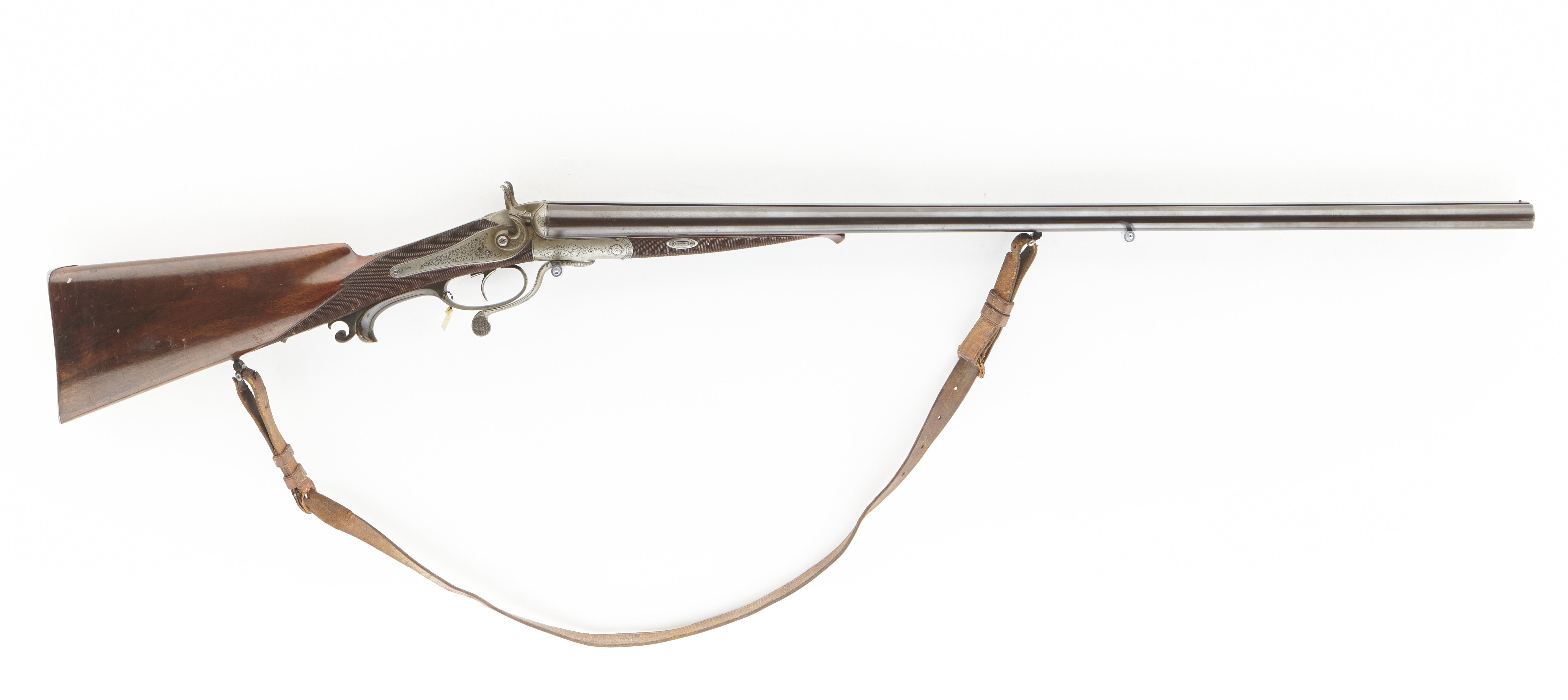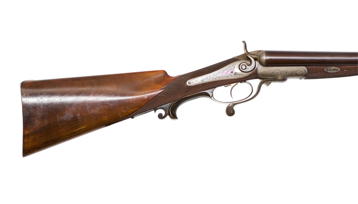 Dubbelbössa, J P Sauer & Sohn, Suhl, tillverkningr 1302 ca 1850, slutning med nyckel över varbygeln. Pipan tillverkad i Birmingham.