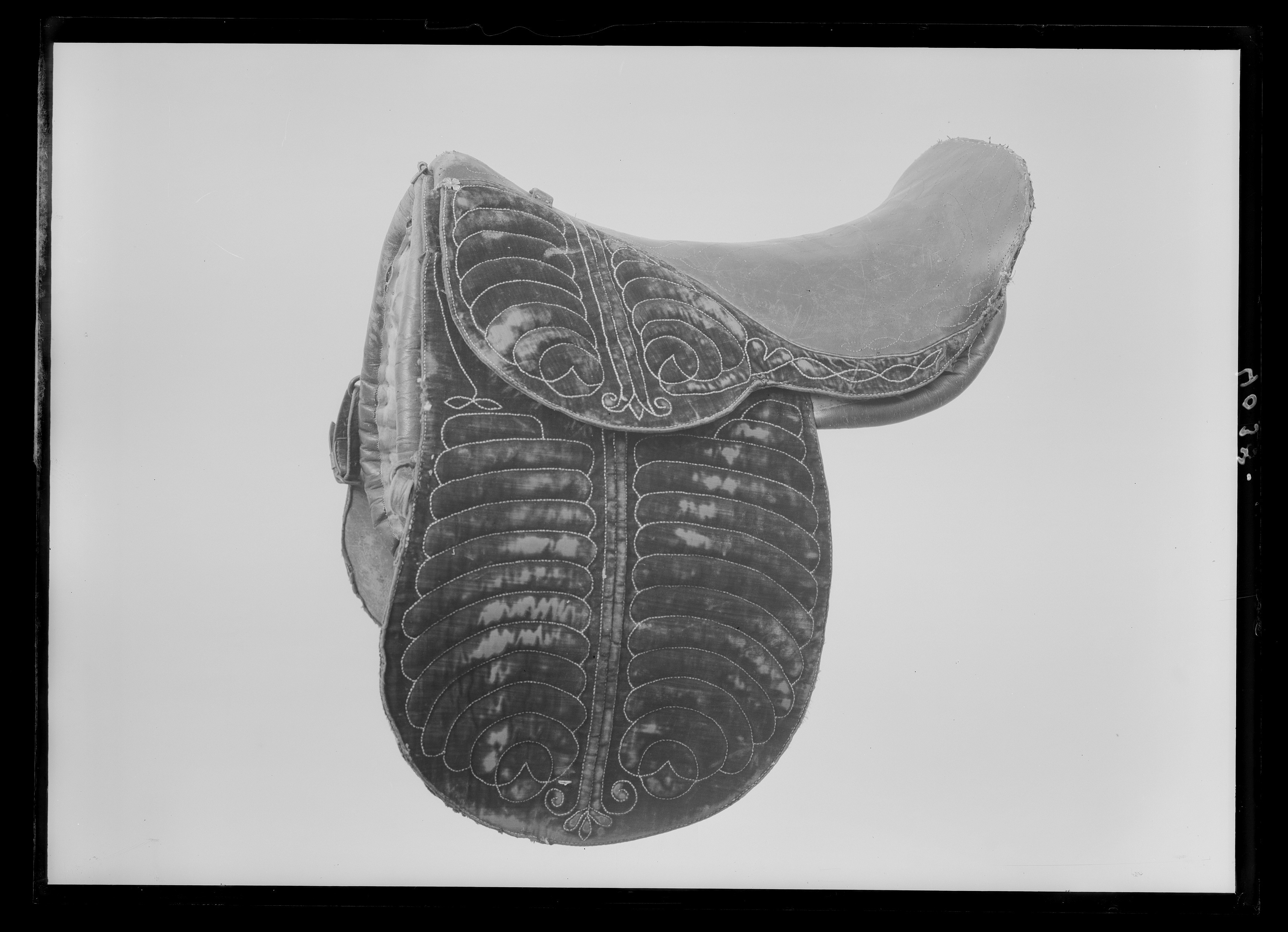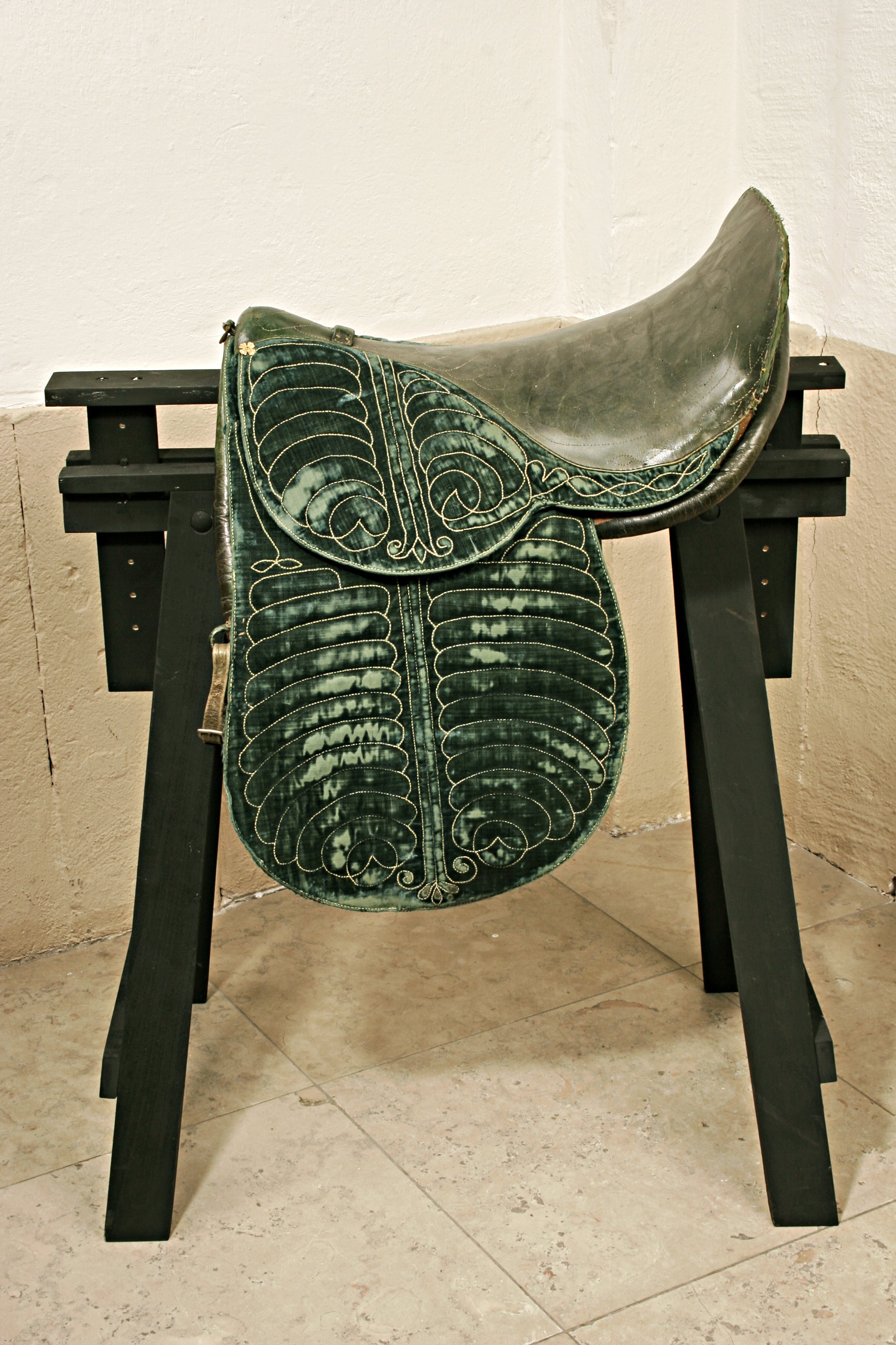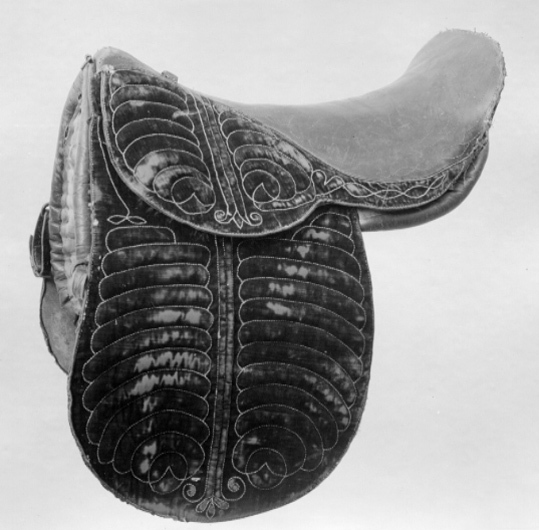 Sadel av grön sammet med sits och sadelknapp klädda med grönt skinn. Sitsen med mönsterstickningar. Kåpor av grön mönsterstickad sammet fodrade med brunt läder. Bom klädd med grönt skinn. Bossor av naturfärgat linne kantade med grönt skinn och fodrade med brunt skinn. Fyra stroppar av brunt läder för sadelgjord, två byglar för stigläder, sölja framtill av mässing för fäste av pistolhölster baktill en läderögla för svanskappa. I främre kanten av storkåpan en läderögla samt smala gröna läderremmar. På var sida om sadelknappen en blomformig tännlika av förgylld mässin Tillbehör: Stigläder av grönt skinn ca 1450 mm långa med söljor av förgylld mässing. nr 33278-9 Svanskappa ca 670 mm lång med flätbård av guldtråd i mönster samt på mitten rund tre kronors sköld av blå emalj omgiven av strålar krönt med sluten krona. nr 33277