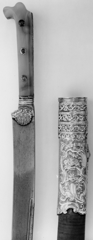 Balja klädd med röd-gredelin sammet med silvergalon över sömmen. Två breda beslag av drivet och ciselerat guld, munbleck, l: 150 mm och doppsko, l: 395 mm. Dekor i form av c-formade bågar, rocailler, blommor och blad. Nära mynningen ett pålött, genombrutet beslag med ranka och flätor, nedanför detta på ryggsidan en fast bygel för gehäng. Genombruten, trekantig släpsko.