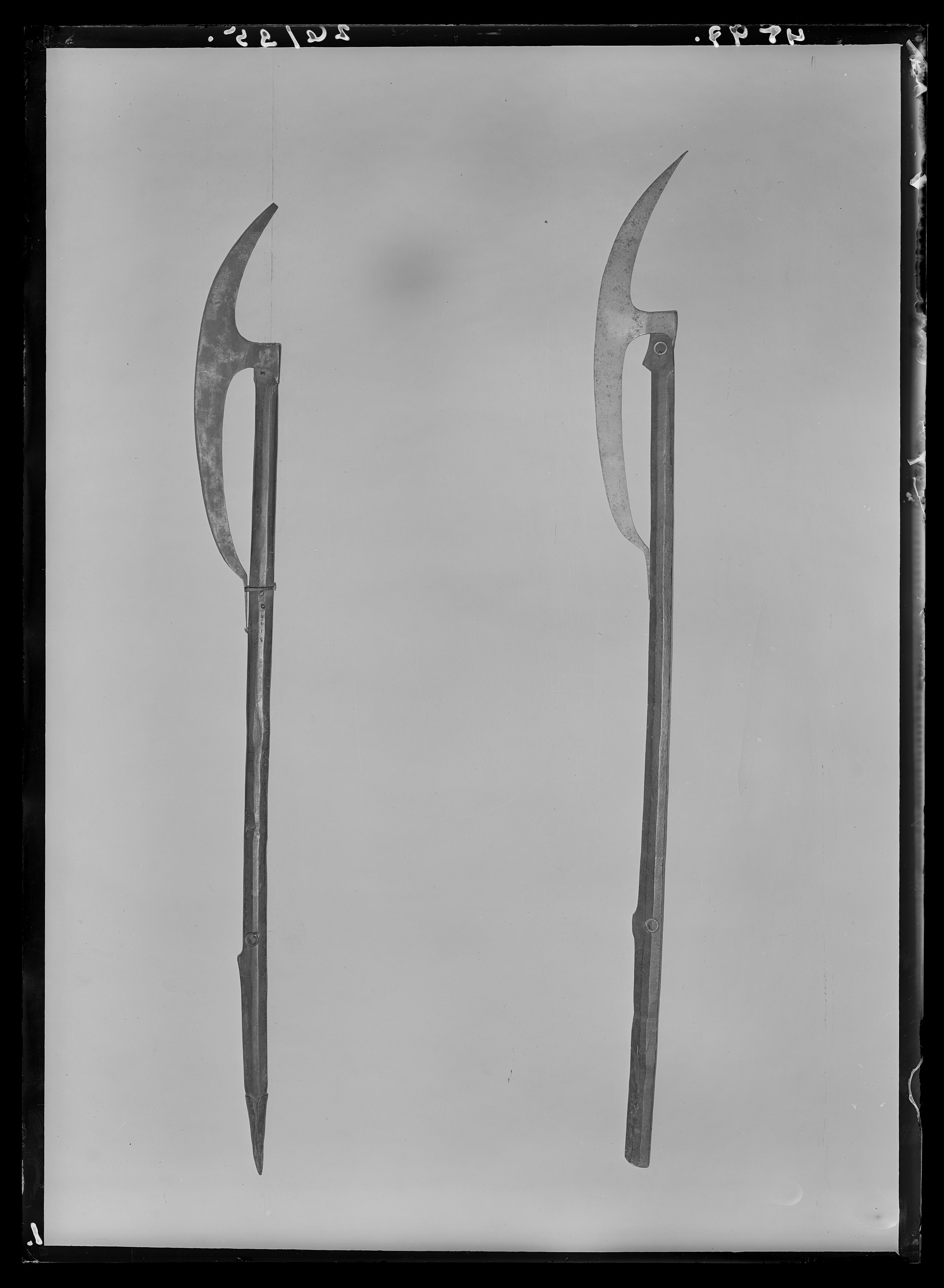 Blad utdraget halvmånformigt och nedtill fästat vid skaftet. Holken baktill 60 mm hög. Skaft av brunbetsat trä med åttsidigt tvärsnitt och breddad överdel i form av en spets mot bladet. Upptill på vänstra sidan och 390 mm nedifrån på samma sida bärringar, den övre fästad i klammer gående genom skaftet och där utböjd i två delar.