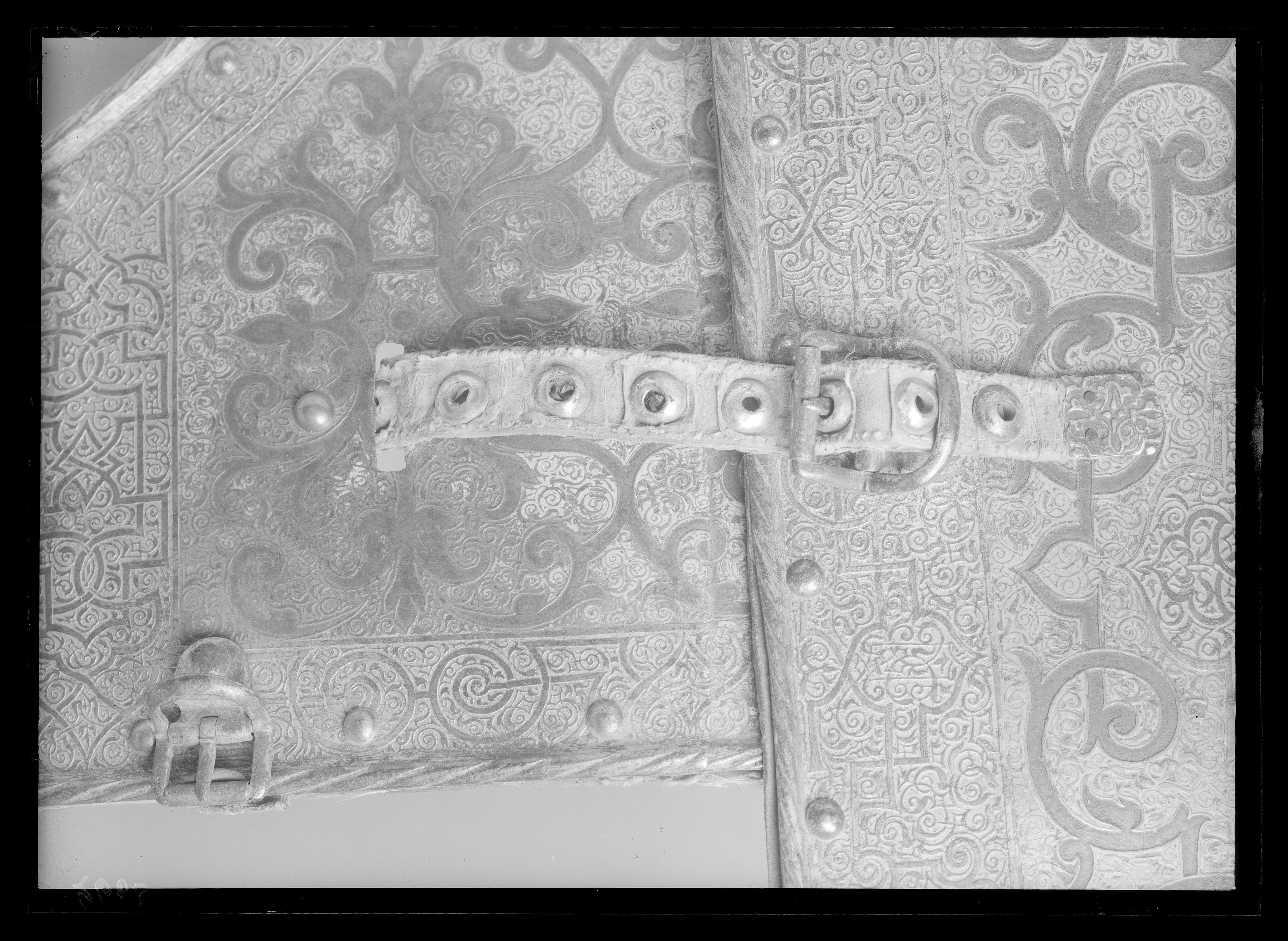 2:ne tyglar hvardera i 4 delar, sammanhållna med gångjern, på hvarje tygel finnes 2:ne söljor och en med svart sammet öfverklädd spännrem, hvilken är försedd med en ciselerad tamp och ett spännhål med skoning - gångjernet på ena tygeln bristfälligt.