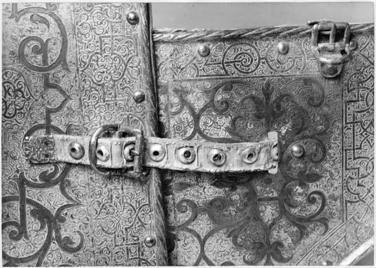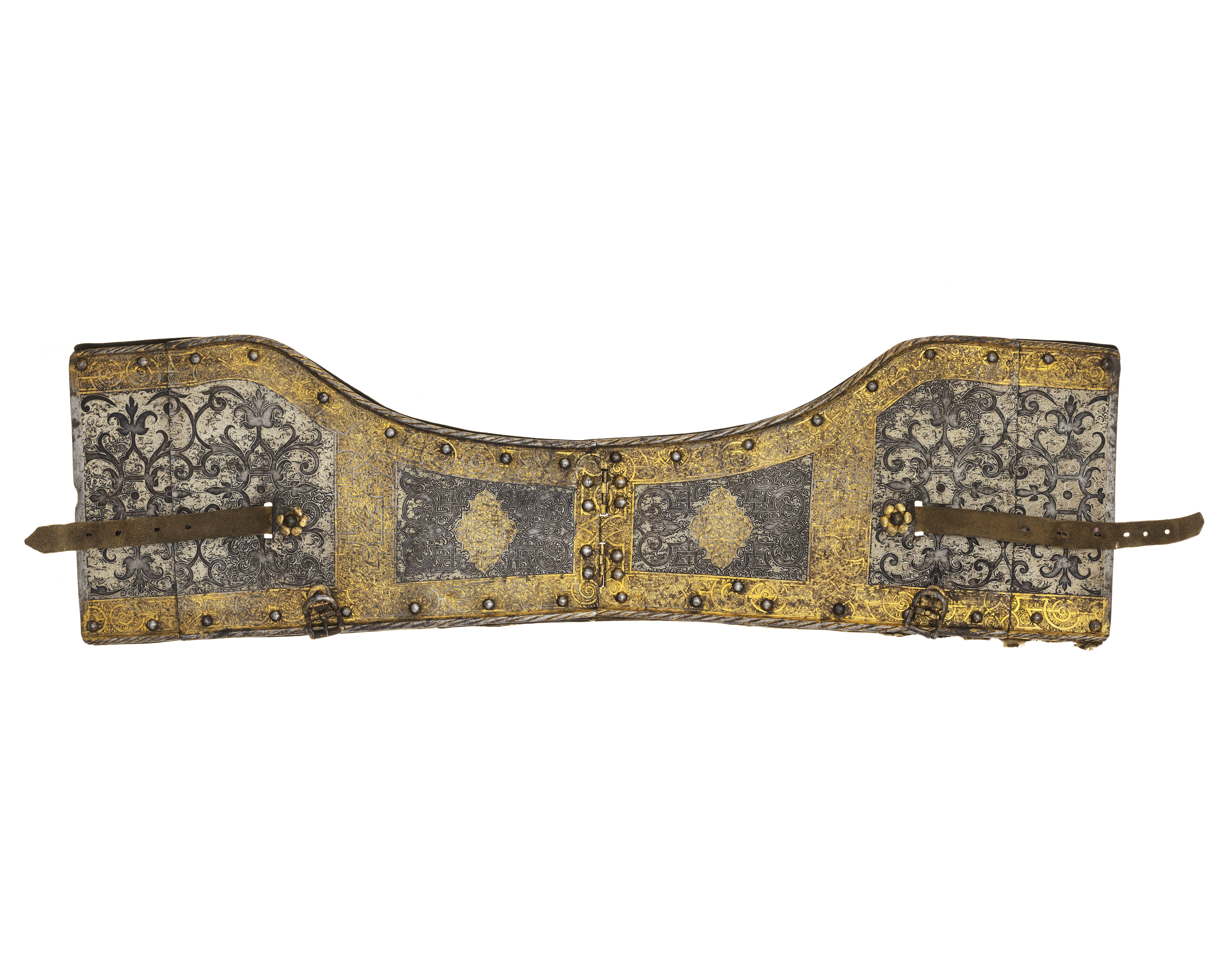 - Christian II:s hästrustning af jern med vridna bundtar, helt och hållet etsad i ornamenter, dels förgylld och dels belagd med en hvit massa - nitar af jern med knappformiga hufvuden, rustningen består af: