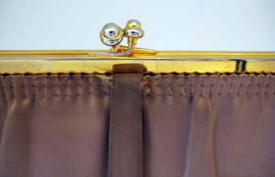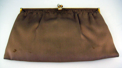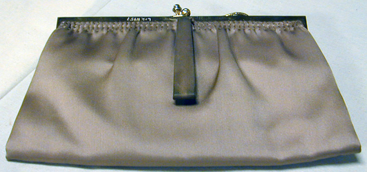 Aftonväska av beigerosa duchesse. Trapetsformad. Öppningen av gulmetall vilken bildar en fyrkantig ram och är på ena sidoytan klädd med väskans tyg. Låset av två kulor som greppar om varandra. Väskan är "fastsydd" vid ramen med tre parallella trådar som veckar tyget i kanten. På ena sidan en bärrem av väskans material, b: 12-18 mm. Inuti foder av rosa siden. I väskan finns fyra extra fack. I ett av dem ligger en spegel, samt i ett en portmonnä.