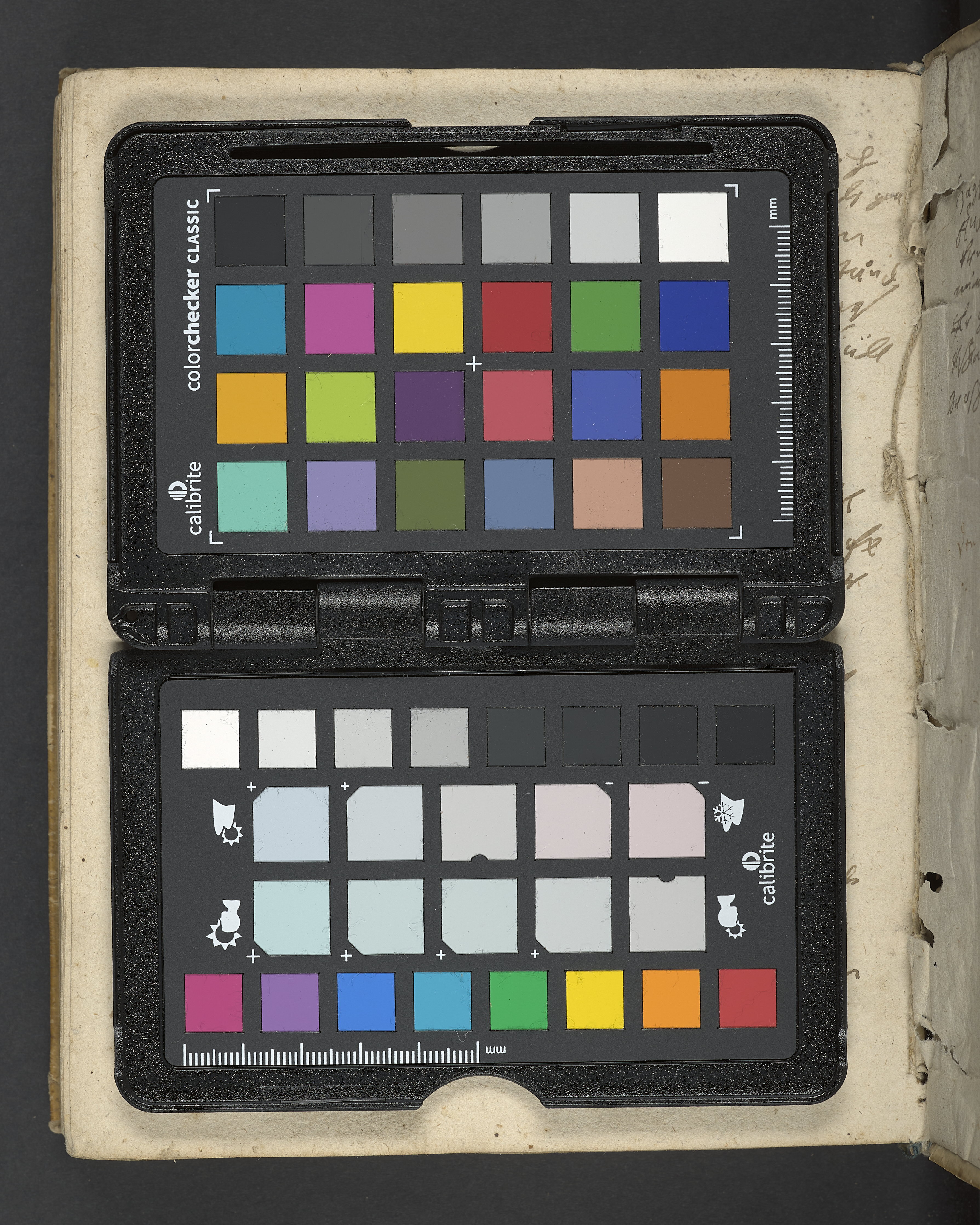 Pergamentband. Röd- och blåstänkt snitt. 2 par knytband.