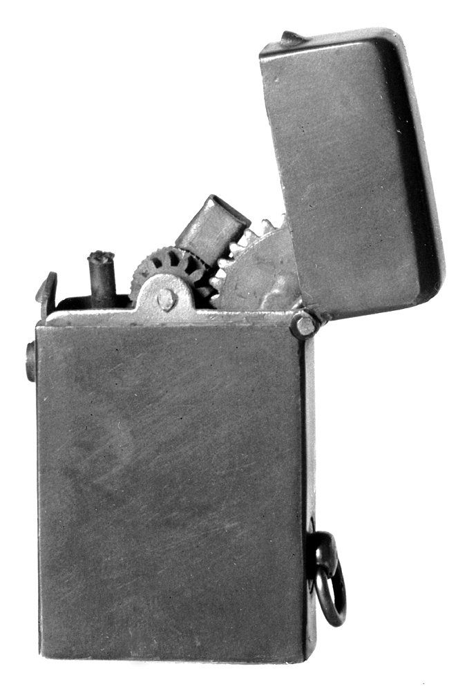CIGARRTÄNDARE (för sprit). Av förkopprad mässing. Stående rektangulär, med plana sidor och kanter samt högt fällock med springfjäder, scharneret vid bakkanten. Inuti tändaren vit bomull, som uppsuger spriten, då tändaren påfylles. Höjd: 5,7 cm.; bredd: 3,2 cm.; tjocklek: 1,2 cm. Utländsk tillverkning. Inköpt av Walther von Hallwyl på 1890-talet hos John Sörman, Magasin för engelska och franska varor.