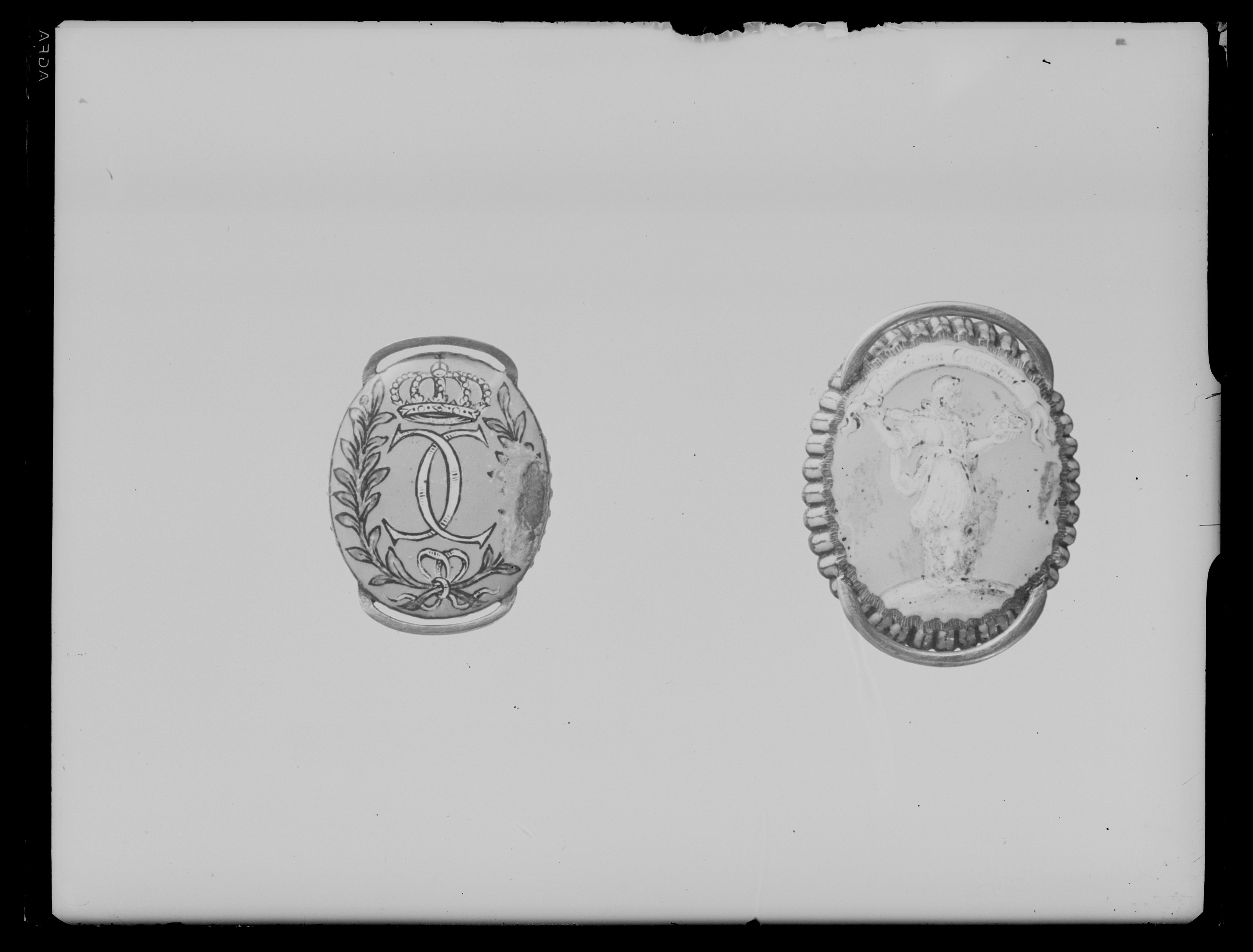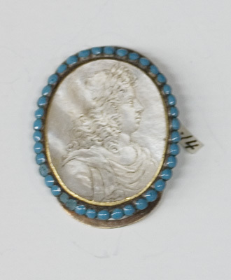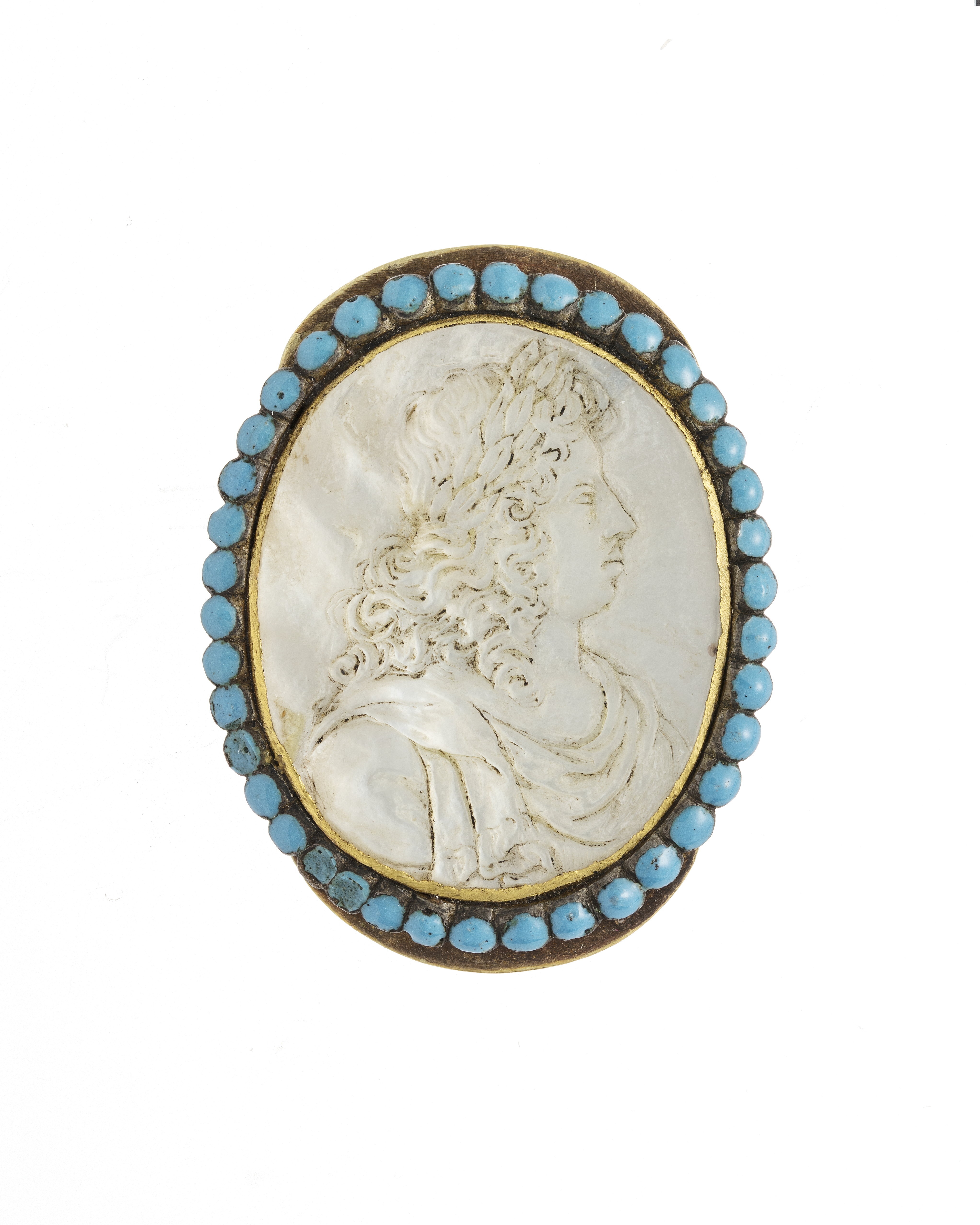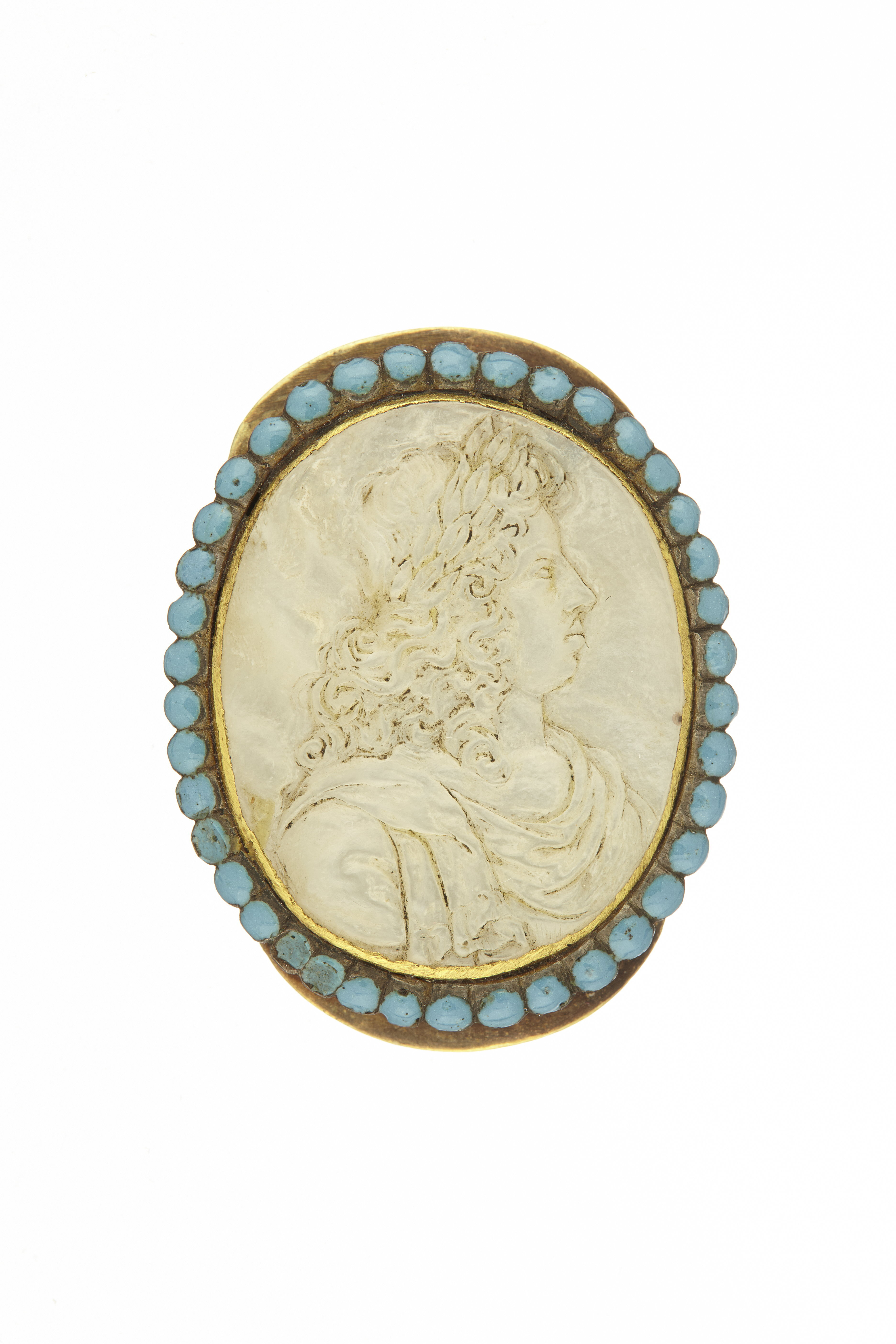 Ovalt porträtt, skuret i pärlemor, bröstbild, profil höger, antik dräkt, lagerkrans. Fattad i oval bracelette, smal guldkant och kantbård av 39 stavar av silver, täckta med turkosblå emalj. Baksidan täckt med samma blå emalj, därpå i grisaille allegorisk kvinnofigur med krona i vänster hand och spira i höger, spiran hålls vågrätt och pekar på kronan, ovanför kvinnan fladrrar ett vitt band med grå text: "fidelite ma couronne". Bandbyglar av guld.