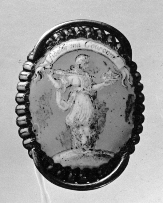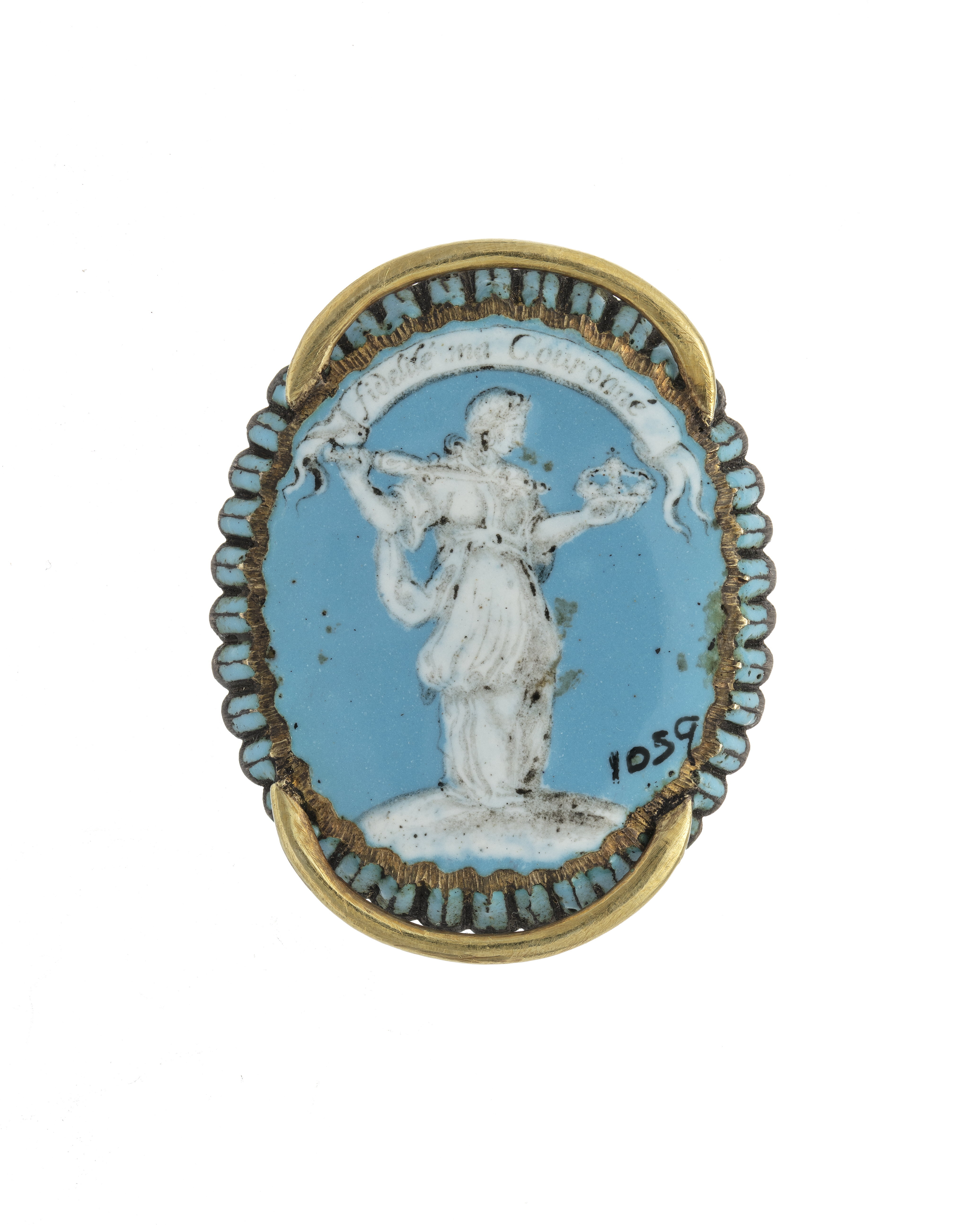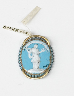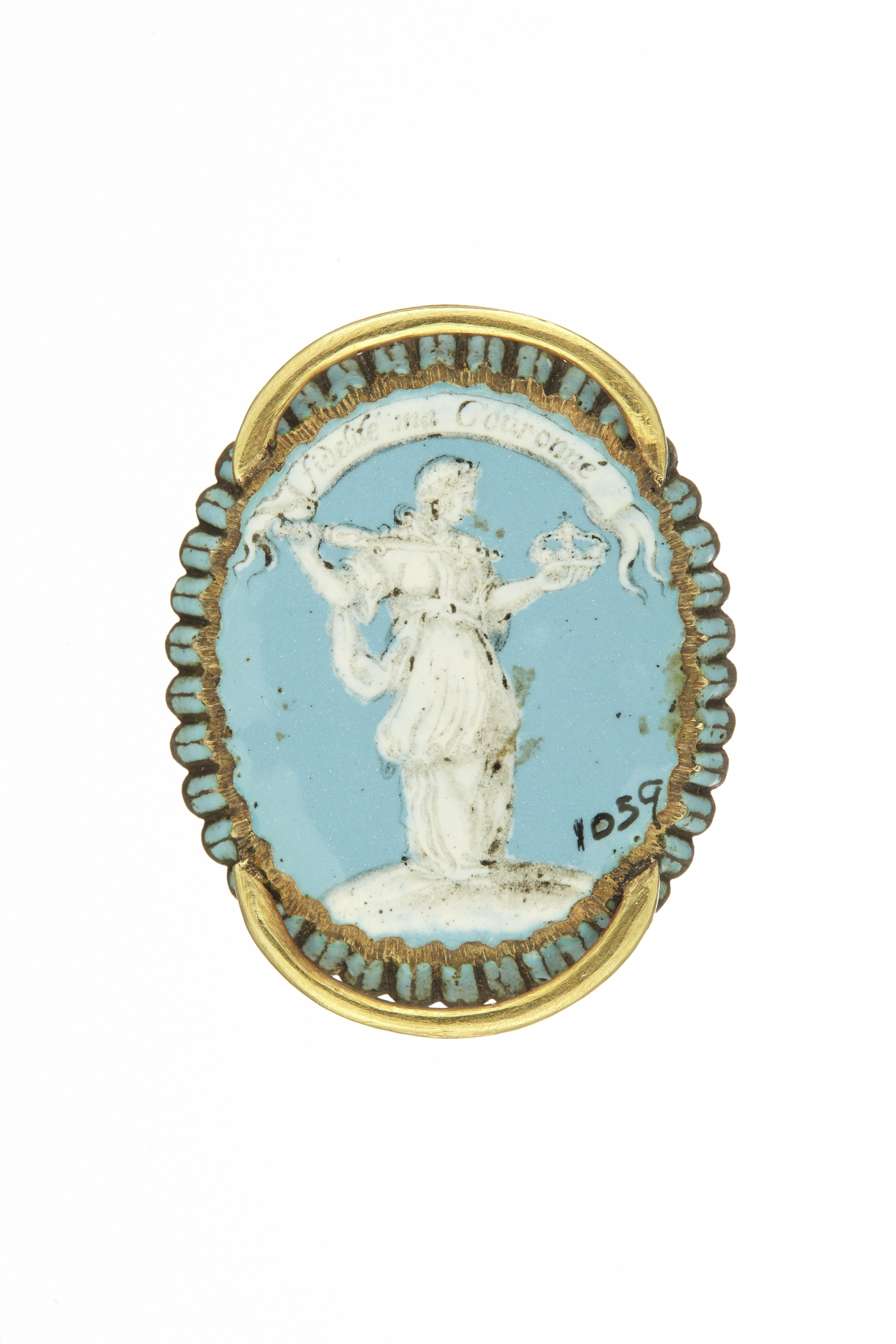 Ovalt porträtt, skuret i pärlemor, bröstbild, profil höger, antik dräkt, lagerkrans. Fattad i oval bracelette, smal guldkant och kantbård av 39 stavar av silver, täckta med turkosblå emalj. Baksidan täckt med samma blå emalj, därpå i grisaille allegorisk kvinnofigur med krona i vänster hand och spira i höger, spiran hålls vågrätt och pekar på kronan, ovanför kvinnan fladrrar ett vitt band med grå text: "fidelite ma couronne". Bandbyglar av guld.