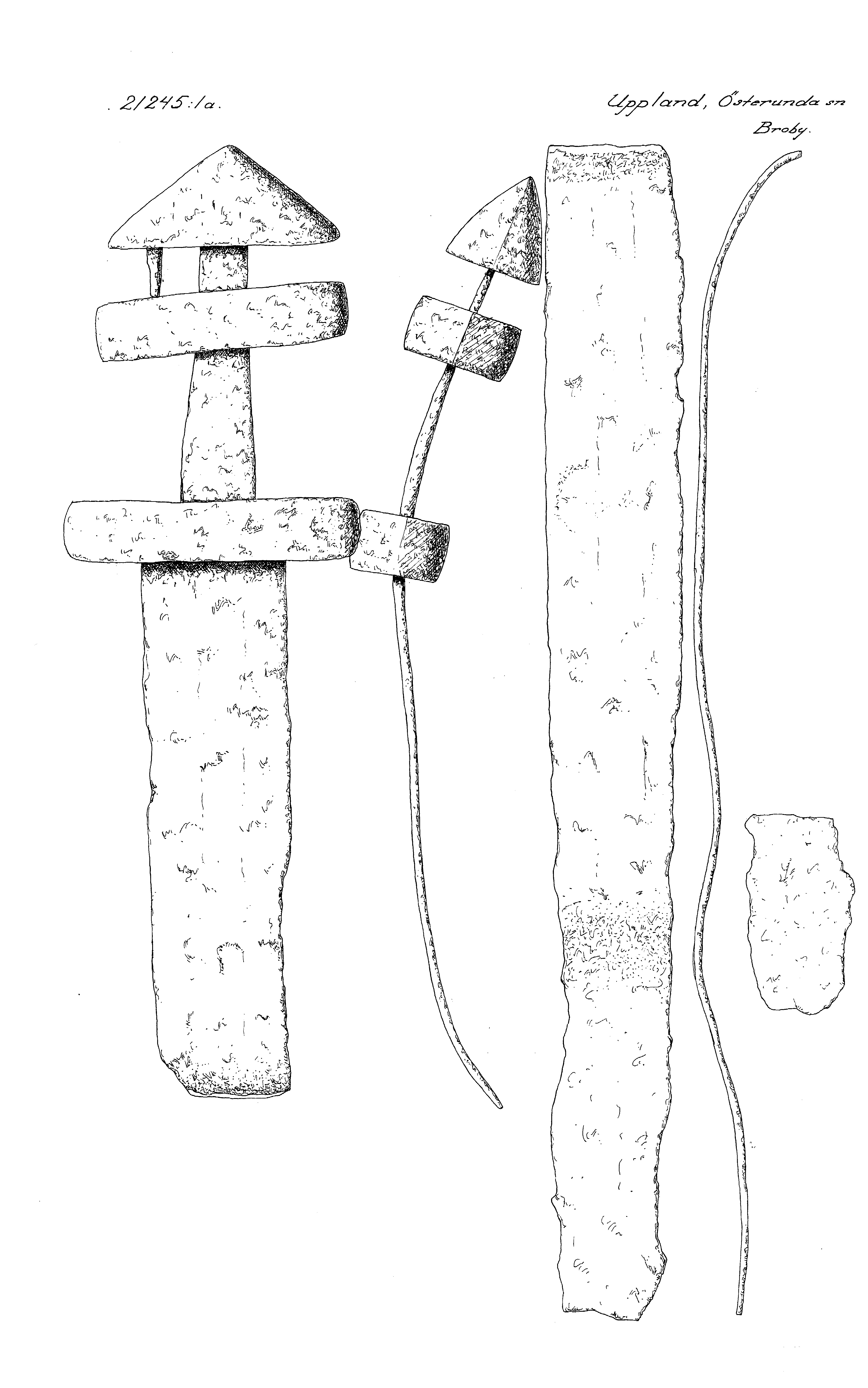 Klingan i tre delar. Svärdsknappen lös, med en kvarsittande nit. Svärdsknappen och hjalten dekorerade med smala streck.