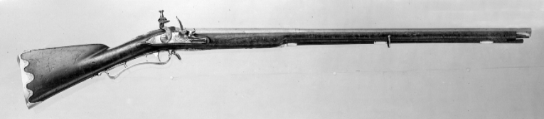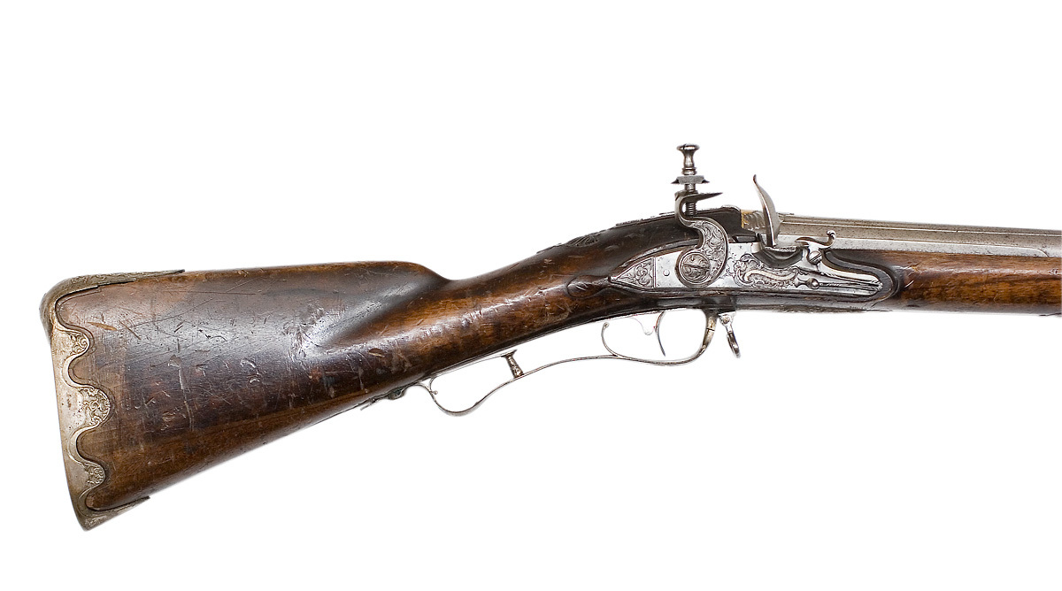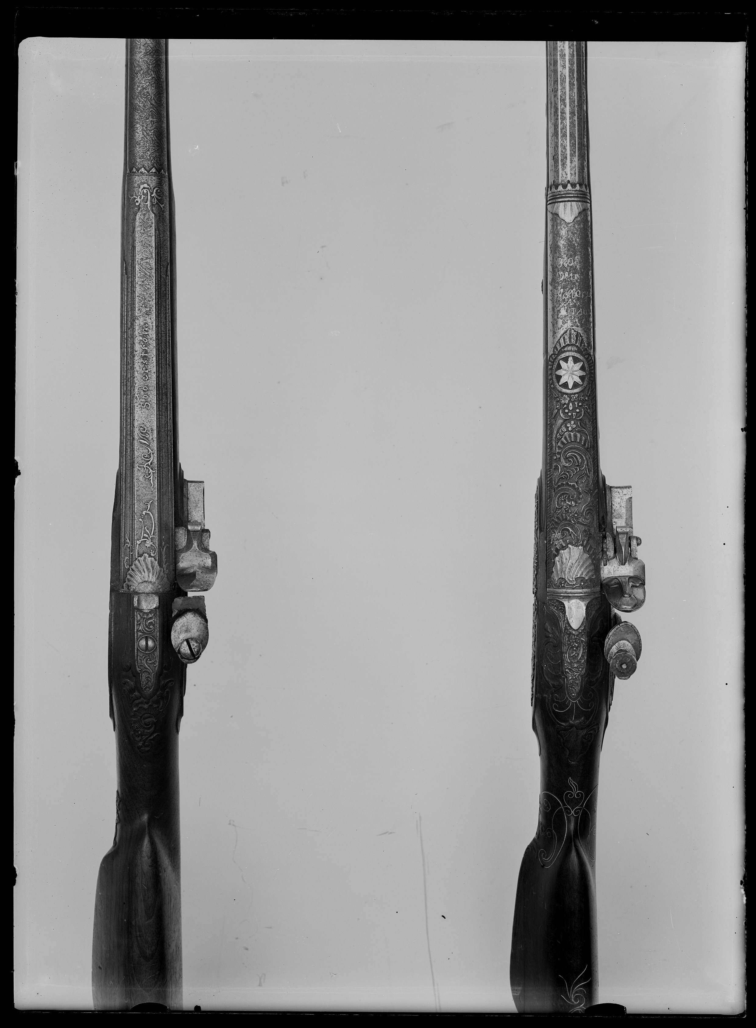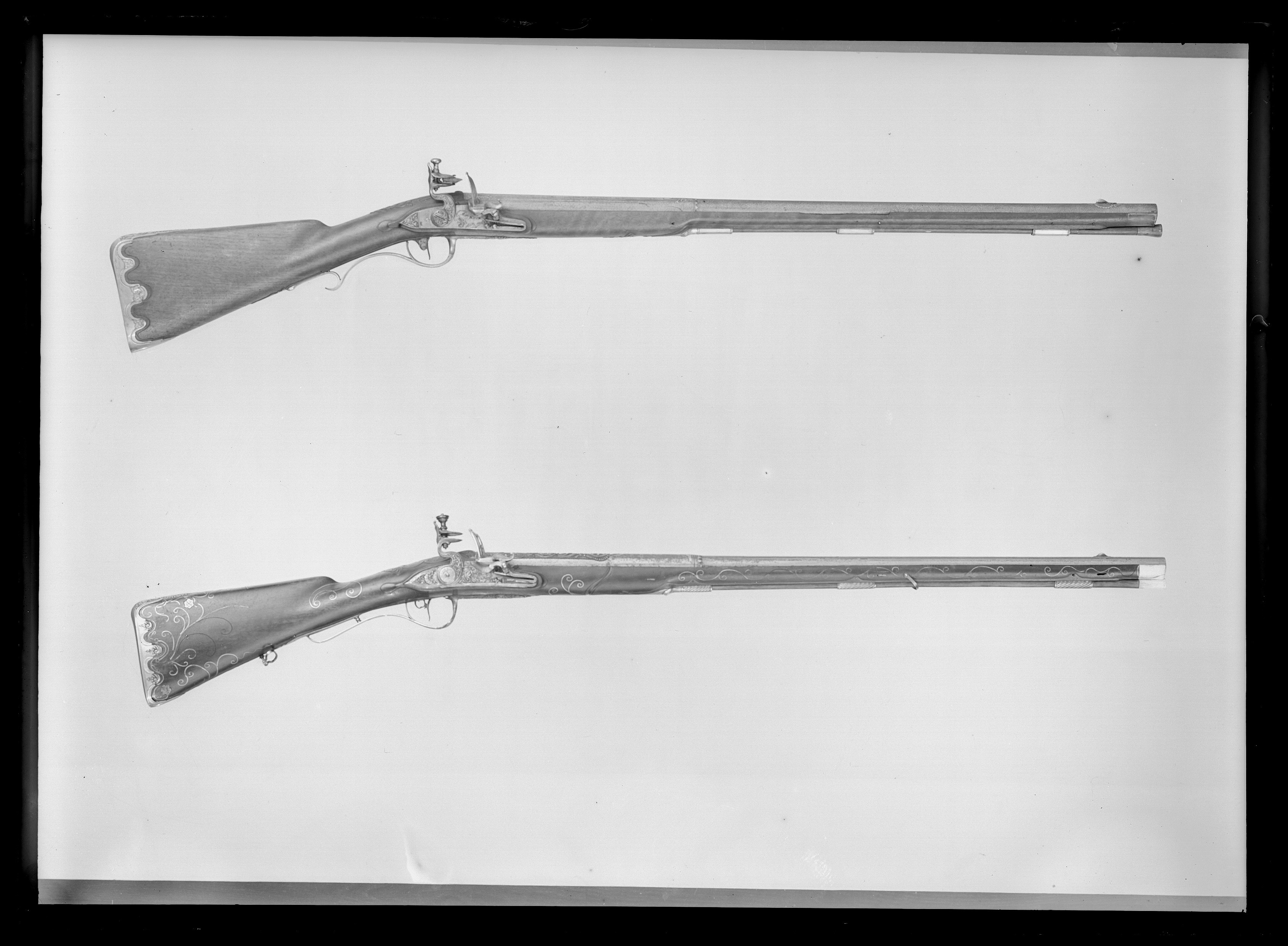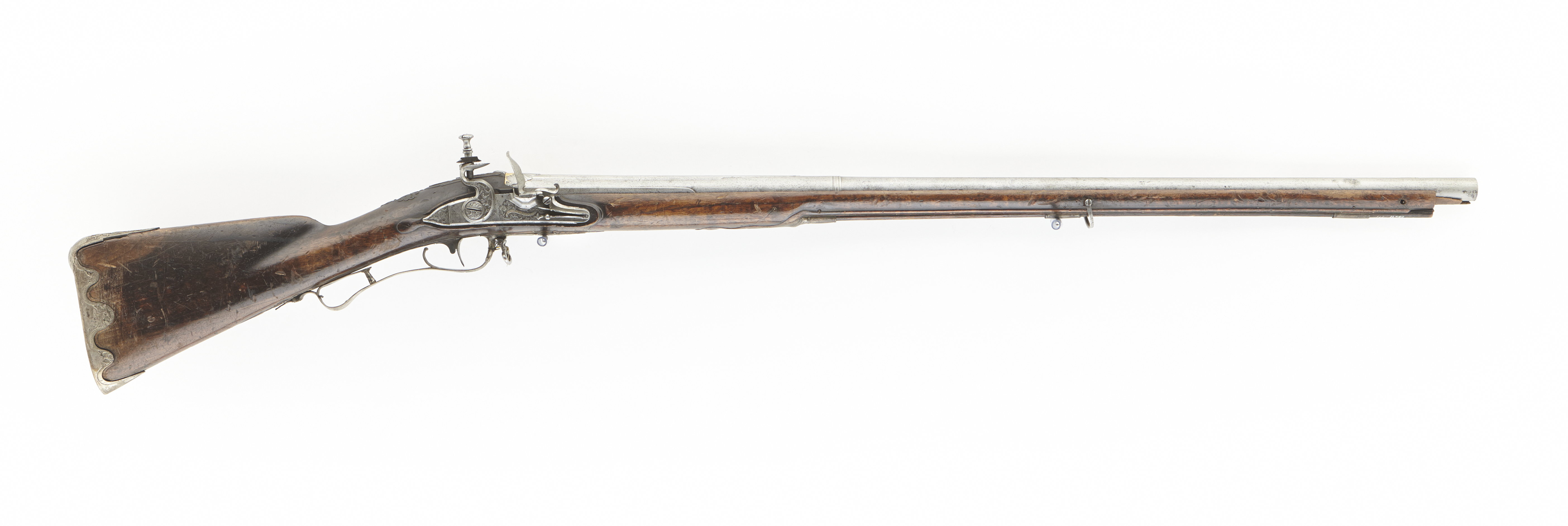 Rund, vid kammaren åttsidig, slätborrad pipa av stål, den övre fasens kanter profilerade. Vid pipbasen ett delvis förgyllt musselornament i stålsnitt, på fasen därframför rankdekor och signatur i guld: "J. M. Söderström". Svagt böjt, bakåt avsmalnande svansskruvblad med rankdekor i relief mot förgylld bakgrund. Riktmedel: Vid pipbasen en klack med ett skålat sikte. Fästning: Tre häften. Pipan fäst med krysskruv, bakre låsskruven genom svansskruvplattan, två pipstift av stål samt däremellan främre rembygelns skruv. Flintlås med plant låsbleck, fasade kanter, försänkt bakspets. Graverad dekor, framför hanen en rokoko-kartusch och däröver ett textband mot punsad bakgrund, guldtext: "I. M. S. A. MITAU". På bakspetsen ranka i stålsnitt mot punsad bakgrund. S-formig, platt hane med fasade kanter, på hane och nötskruv rankdekor mot punsad bakgrund. Lös överkäke. Käkskruv med skivformigt huvud, hangrenen avbruten. Kantig fängpanna med bred fals. Batteri med plant lock, fasade kanter, eldstål med konturerad mittås på ryggen, s-formigt svängd häl. Batterifjäder med delvis fasade kanter, kort, urneformigt fjäderlöv. Blånerad nöt. Fästning: Två låsskruvar. Böjd avtryckare. Konturerat avtryckarbleck av stål. Helstock av svartbetsat trä, kolv av fransk typ med kindstöd. Snidad bladdekor vid kindstöd, svansskruvblad och spetsrörka. Beslag av silver. Bakplåt med vågformigt svängda kanter på kolvsida, rankdekor på spetsarna. Konturerad flik på kolvryggen, rokokodekor i relief .På insidan åldermansranka samt ristat (otydligt): "A Mah // gog // Jezus Marya // Jusef"(?). Två konturerade låsskruvbrickor med rokokodekor i relief mot punsad bakgrund. En + två släta rörkor, triangulär spets. Näsbandet saknas. Varbygel med konturerad främre arm, på spetsen rokokodekor i relief. Rund främre stolpe, på bygeln reliefdekor, fri bakre stolpe, ände i form av bladknippe. Framför framstolpen en rembygel av stål. Nedanför kindstödet målat med vit färg: "N:o 8". På kolvhalsens v. sida en smutsig pappersetikett. Tillbehör: Laddstock av trä, l: 840mm, baktill ett stålbeslag med krats, l: 70 mm.