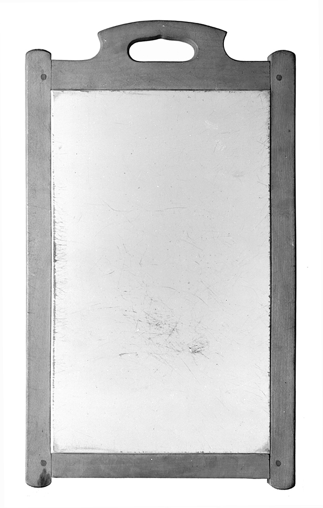 SKÄRBRÄDE Av porslin och trä. Bestående av en rektangulär vit porslinsskiva, infattad i en ram av vitbok; skivan glaserad på båda sidor; ramen hoptappad i hörnen, med tvärstyckena gående mellan långstyckena, dessa med ändarna rundade samt utskjutande utanför tvärstyckenas ytterkant; övre tvärstycket på mitten med ett bågformigt utsprång, vari ett avlångt hål som handtag; i varje hörn en fästpinne. Längd: 46,5 cm.; bredd: 27 cm. Tysk tillverkning, Wächtersbach i Hessen-Nassau.