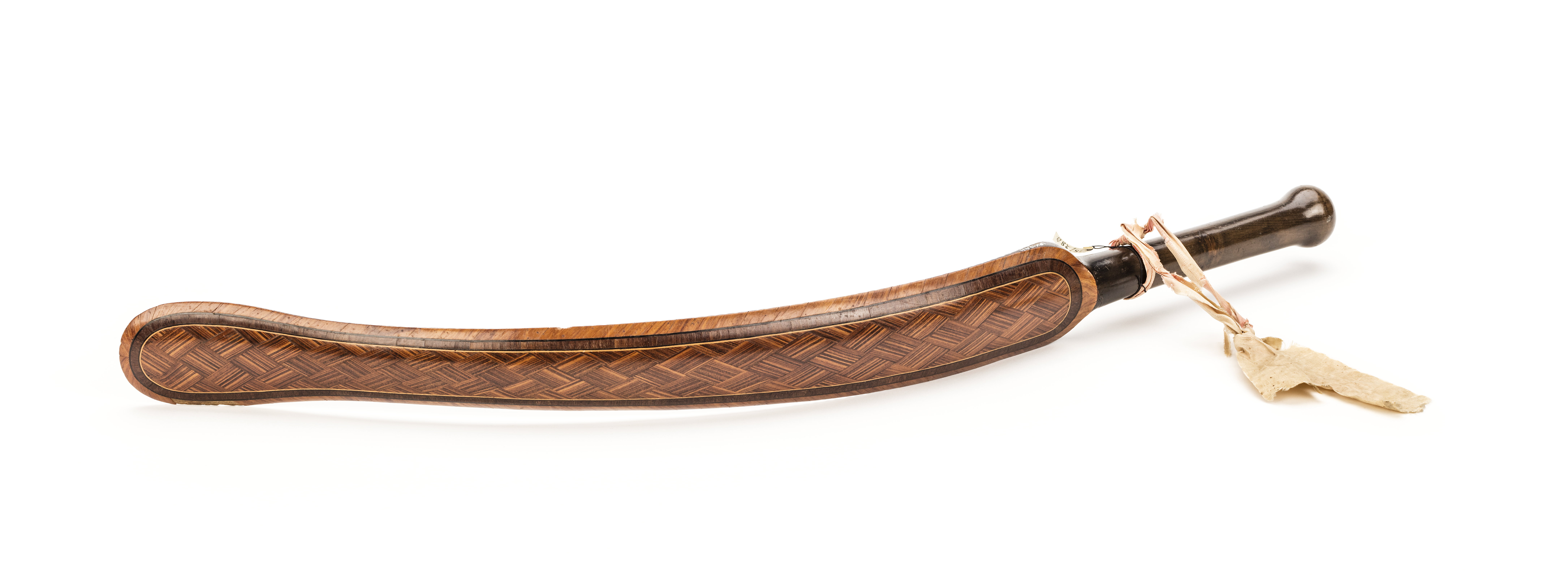 Böjt trästycke av mörk betsad björk med svarvat handtag avslutat med kula. Där framför ett stycke avsmalnande mot ytteränden, där åter breddad, änden rundad. Undersidan plan och skårad av diagonala skåror till pyramidformiga spetsar. Ovansidan svagt rundad och täckt av fanér av olika träslag, i mitten fält med flätmönster med rombiska rutor, av kraftigt ådrad mahogny, där utanför smala lister av vitt och svart trä, björk och ebenholts, en bård av kubamahogny med ådringen radiellt ordnad, ytterst kant av ljusare trä, zapelimahogny. Om skaftet bundet ett rosa (rött?) sidenband, nu mycket blekt och trasigt.