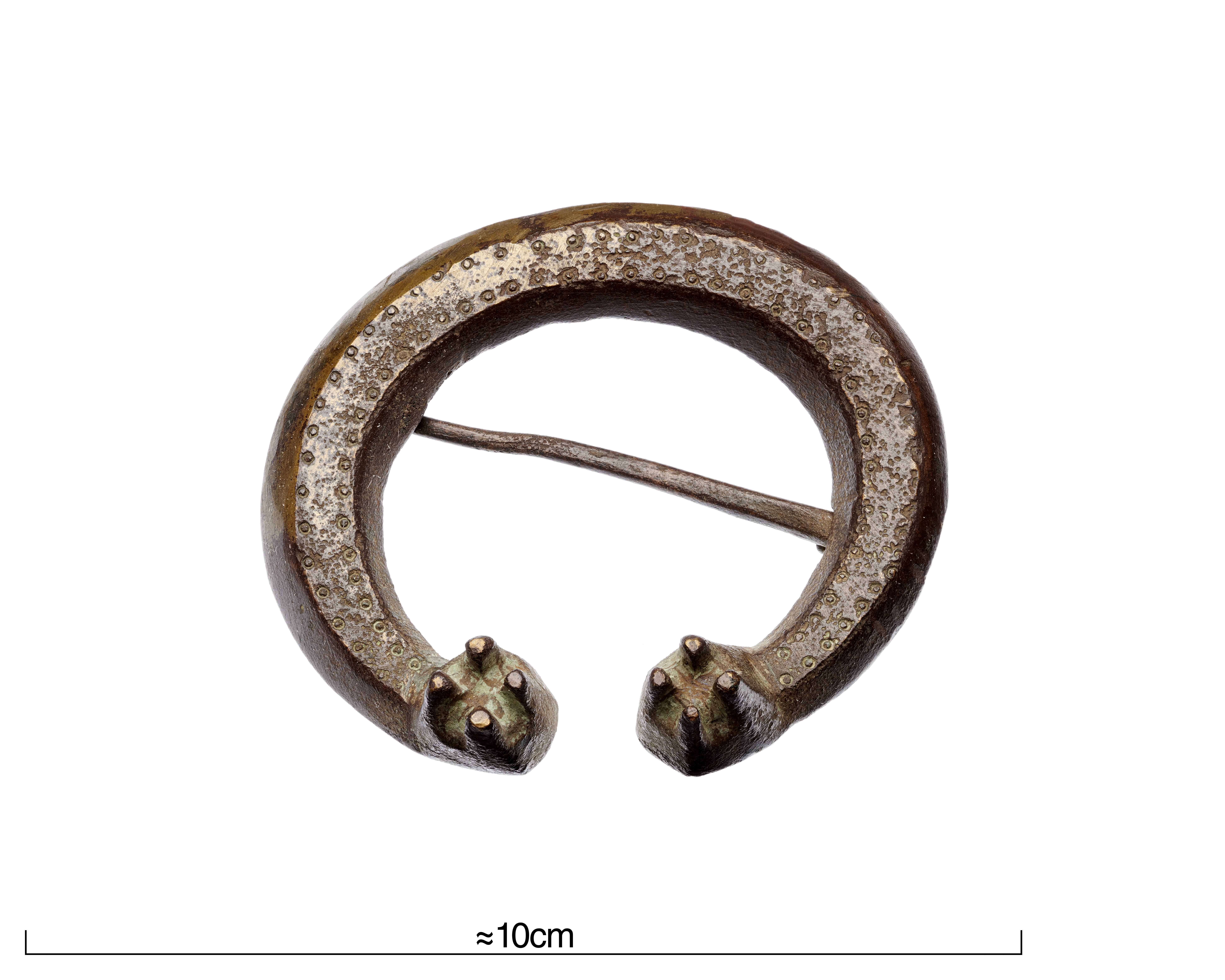 Ringspänne av brons med plan och slät baksida. Framsidan är delad i tre plan, av vilka det breda mellersta är är prytt med en rad små inpunsade glest ställda kretsar.
