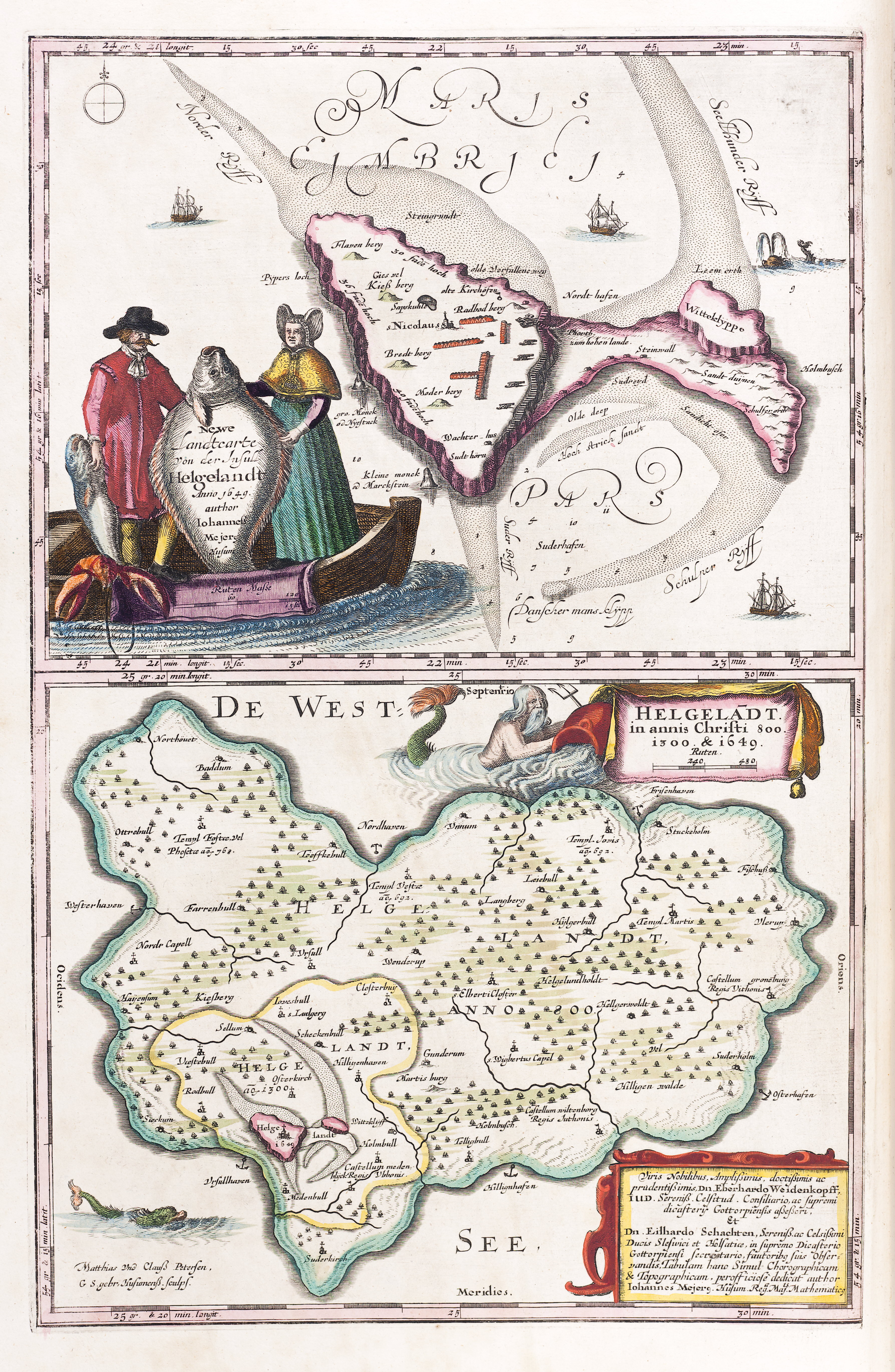 Två delkartor: a. [Newe Landtcarte von der Insull Helgelandt Anno 1649. author Johannes Mejero Husum] b. [Helgela´dt in annis Christi 800, 1300 & 1649] [Matthian Und Clauss Petersen G.S. gebr. Husumenss. sculps.] Dedikation av [Iohannes Mejerus, Husum. Regae. Majis. Mathematicus.]