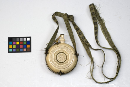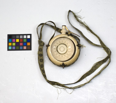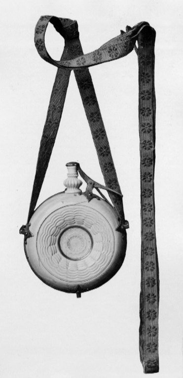 Ringvulstformig behållare av elfenben med passigsvarvad dekor, i mitten en rund platta med blomformig dekor. Tre fastskruvade rembyglar av förgyllt silver. Svarvad, balusterformig, kannelerad pip. Yttre ventil med musselformig platta, lång hävarm samt fastskruvad ställning av förgyllt silver. Fastskruvad fjäder av stål. Tillbehör: Igenom byglarna draget en ca 2000 mm lång och 11 mm bred, ihopsydd, vävd bärrem av grönt silke med blomformiga inslag av silvertråd. Remmen av-kortad med en enkel knut.