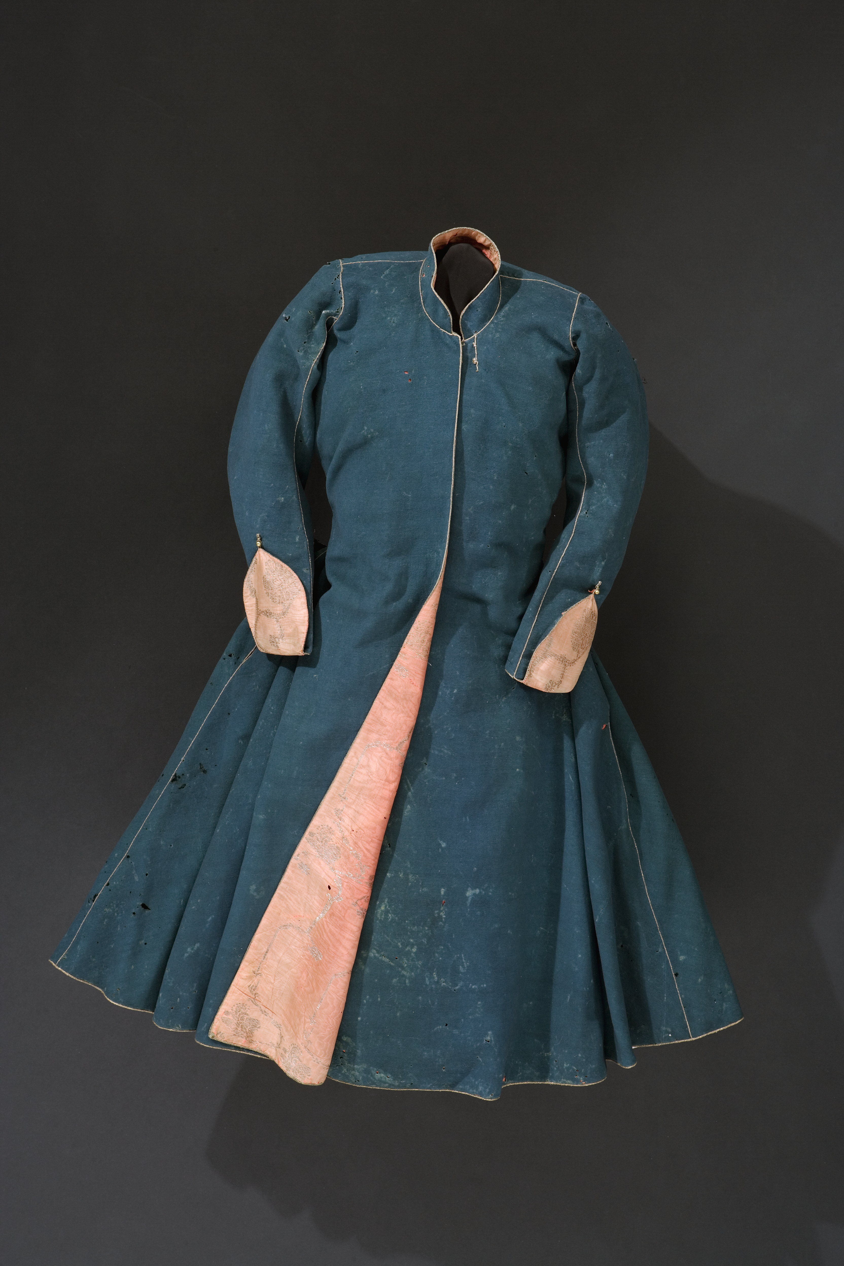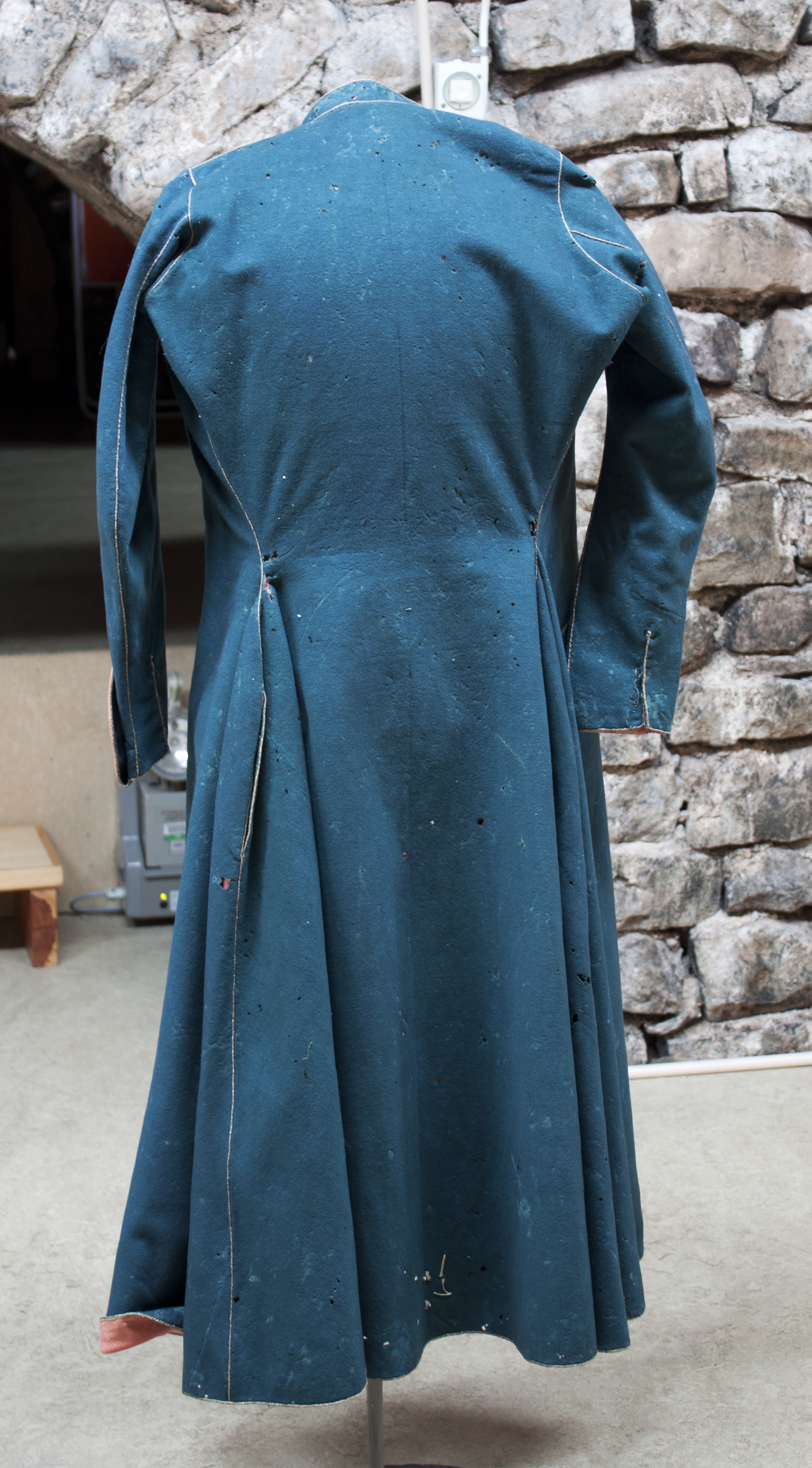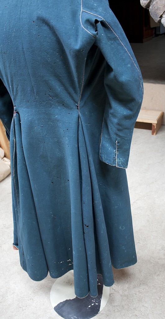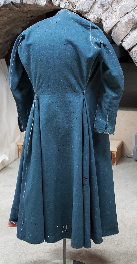 Lång rock av blågrönt kläde, fodrad med rött siden med broderade guldblommor som stående rankor. Rocken har en mycket snäv midja och en vid nederdel. Bakstycket är helskuret med ett smalt, jämnbrett skörtparti. Från midjan och ut mot sidorna har triangulära stycken tillfogats för att ge plaggets nederdel dess vidd vilket ger en fullständig rörelsefrihet. Långa smala ärmar, 710 mm, som nedtill avslutas i manschetter, som tungor, nedfällda över handen. En liten ögla av guldtråd fäster manschetterna då de fälls upp och på ärmarna sitter små fästanordningar av guldlgalon med en liten förgylld pärla av metall. Rocken har en låg ståkrage, 36 mm, avfasad i kanterna. På insidan vid halsen är påsytt ett vitt nät. Rockens högra framstycket går omlott och knäpps över det vänstra framstycket med en dold knäppning. Längs rockens ytterkanter löper ett tvinnat guldfärgad silkessnöre. Tagen som krigsbyte vid slaget vid Narva den 20 november 1700. Rocken lämnades in till Kungl. Klädkammaren den 22 augusti 1707 som minne av segern vid Narva. I förteckningen över 1720 års Klädkammarinventarium upptagen som: "mörk grön Rysse Rock, halft fodrad med Rödt Thubin och guld blommor uti med guld lit quarder i sömarne".