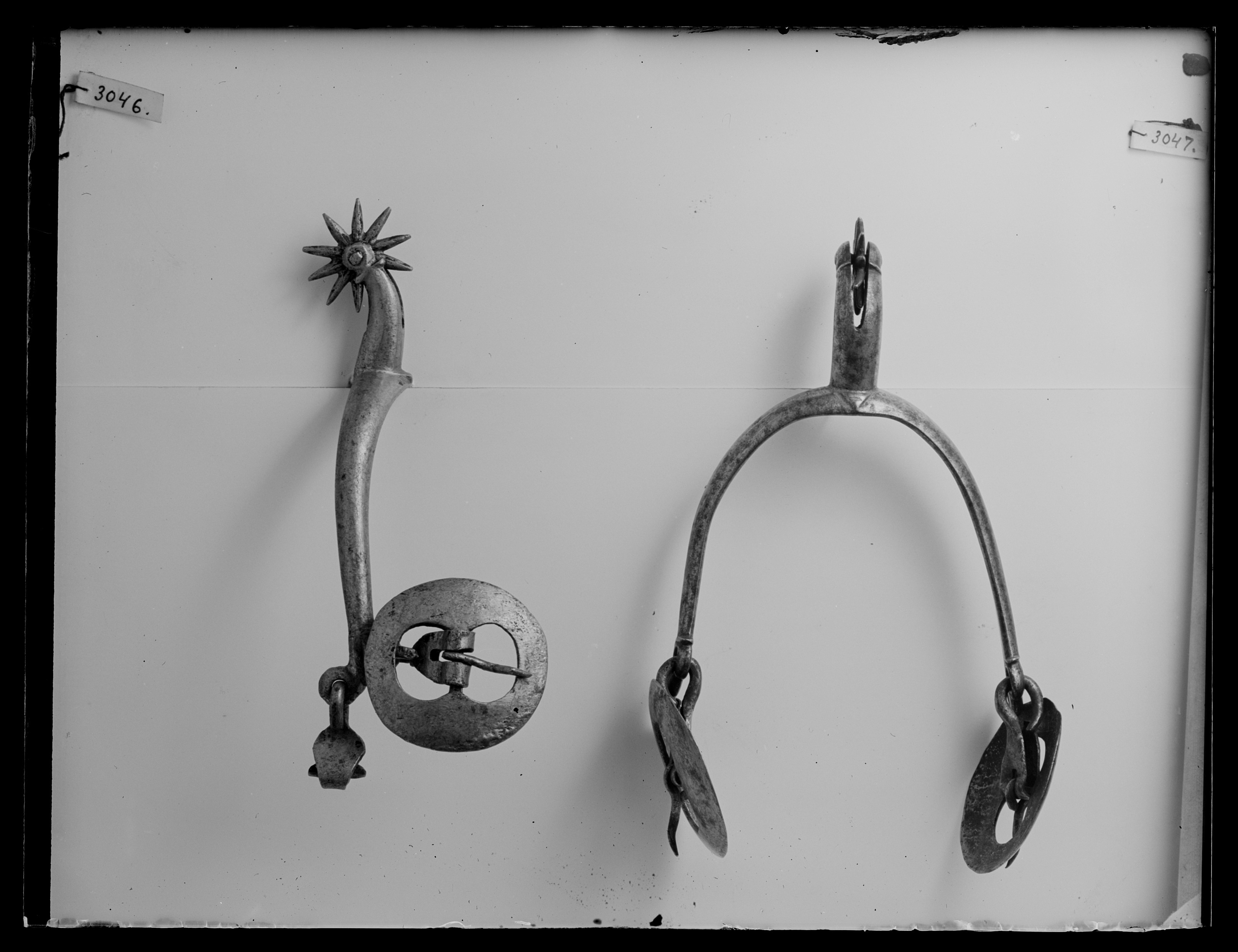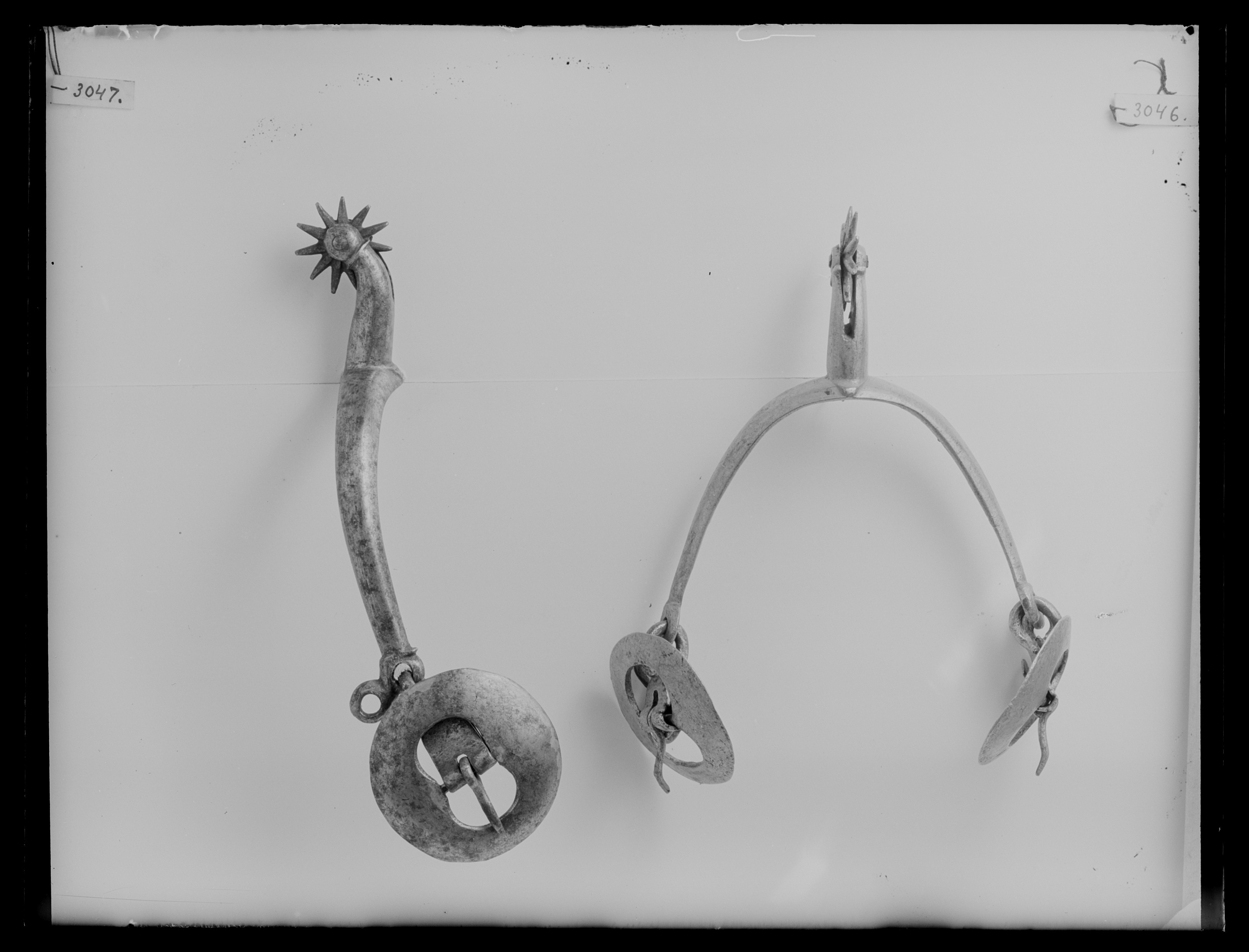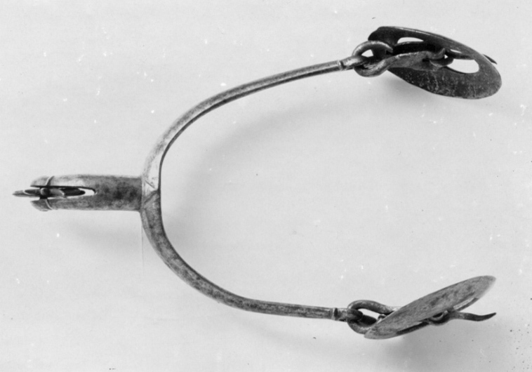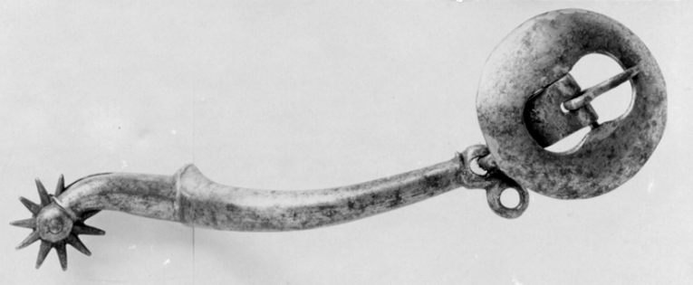 Sporre av stål med rester av förtenning. U-formade skänklar, 42 mm lång nedåtböjd hals och 11-uddig klinga. Skänklarnas ytterändar i form av två ringformiga hållare för stora, runda,välvda remsöljor med bred kant.