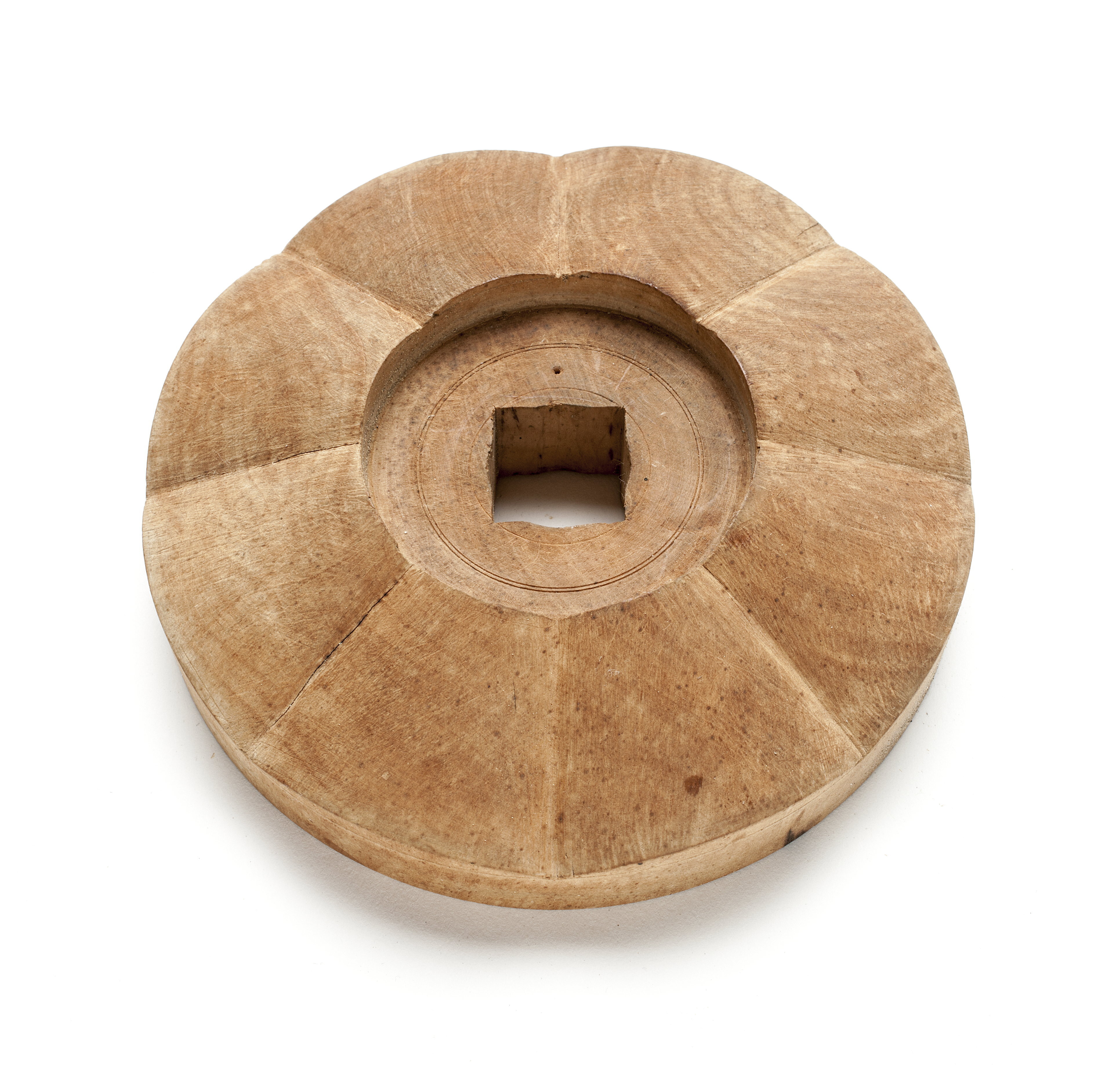 Ena sidan plan, den andra har åtta radiella vulster samt rund fördjupning för spindelhylsan, diam 60 mm. Kvadratiskt hål, 22 mm sida. Med rödkrita skrivet: "1".