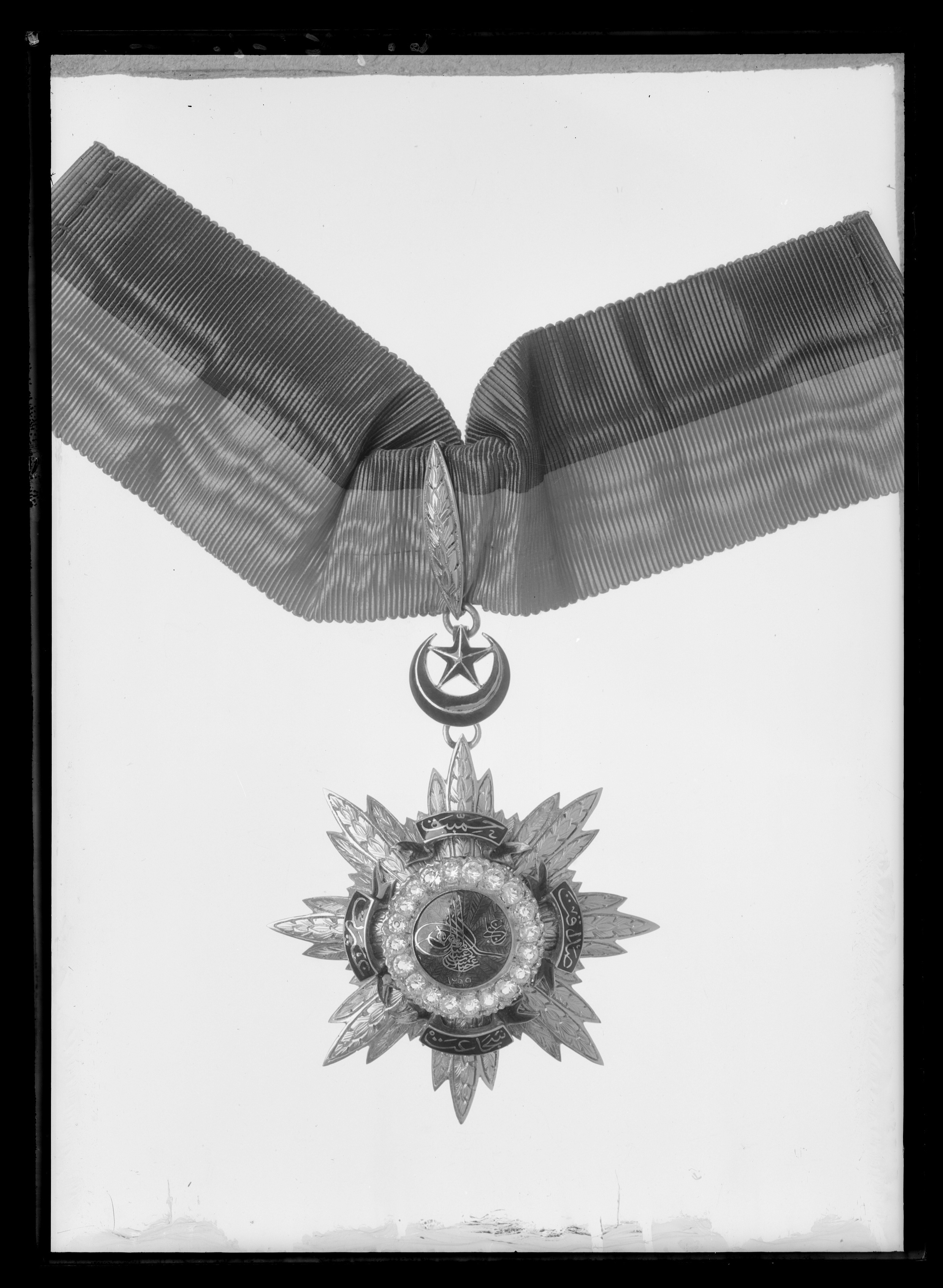 Åttauddig strålstjärna av guld med välvda bladknippen om fem blad med graverad dekor, över fyra av knippena fäst ett grönemaljerat skriftband med turkisk text i guld (fosterlandskärlek, idoghet, tapperhet, trohet). Svagt välvd, grönemaljerad medaljong med sultanens toughra i guld. Däromkring ring av 18 briljantslipade glasbitar, guldfattning à jour. På det översta bladet en fast ring, däri fäst på framsidan grönemaljerad, fasetterad halvmåne och femuddig stjärna. På månens baksida en rörformig bygel, däri fäst ett spetsovalt blad av guld med graverad dekor, på baksidan en bygel, i vilken bandet (nr 1409) är fastbundet.