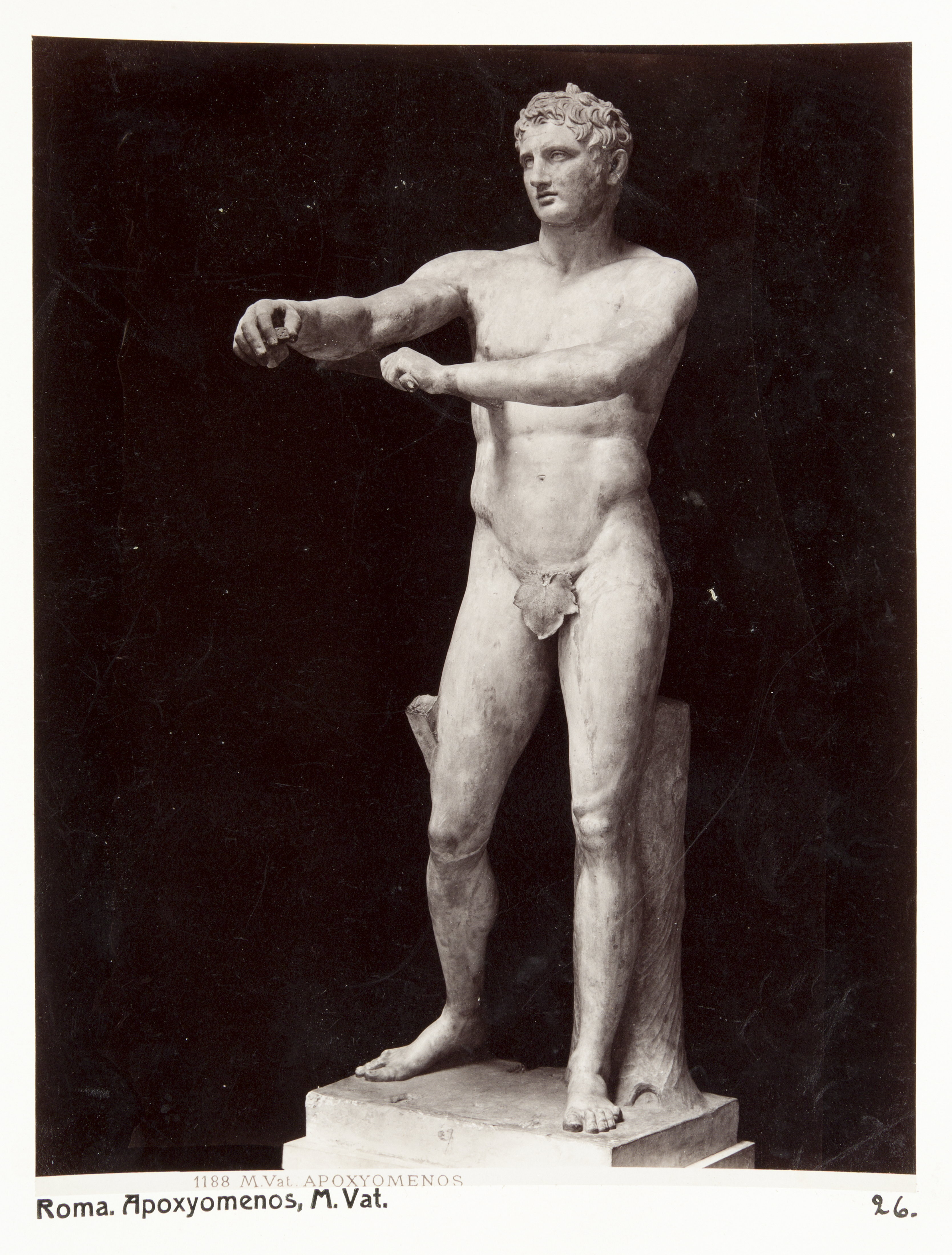 Apoxyomenos, Vatikanmuseerna. Rom, Italien. Fotografierna LXVI:K.G.01.-193. är inköpta av Johanna Kempe, f. Wallis, i Rom, Neapel, Taormina, Syracusa och Palermo vid hennes vistelse i nämnda städer tillsammans med sin dotter och svärson, Wilhelmina och Walther von Hallwyl, dotterdottern Irma samt fröknarna Caroline Pflaum och Ida Uhse unde rderas resa till Rom och Neapel, genom södra Italien och Sicilien samt åter över Schweiz, 28 januari - 24 maj 1888. Förestående uppgifter lämnade med ledning av fröken Ida Uhses Reseanteckningar.