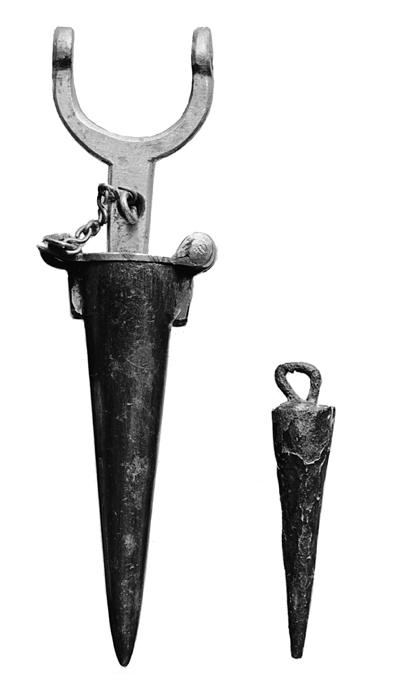 PIPJÄRN (till rundkragar) med lod. Av järn. Bestående av en konisk hylsa, på vars bas ett lock fällbart på ett gångjärn vid ena sidan, vid den motsatta en utstående klyka, avsedd för en från hylsan uppskjutande ögla för en sprint. I lockets mitt en rakt uppstående bågformig gaffel Längd: 16,1 cm, bredd: 4,5 cm. Lod: Av järn, konisk, grovhamrad på övre ändan en rundstavig ögla. Längd: 7,5 cm, diameter: 1,6 cm. Överförd av Wilhelmina von Hallwyl 1916 från säteri Ericslund till Hallwylska huset, Stockholm.