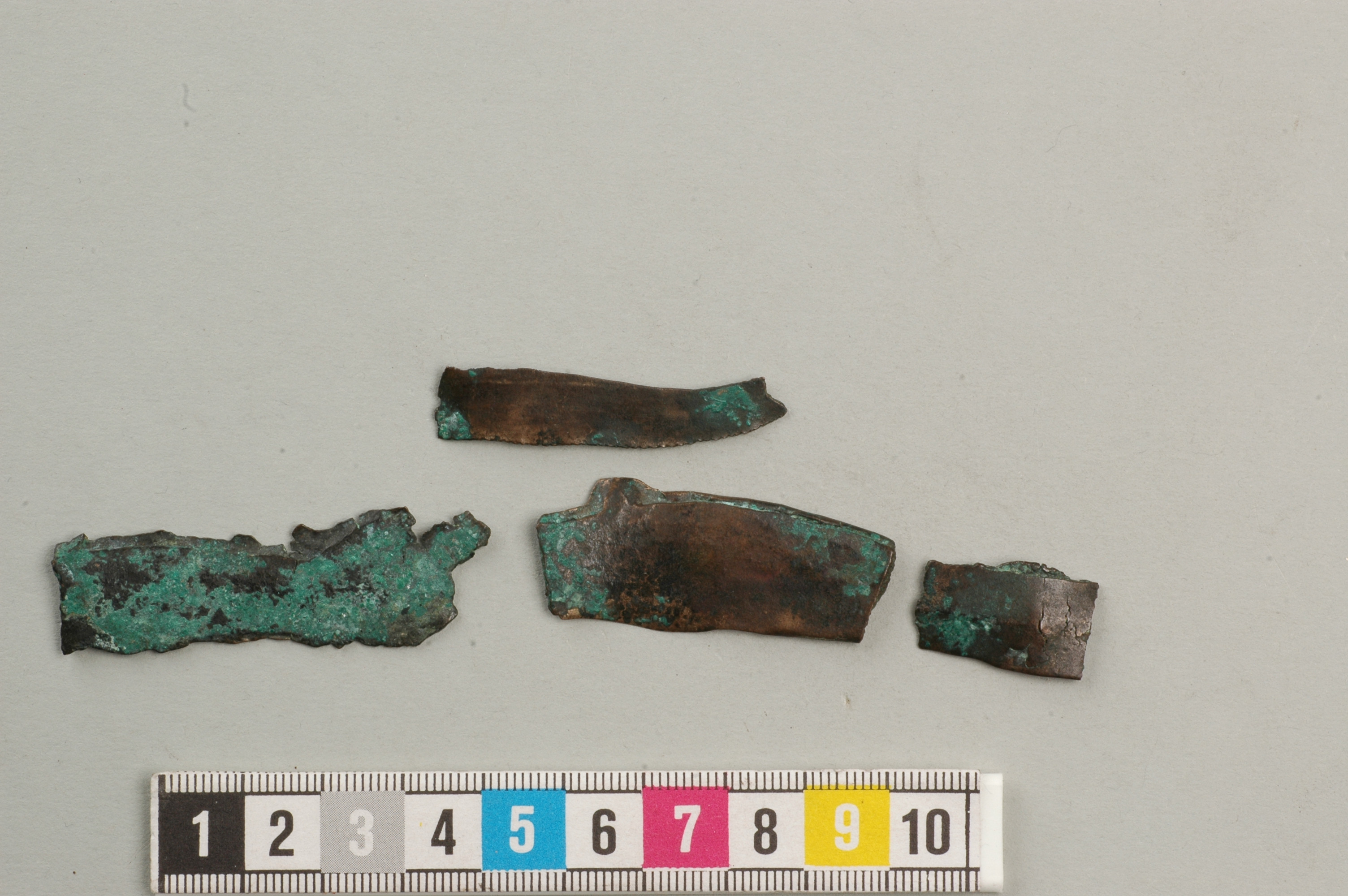 Fem fragment av skäror av brons med fästetaggar på ryggen.
