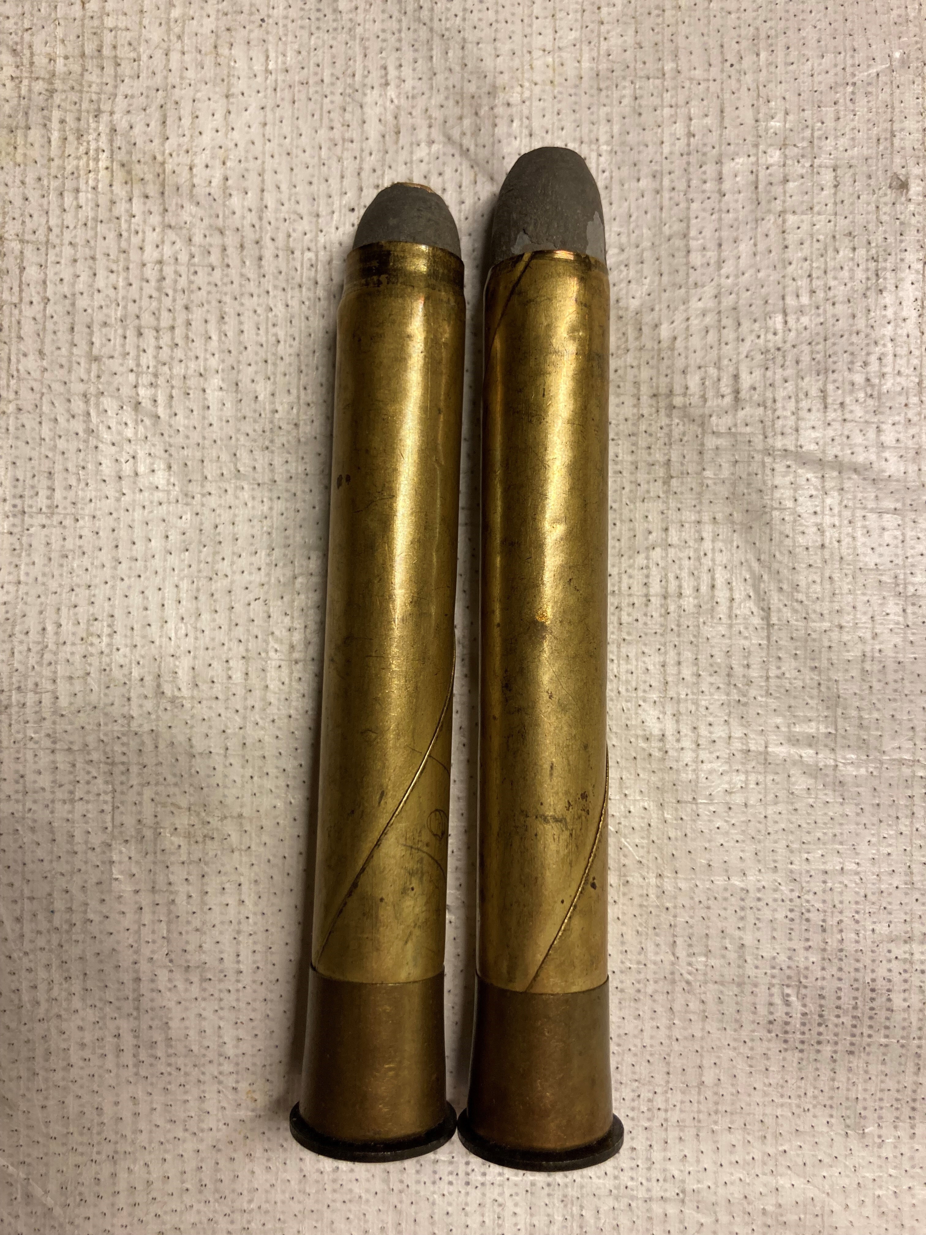 Gula liggaren: PATRONER, två stycken av mässing, med blykula, Boxers konstruktion. Express-patroner, engelsk kaliber .450. 1860-talet.
