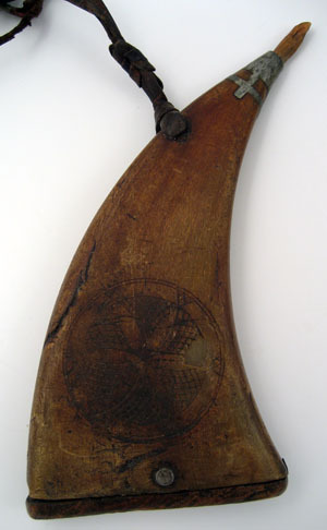 Av brunt flatpressat kohorn med svängd, uppåt avsmalnande form . Nertill botten av träplatta, långsmal med rundade kanter. Fäst i sidorna med tre nitar. Upptill i ryggen ett hål med fastknuten läderrem, l 150 mm, andra änden fäst i mässingsring på kruttyget. Pip av vitmetall med neråt fyra tappar med tvärslå, inlagda i träet. I pipen nerstucken träplugg, l 57 mm. På bägge sidor skuren dekor av likformade fält med rutnät, på ena sidan inom cirkel.