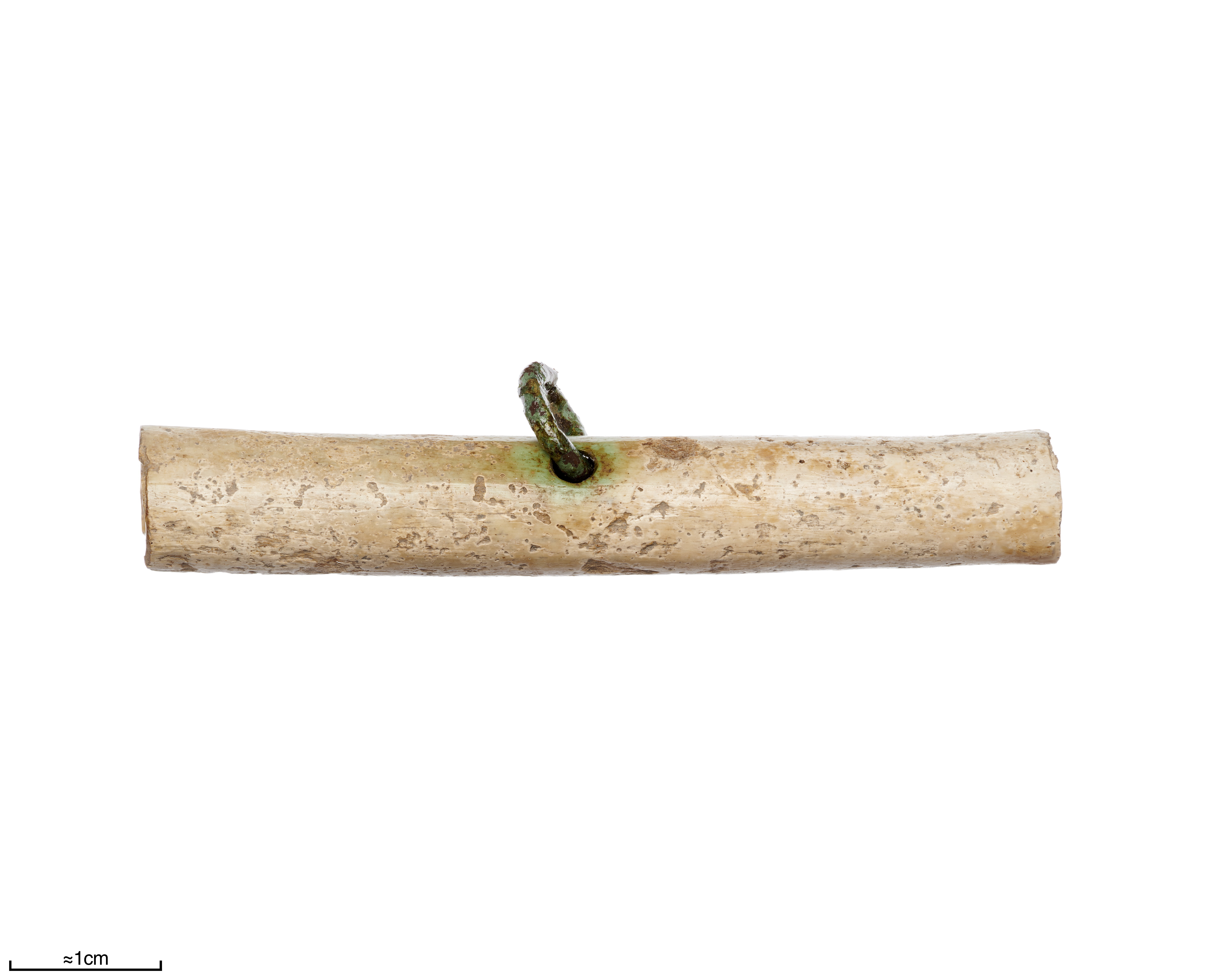 Nålhus av rörben från fågel med ring i kopparlegering.