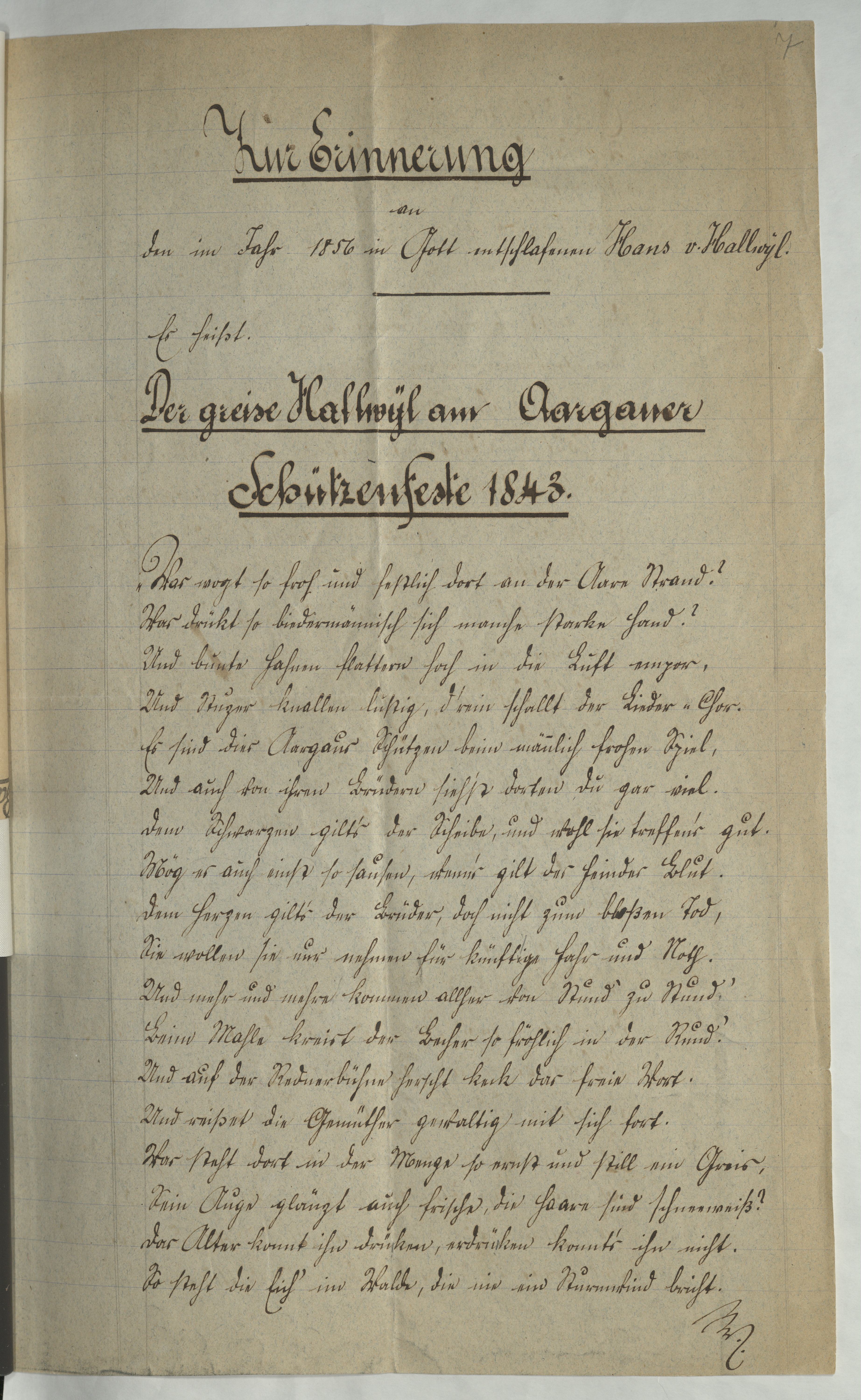Från katalogverket: BIOGRAFI OCH GENEALOGI. Genealogi och personalia. Dödsfall. Hallwyl, Hans v. Verser »Zur Erinnerung an den im Jahr 1856 in Gott entschlafenen Hans v. Hallwyl». 4 s. Fol.