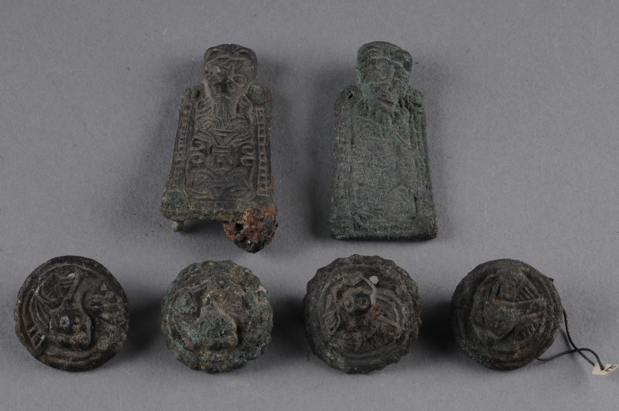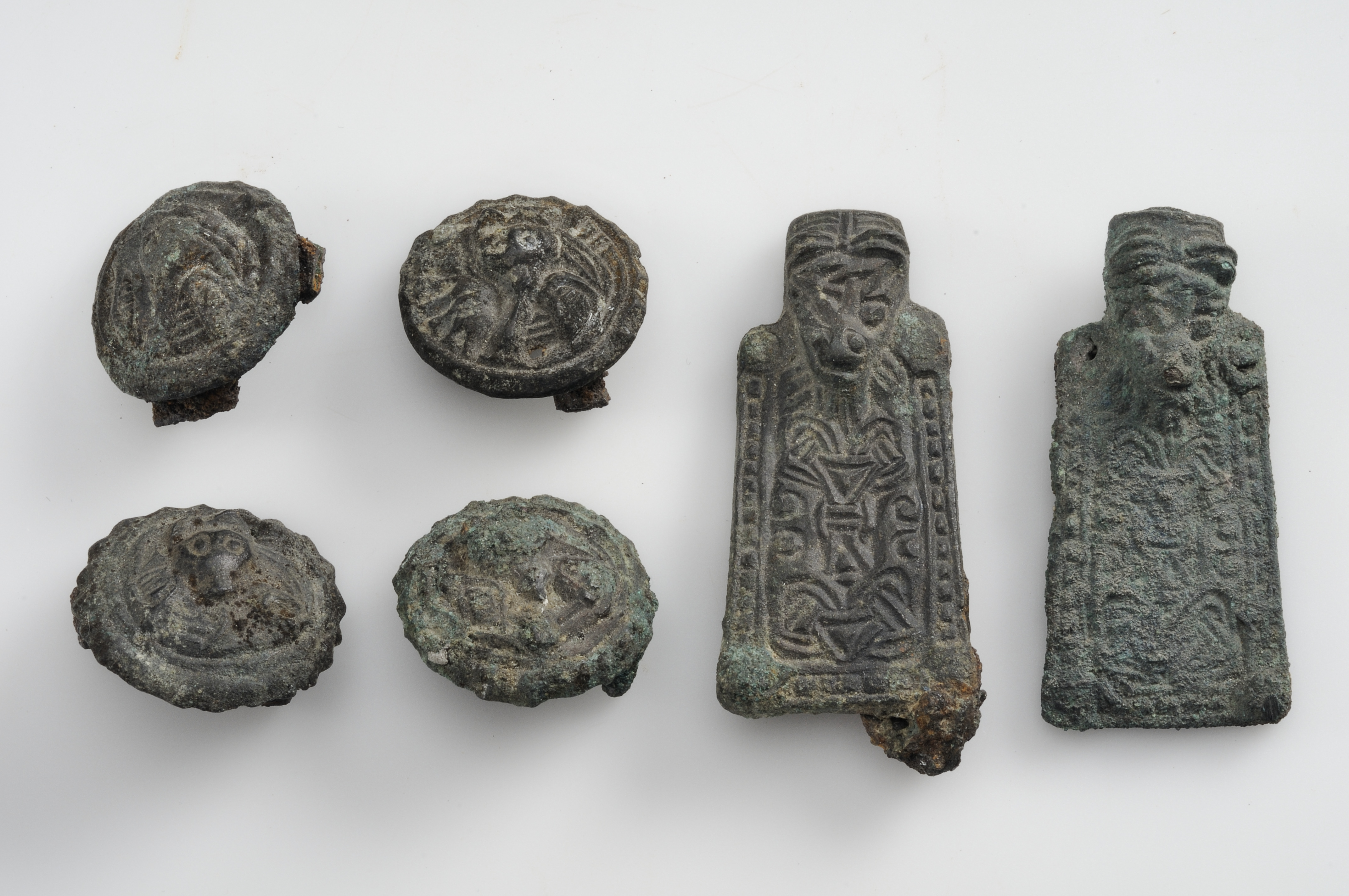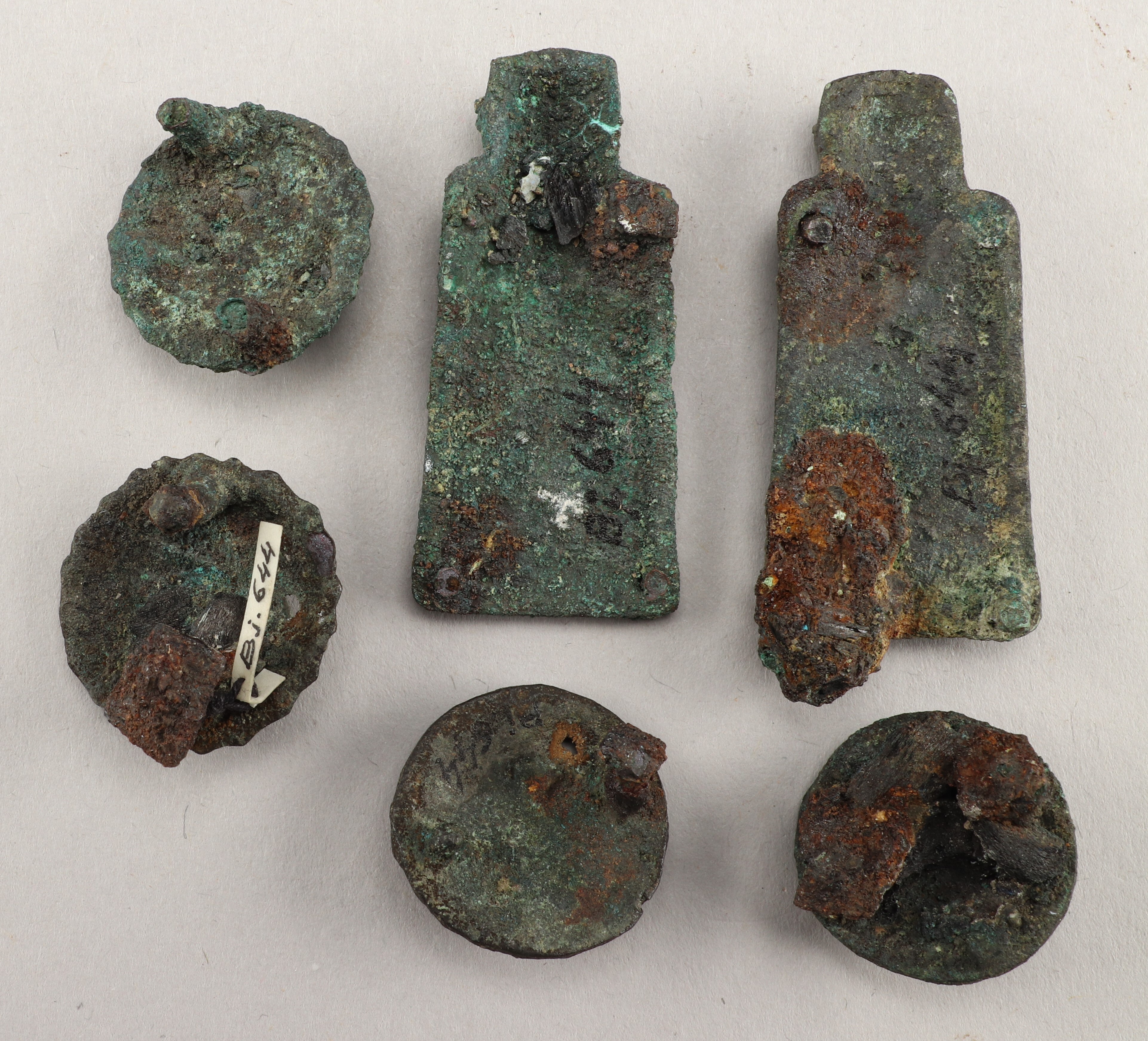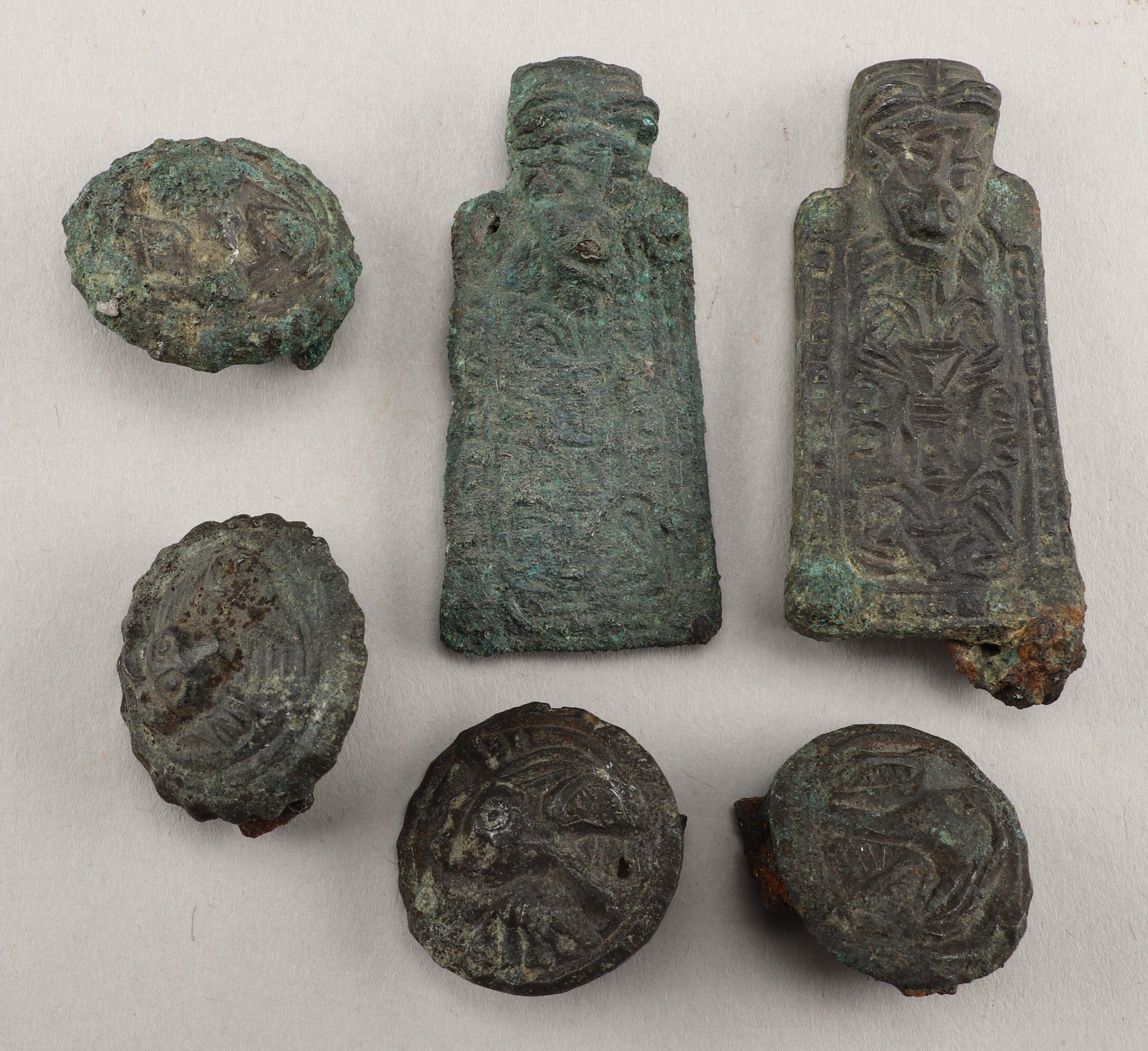6 betselbeslag av brons - 4 runda och 2 avlånga. Samtliga i Borre-stil.
