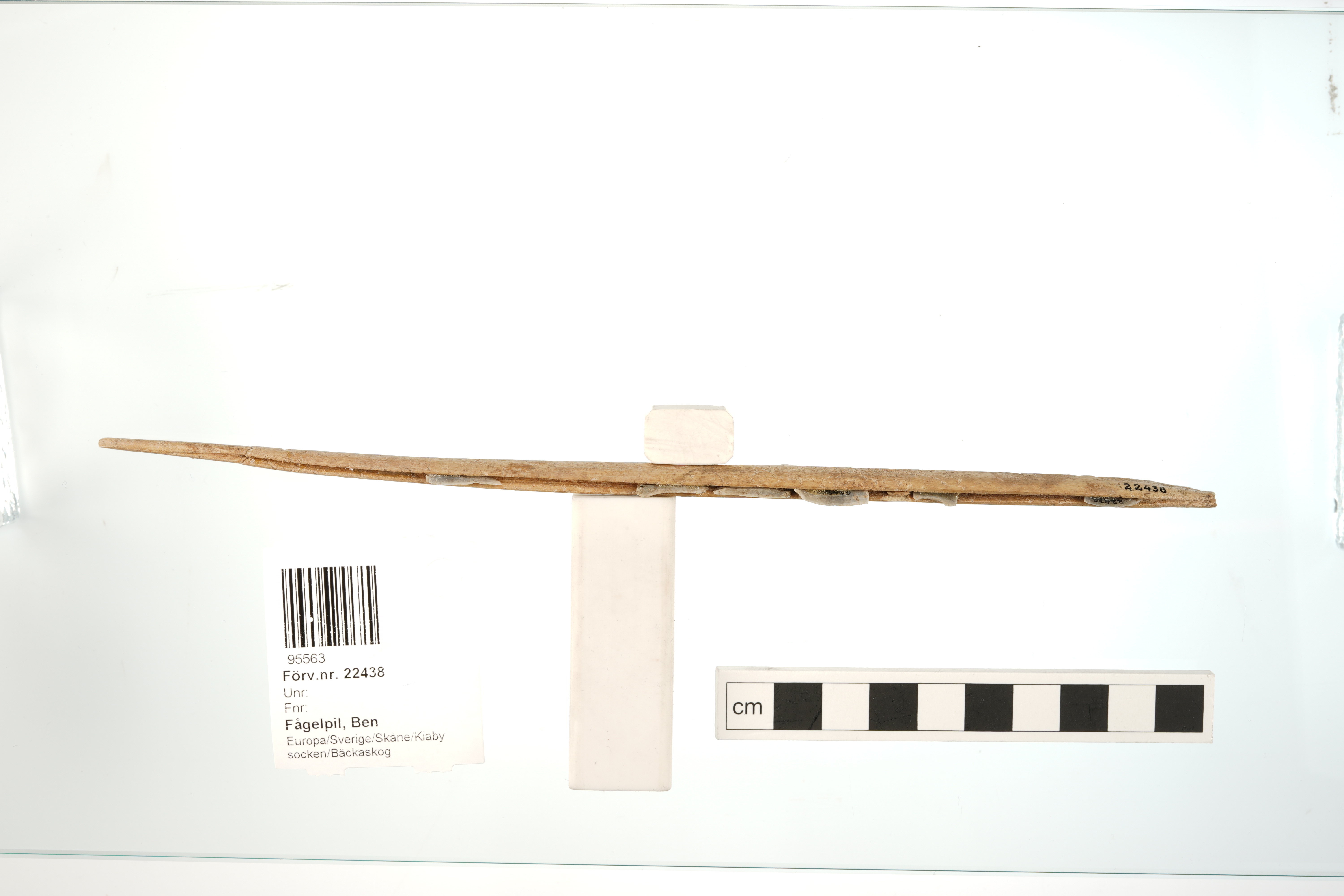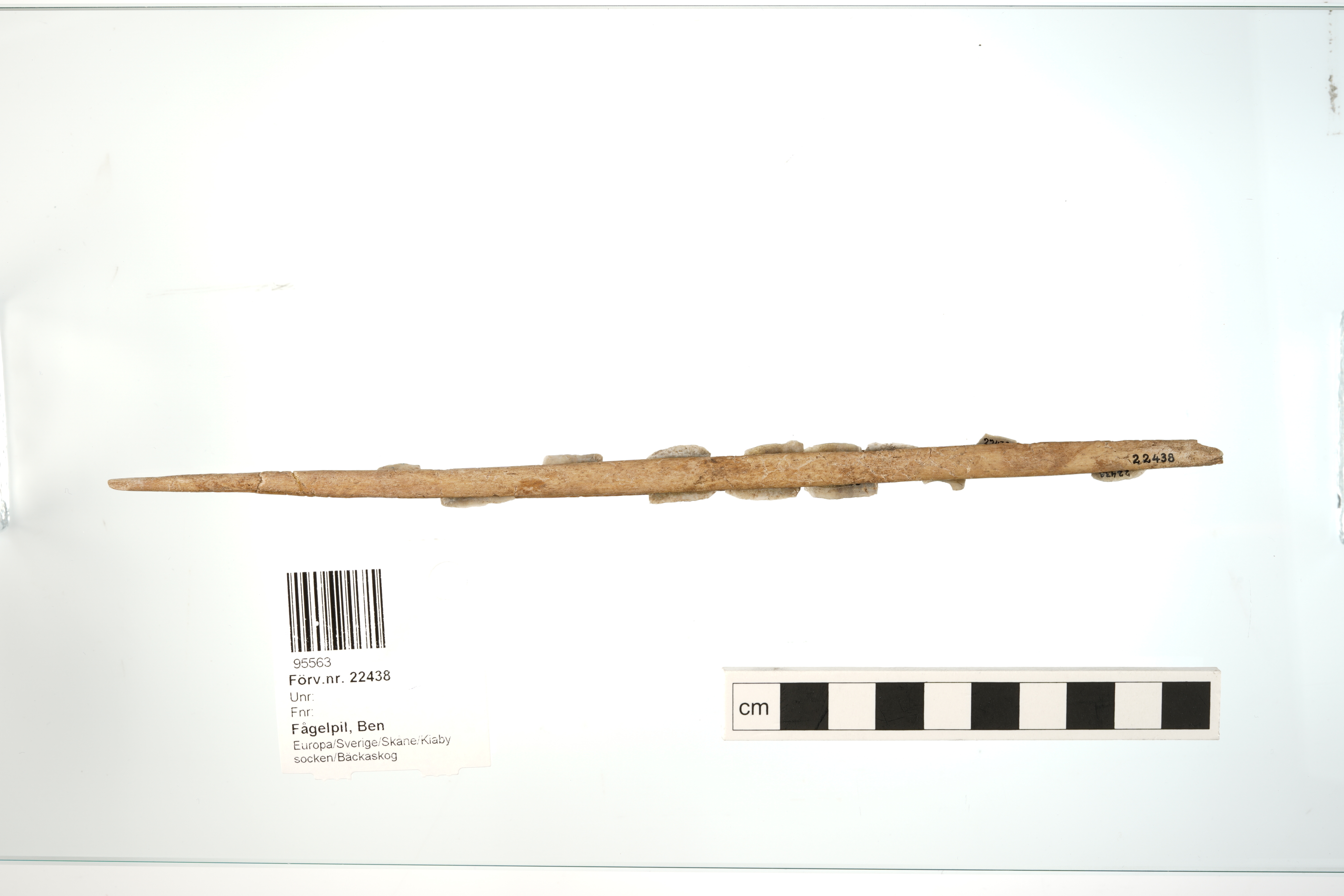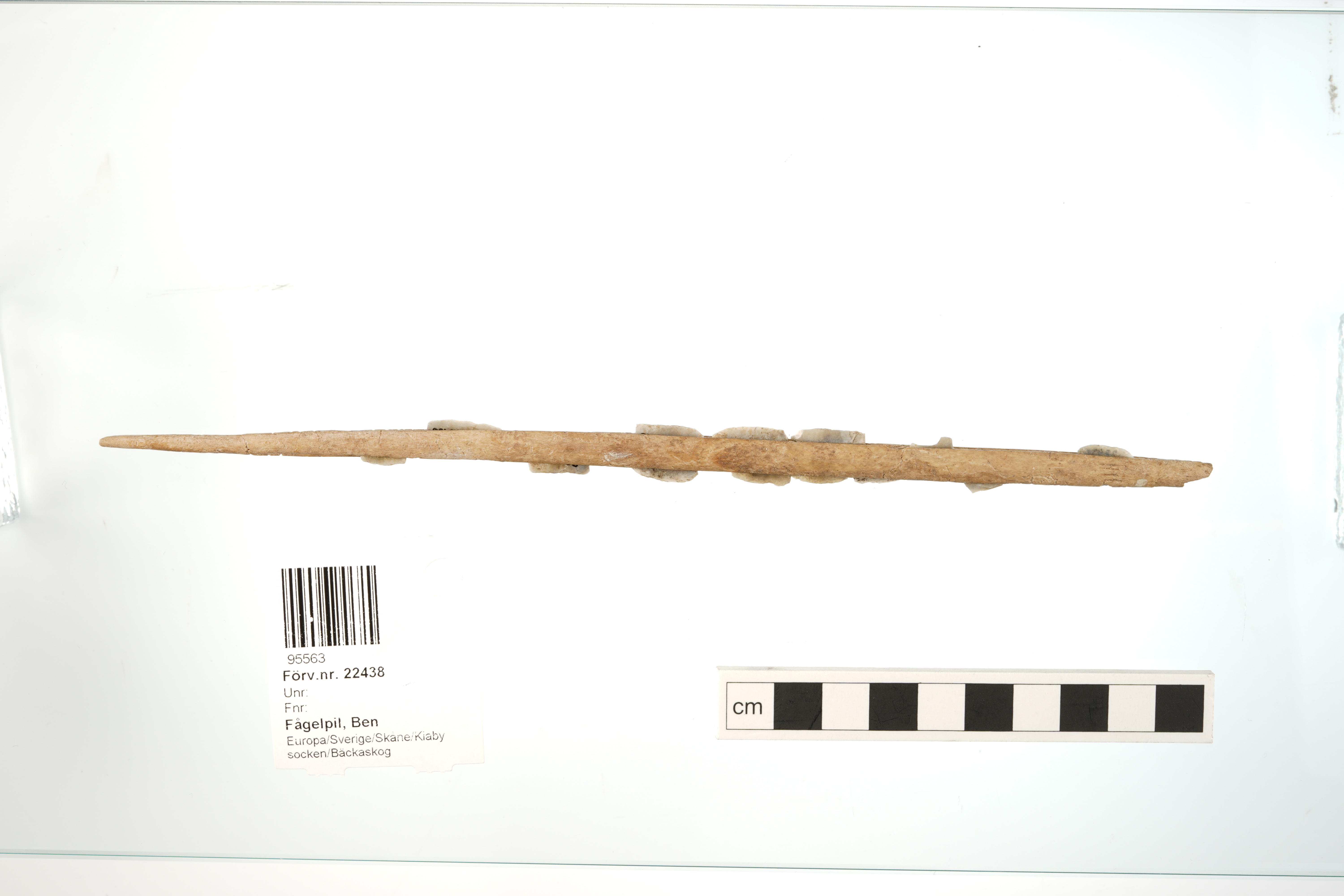 Flinteggad benspets som påträffades som gravgods i Barumskvinnans grav. Mikrospånens placering är rekonstruerad i samband med att de klistrades dit i efterhand. Emellertid satt fortfarande fem av mikrospånen fast i benspetsens fåror när spetsen påträffades och resterande nio framkom vid sållning. Enligt Björn Wallebom är deras placering i flera fall troligen felaktig.