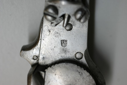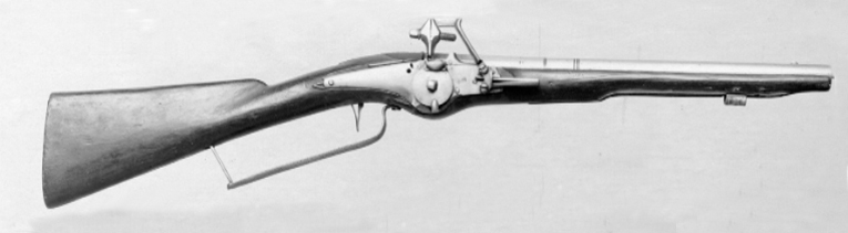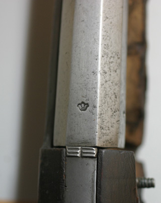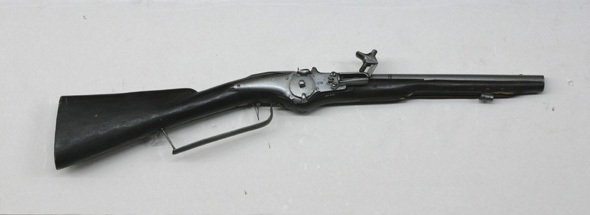 Rund, slätborrad pipa med kantig översida på kammaren. Två tvärband vid kammarens slut. Pipan stämplad vid pipbasen med en krona, på undersidan med ett H. Riktmedel: Siktskåra på svansskruvbladet, spolformigt stolpkorn. Fästning: Två häften, pipa näst med krysskruv underifrån samt två pipstift av stål, ett saknas. Hjullås av västeuropeisk typ med välvd låsbleck och utanpåliggande hjul fäst med studel kl. 6. På låsblecket stämpel: I L B i sköld. Fängpanna med rundad undersida, låg rundad krutskärm. Fängpannelock med rörlig arm. Kantig, odekorerad hane med rak kropp, nedsvängd framtill till stöd mot fjädern. Rak hanhals. Rörlig underkäke, käkskruv med fyrkantigt skruvhuvud. Hanfjäder med rundad utsida, rak studel. Fästning: Tre låsskruvar, varav den främre saknas. Fjäderbelastad avtryckare. Helstock av trä med smäcker fransk-engelsk kolv utan kolvlåda, kindstöd med snidad volut bakom. En profilerad rörka av stål. Rak, sekundär(?) varbygel med rak bakstolpe och svängd framstolpe.