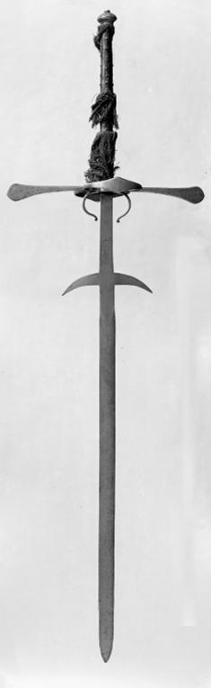 Fäste av stål. Knapp med runt tvärsnitt, tryckt och med i relief rutmönstrad överdel, nedre delen liksom fästets beslag i övrigt med slät yta. Parerstänger långa, raka, platta med vidgade ytterändar. På vardera ut- och insidan vid krysset en större ochen mindre kryssbygel, den större (yttre)med vidgat mittparti. Nedanför krysset på vardera sidan av den oslipade klingbasen en bygel med bakåtböjd ytterände. Kavel, l: ca 425 mm med rundovalt tvärsnitt, klädd med mörkbrunt skinn, fäst med fyra längsgående rader spikar. Runt kaveln fyra kransar av brunaktigt yllegarn, varav en runt överdelen och en runt nederdelen. Klinga rak, lång, flackslipad med ett 215 mm lång, oslipat basparti, ovanför detta två symmetriskt utskjutande, mot klingspetsen böjda hakar, tillsammans liknande en månskära, hakarna likaledes oslipade. Klingan ovanför hakarna oslipad till en längd av ca 85 mm. Svärdet avser att imitera en tvånhandssvärdstyp, vanlig under 1500-talet.