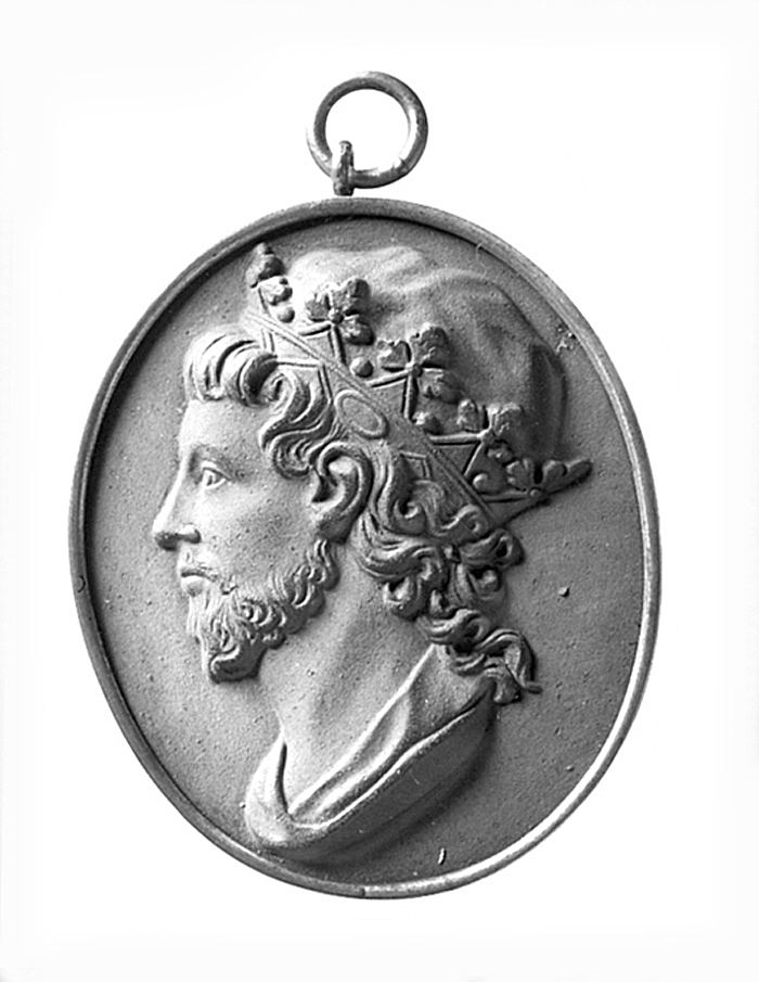 Oval, med plana sidor. på framsidan en bröstbild i profil åt vänster i hög relief. Bilden föreställande en konung. Håret lockigt, halvlångt, mustascher och skägg vågiga; på huvudet en krona med fem synliga bladspetsar.