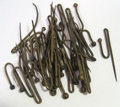 24 stycken. Av mjukare gulmetall. Rak kropp, till hälften dubbelvikt och svängd uppåt med cirkulärt tvärsnitt. Nedåt spetsig ände och uppåt kulformig knopp. Varierande längder, 109-69 mm, varierande vikt 6-3 g.